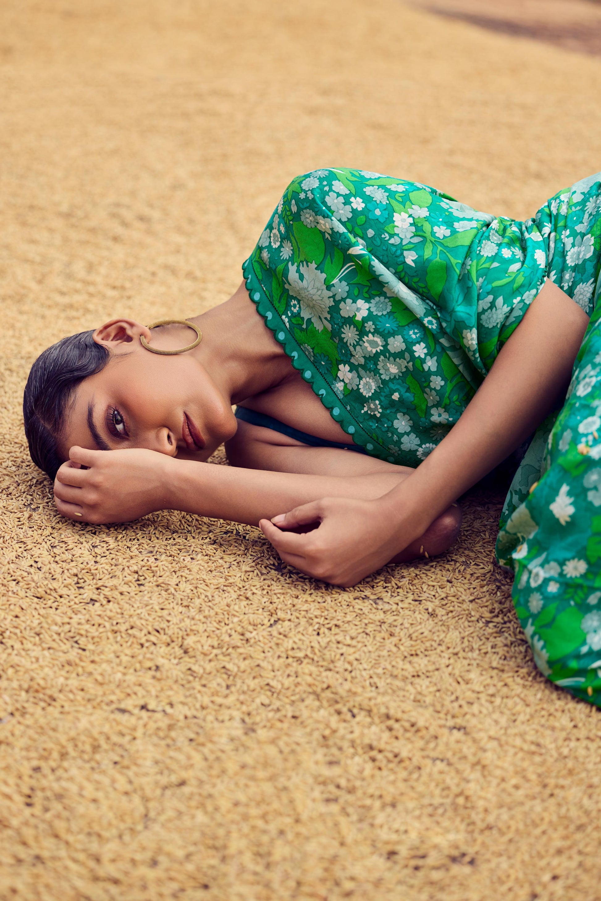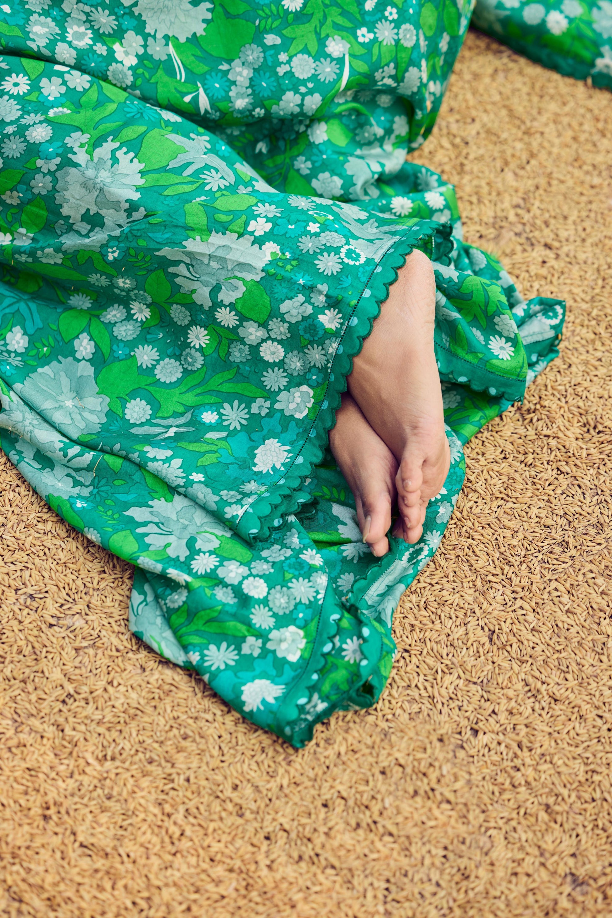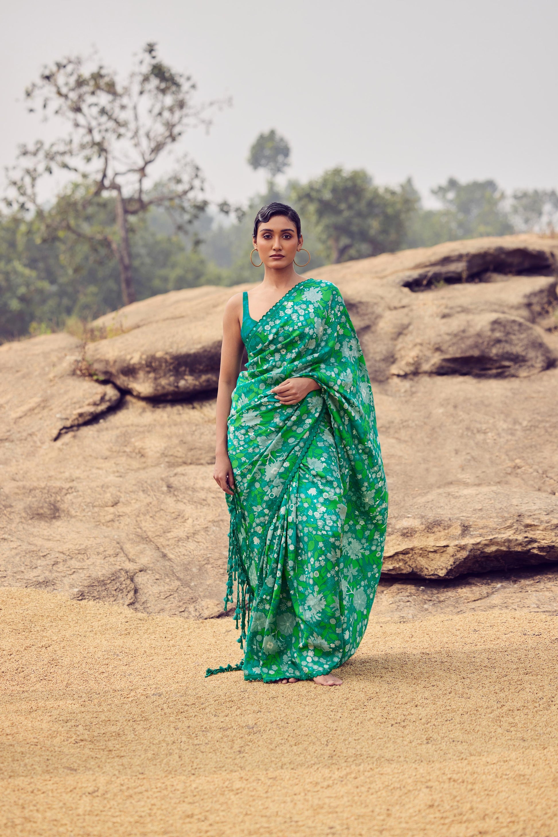 Hand woven, hand printed green mulberry silk saree with fringe detail, paired with embroidered blouse.