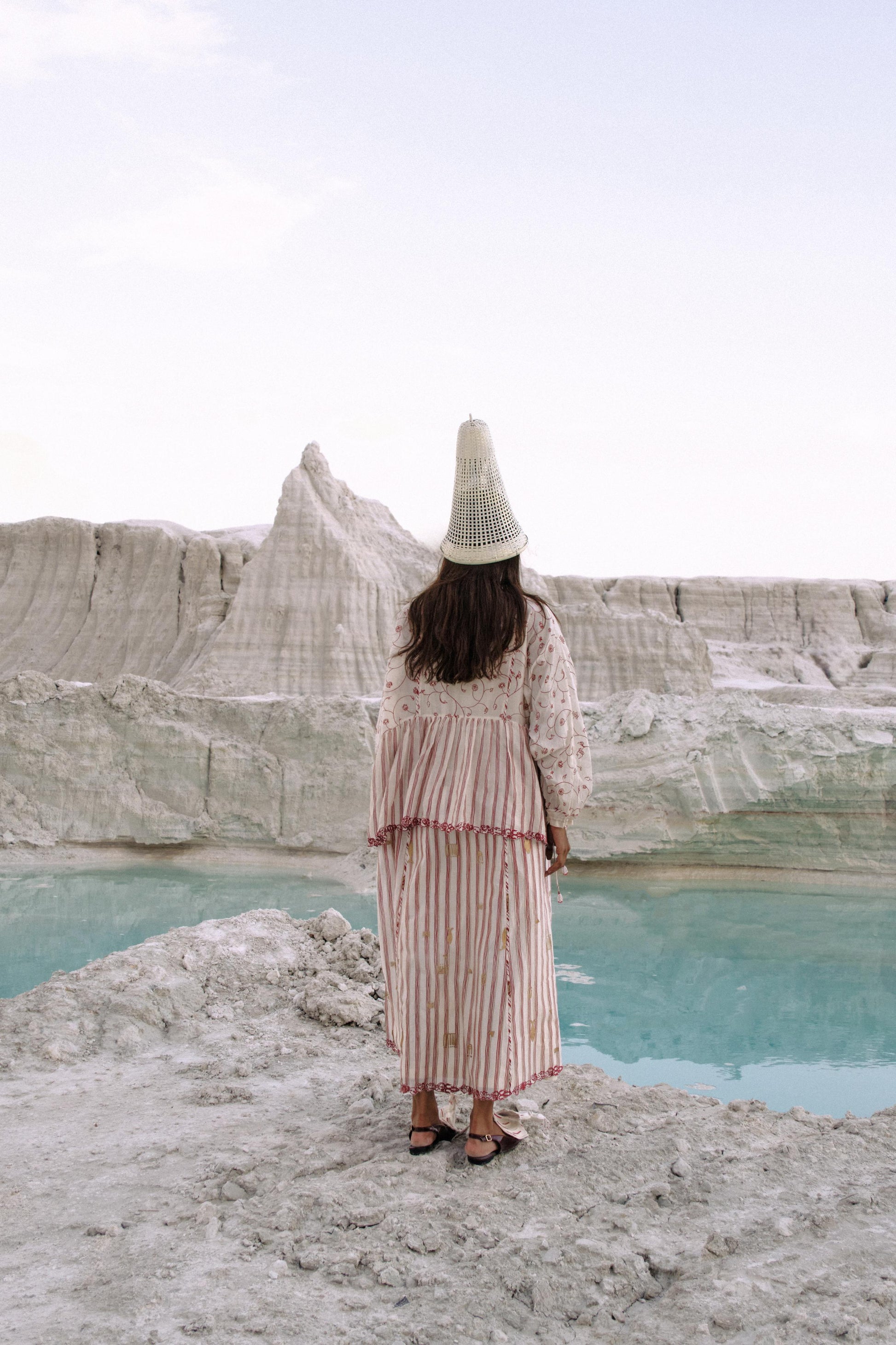 A two-tiered dress in hand-screen-printed cotton silk, the Hintha Gathered Dress combines delicate artistry with effortless movement. The embroidered hem and dolman sleeves with tie-ups add artisanal charm, while the body flows into gathered panels and a loose, skirt-like second layer. Soft tiers drape gracefully over the body, accentuating a fluid, airy silhouette. Hours of careful labour and intricate detailing render this dress a piece of refined craftsmanship, perfect for a day-to-evening transition.