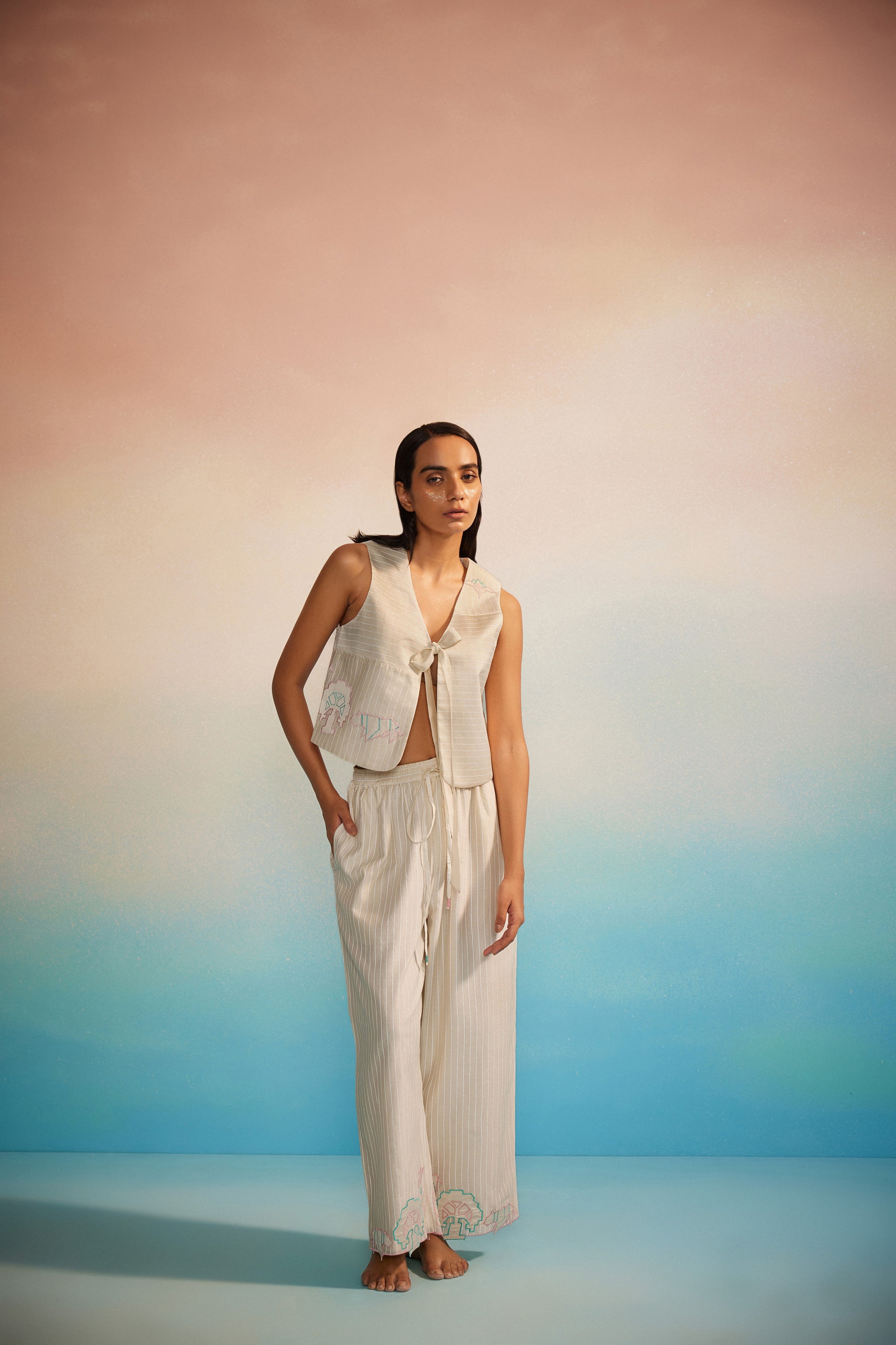Flowing and elegant, the Hiroko Pleated Dress features soft side pleats and intricate appliqué embroidery. Paired with the relaxed Shiori appliqué Pants, detailed with subtle appliqué at the hem, this set balances graceful movement with refined comfort.