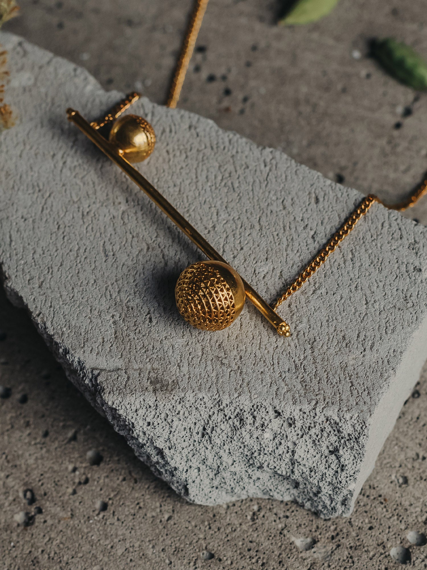 A contemporary, fun bar-pendant ornamented with gorgeous filigree globes. Sewn on a minimal chain that keeps it classy. Recipe for the perfect day-to-evening necklace.