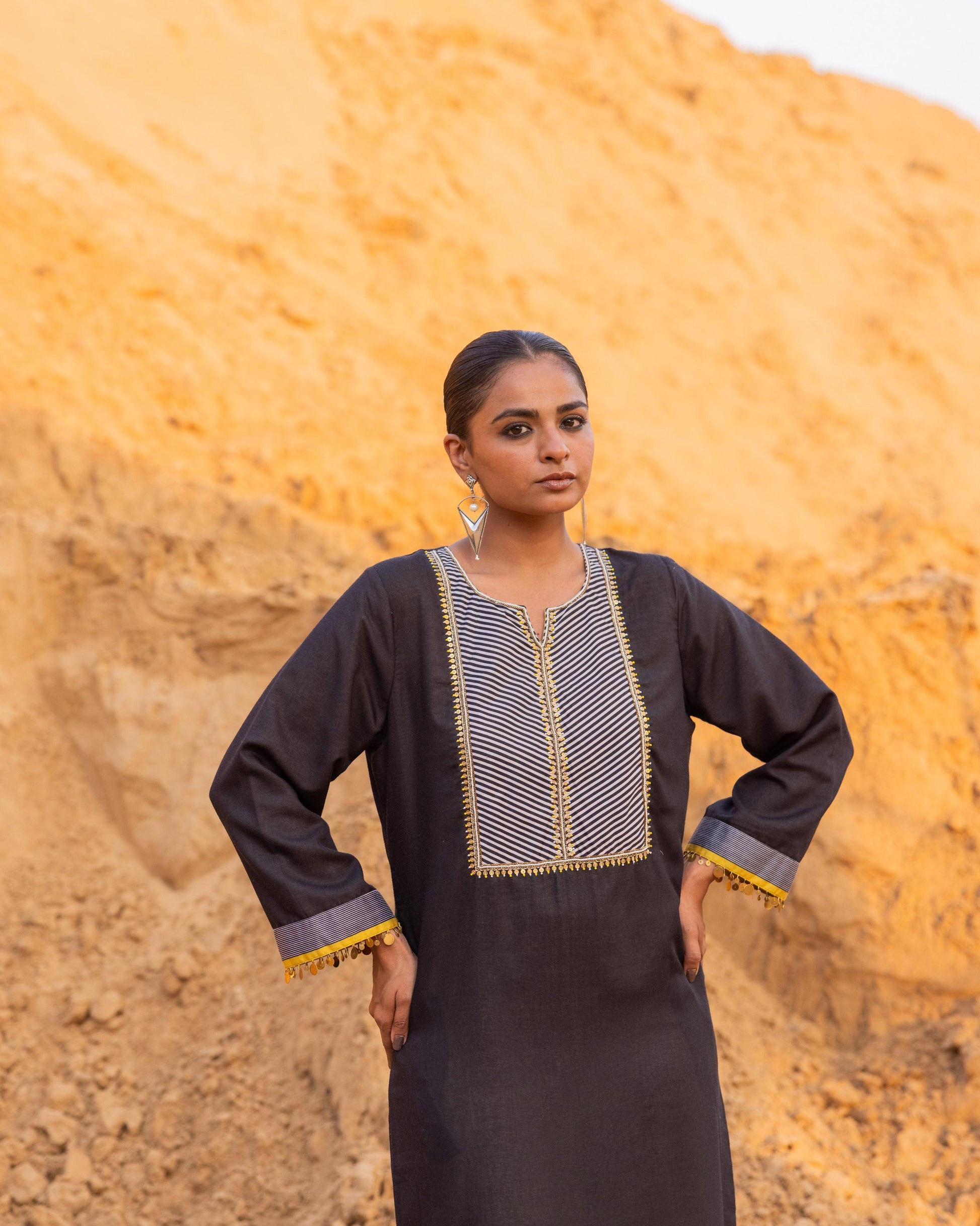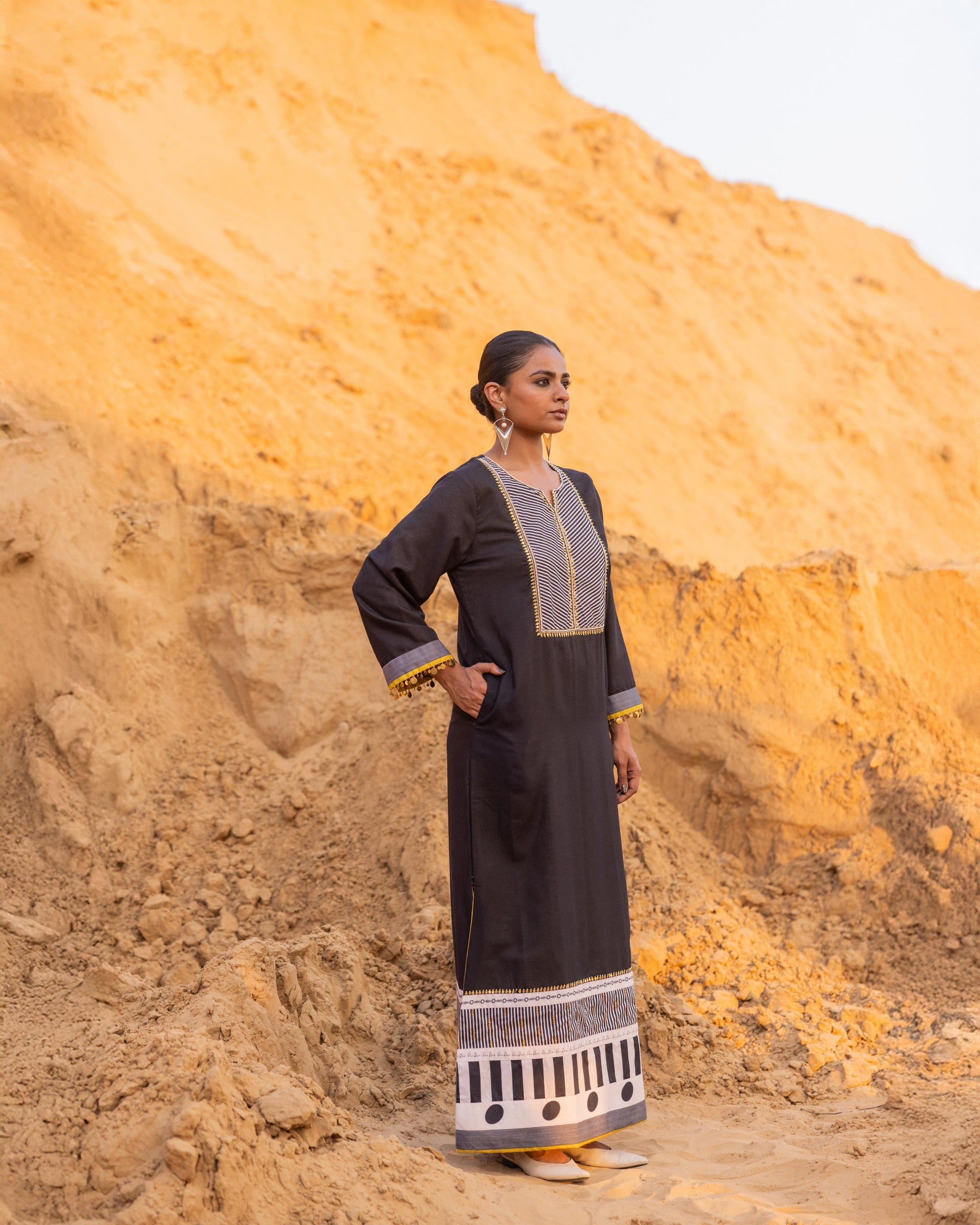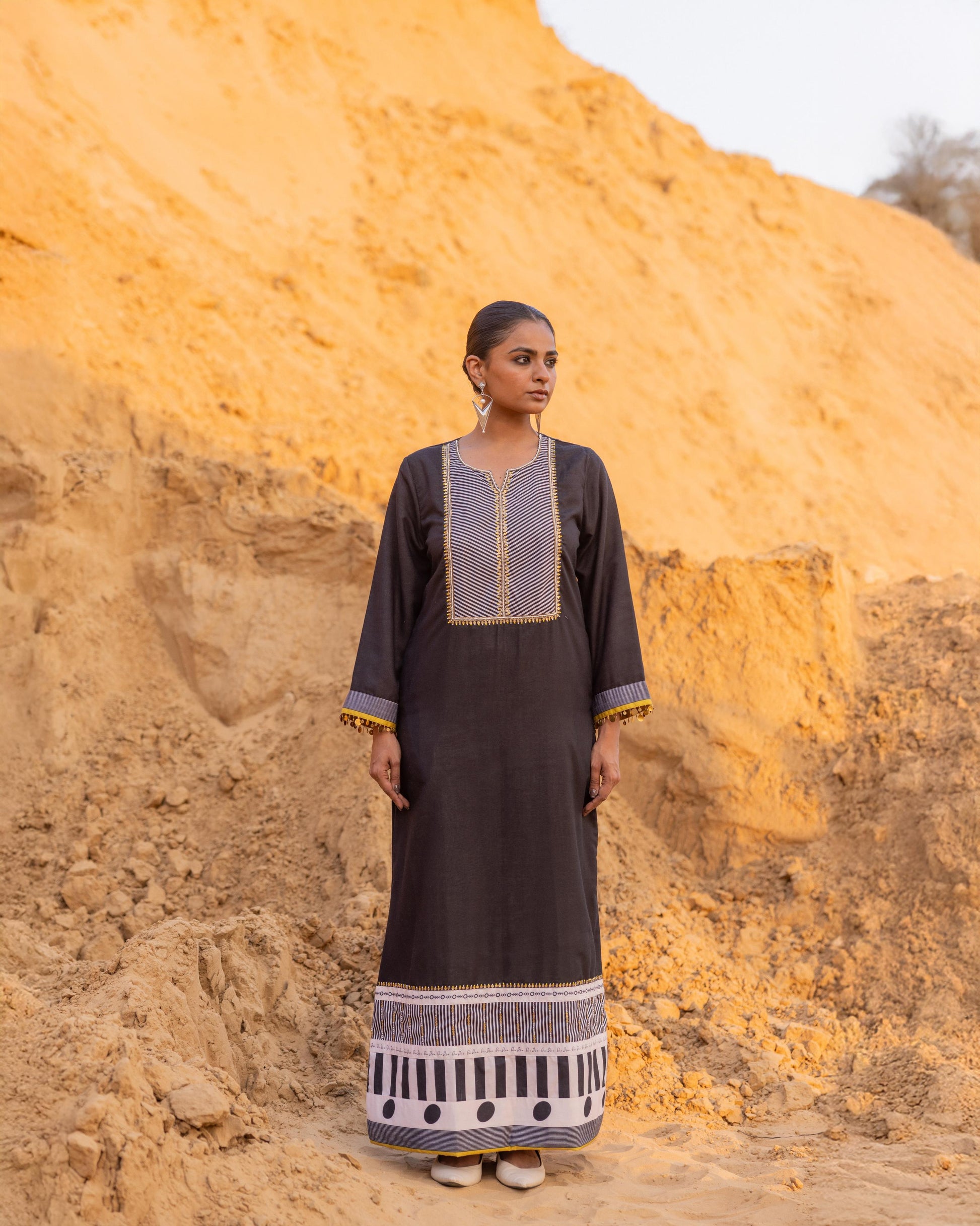 A statement dress from our winter collection, beautifully patched with our signature prints. The neckline and borders feature intricate hand embroidery, enhanced with delicate metal coin details at the sleeves. Crafted with care and precision, this piece stands out for its artistry and timeless elegance — perfect for festive evenings and special gatherings.