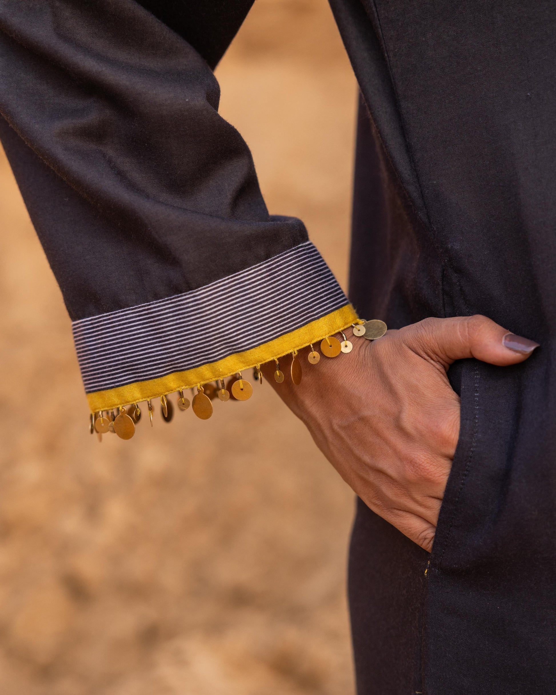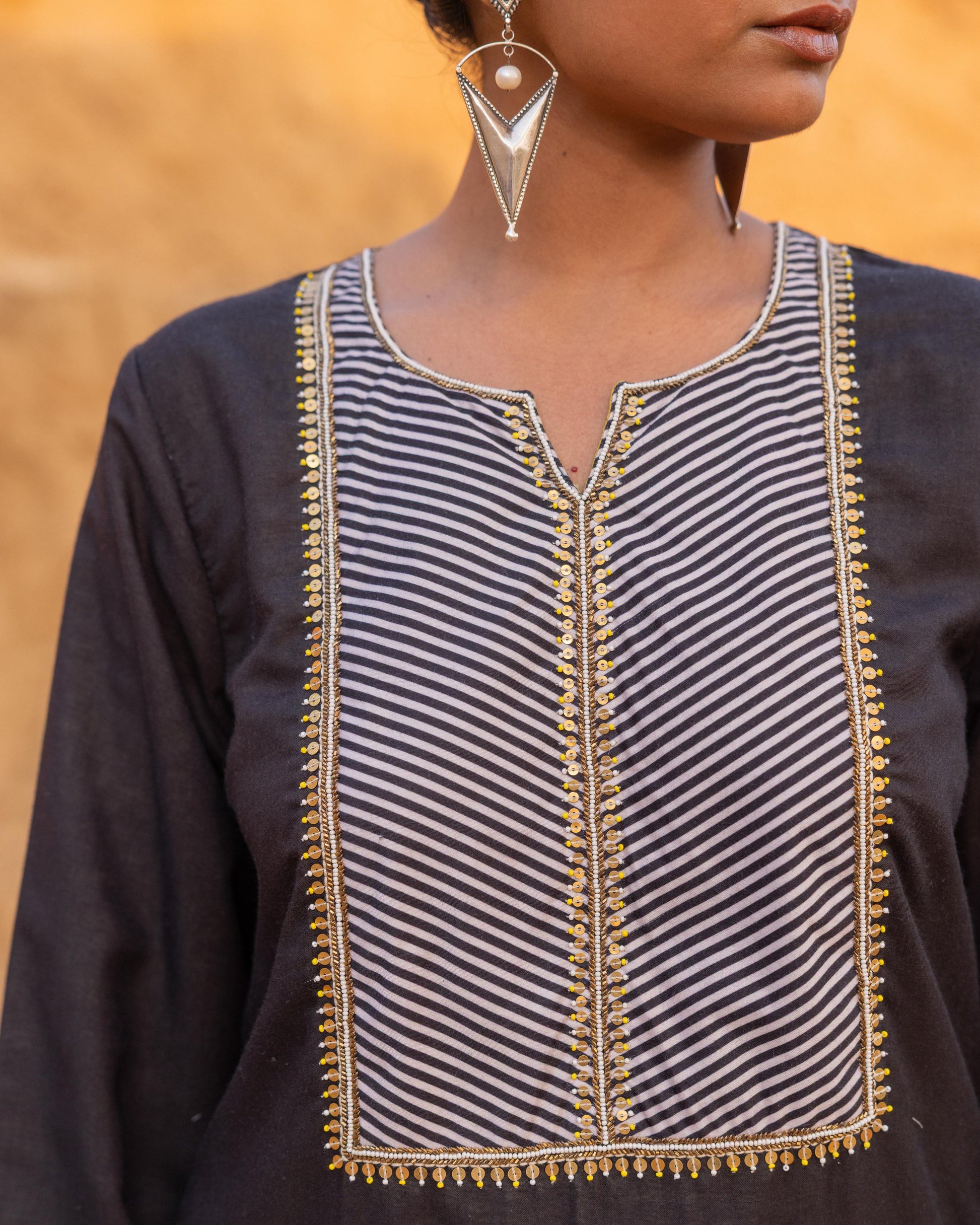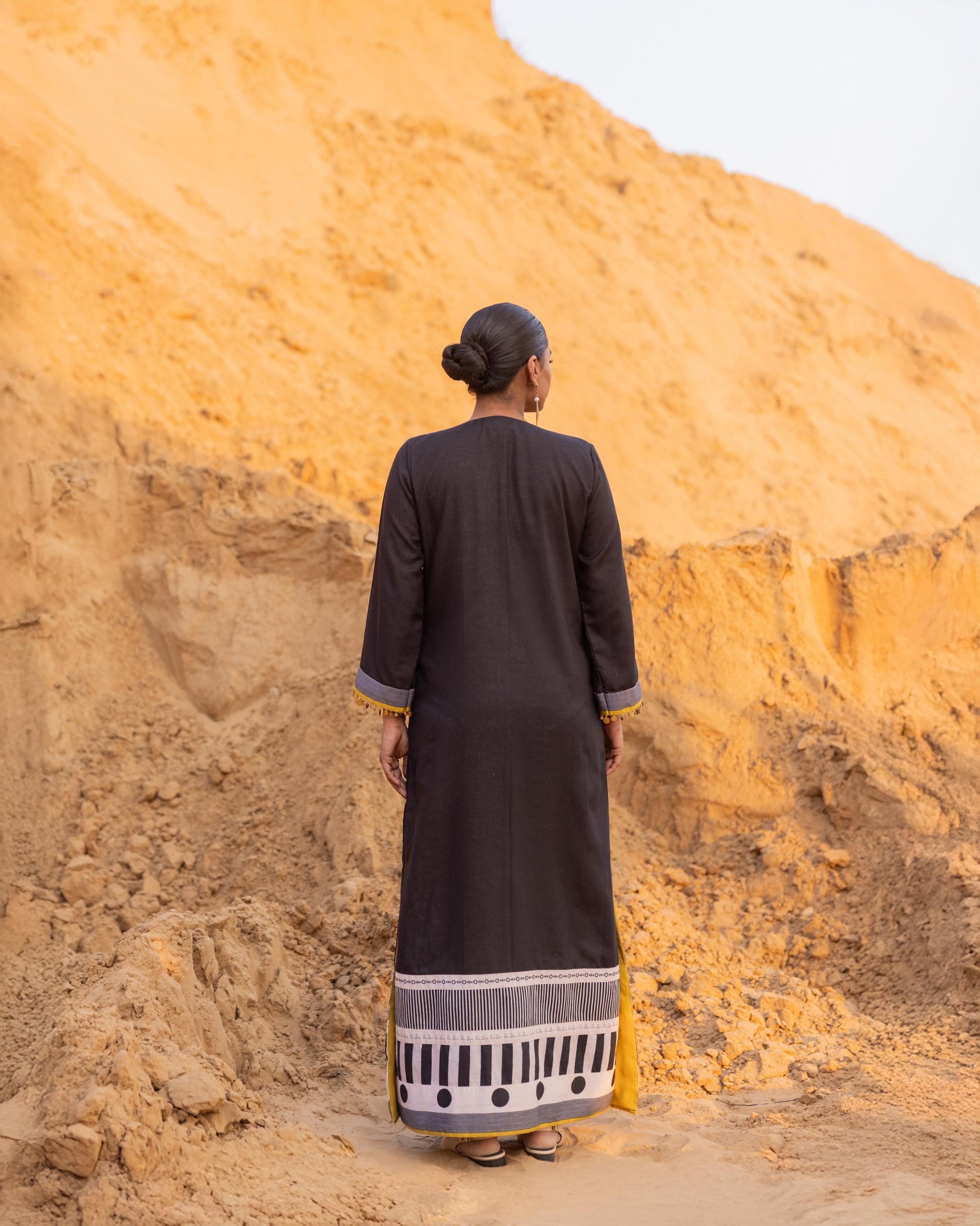 A statement dress from our winter collection, beautifully patched with our signature prints. The neckline and borders feature intricate hand embroidery, enhanced with delicate metal coin details at the sleeves. Crafted with care and precision, this piece stands out for its artistry and timeless elegance — perfect for festive evenings and special gatherings.