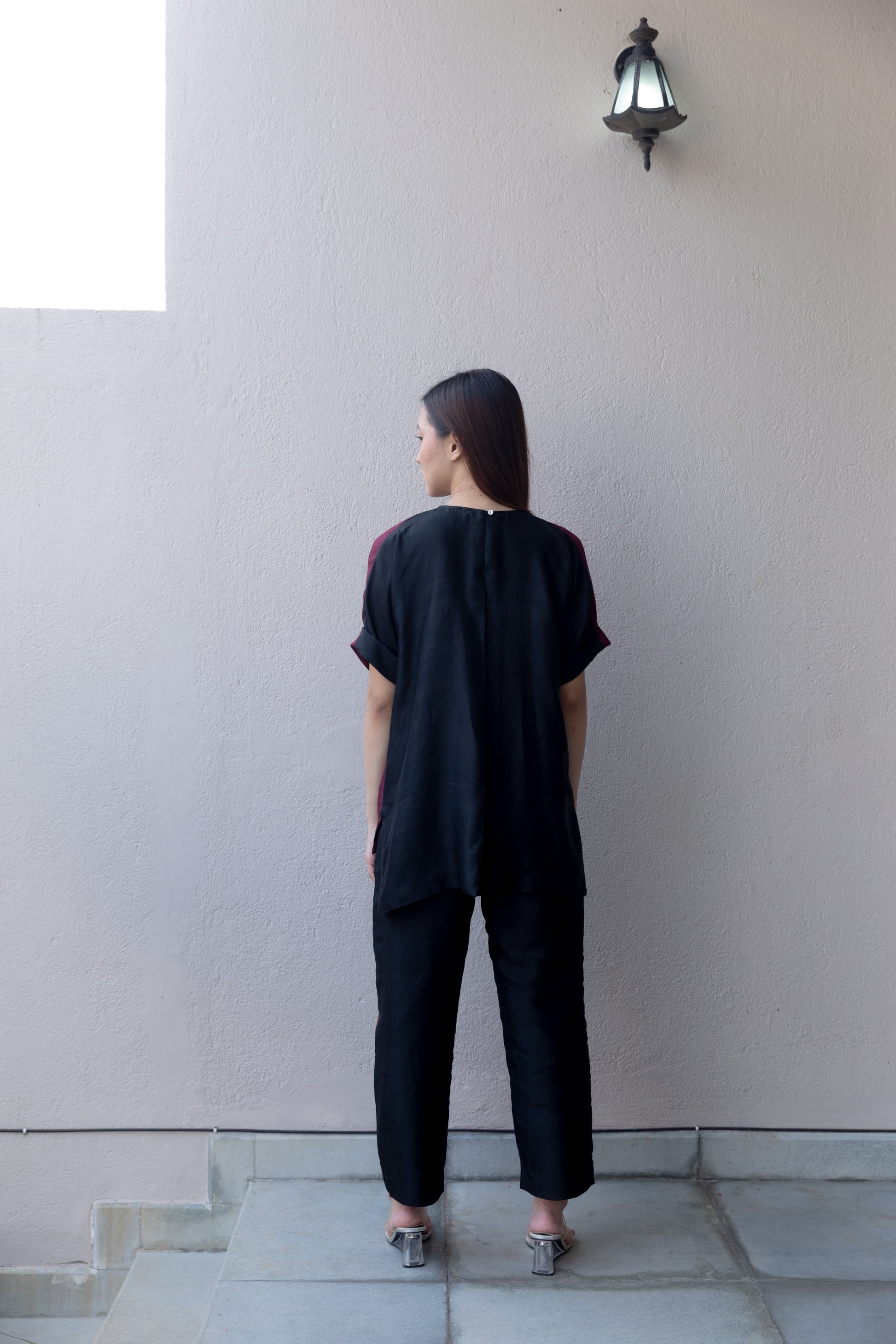Block printed handwoven silk co-ord set with metal sequin