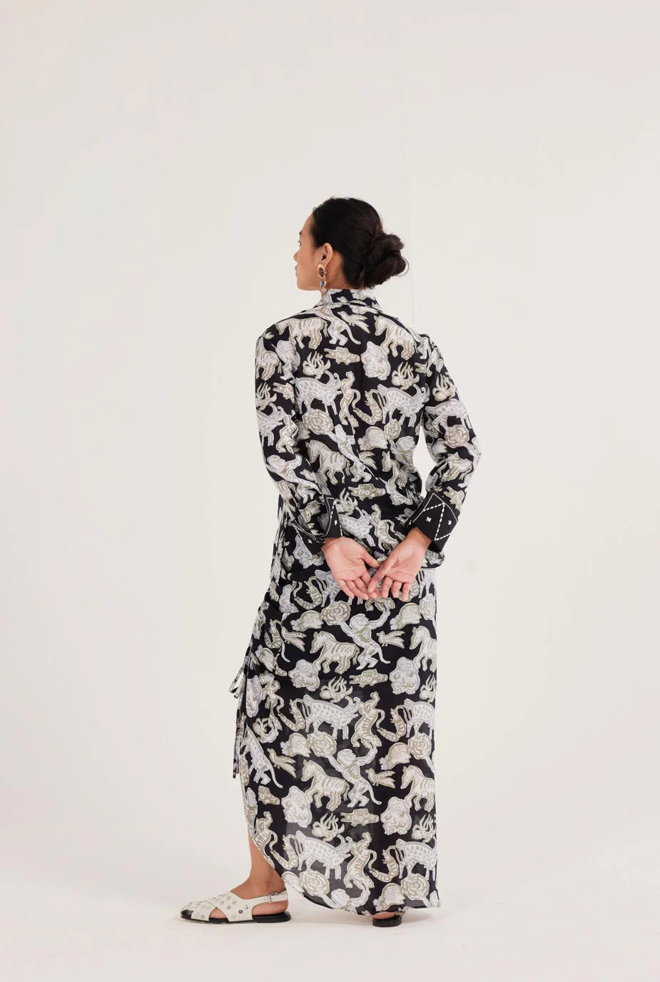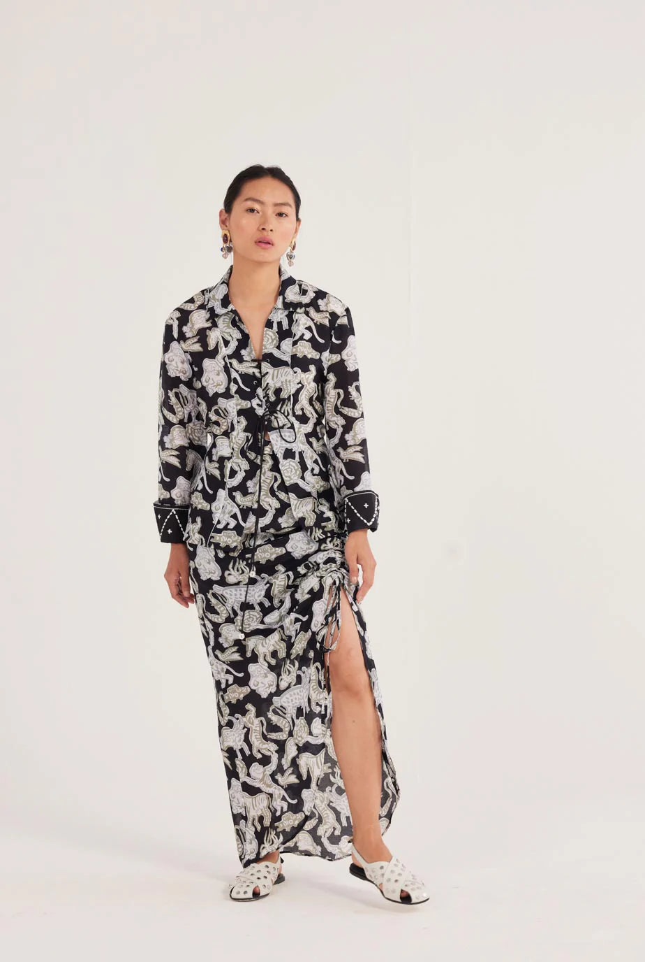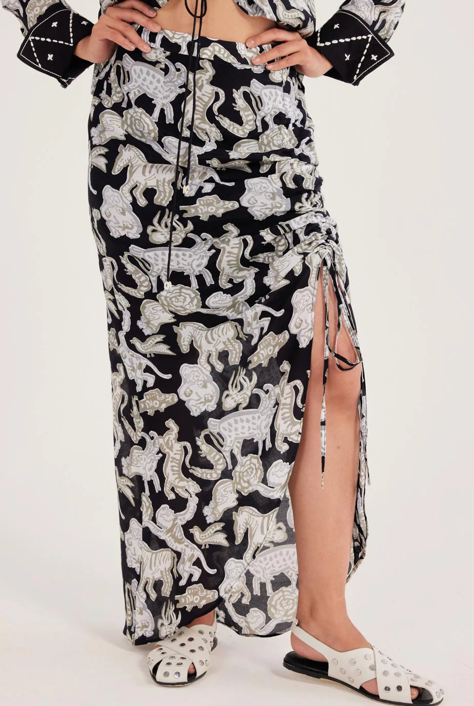 This vibrant skirt shows off curves in the right places. It is cut from lightweight muslin and hand printed in our bold animal print which features an adjustable ruching effect that falls to an asymmetric hem. You can adjust the length of the skirt as you like, shorter for nights out or beach days and maxi length for comfort.