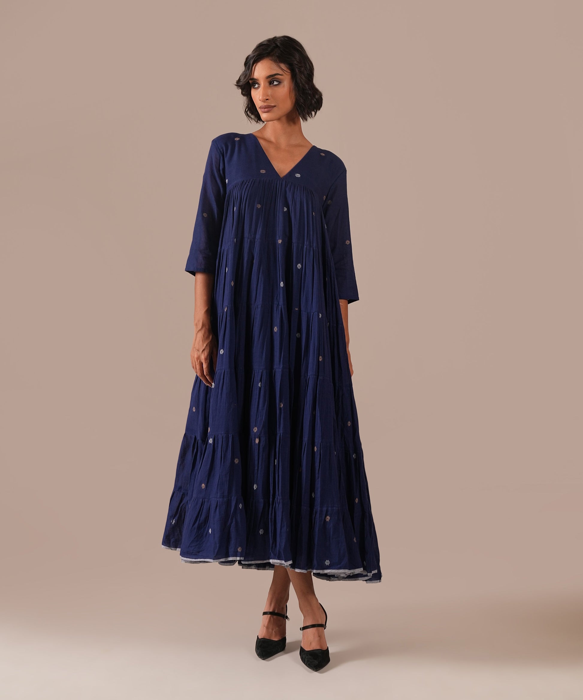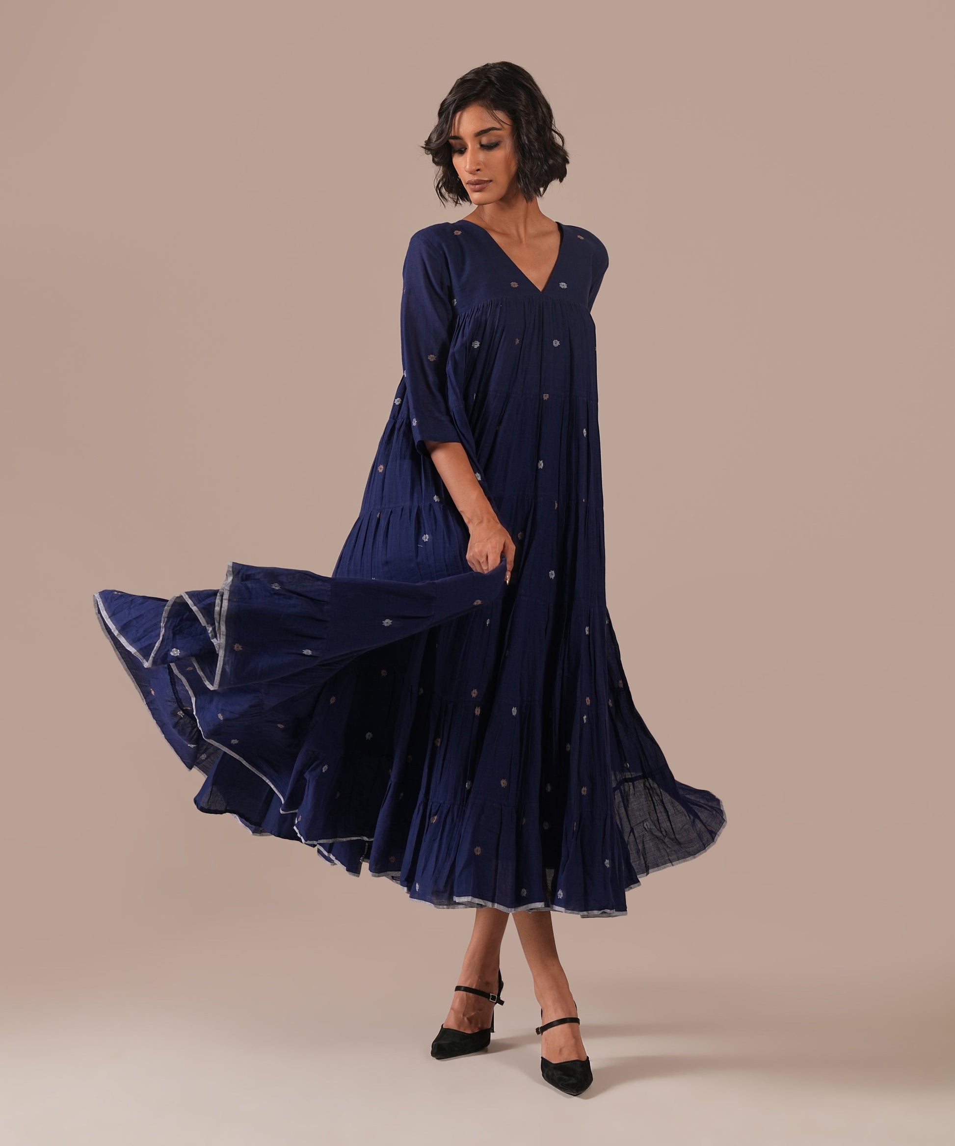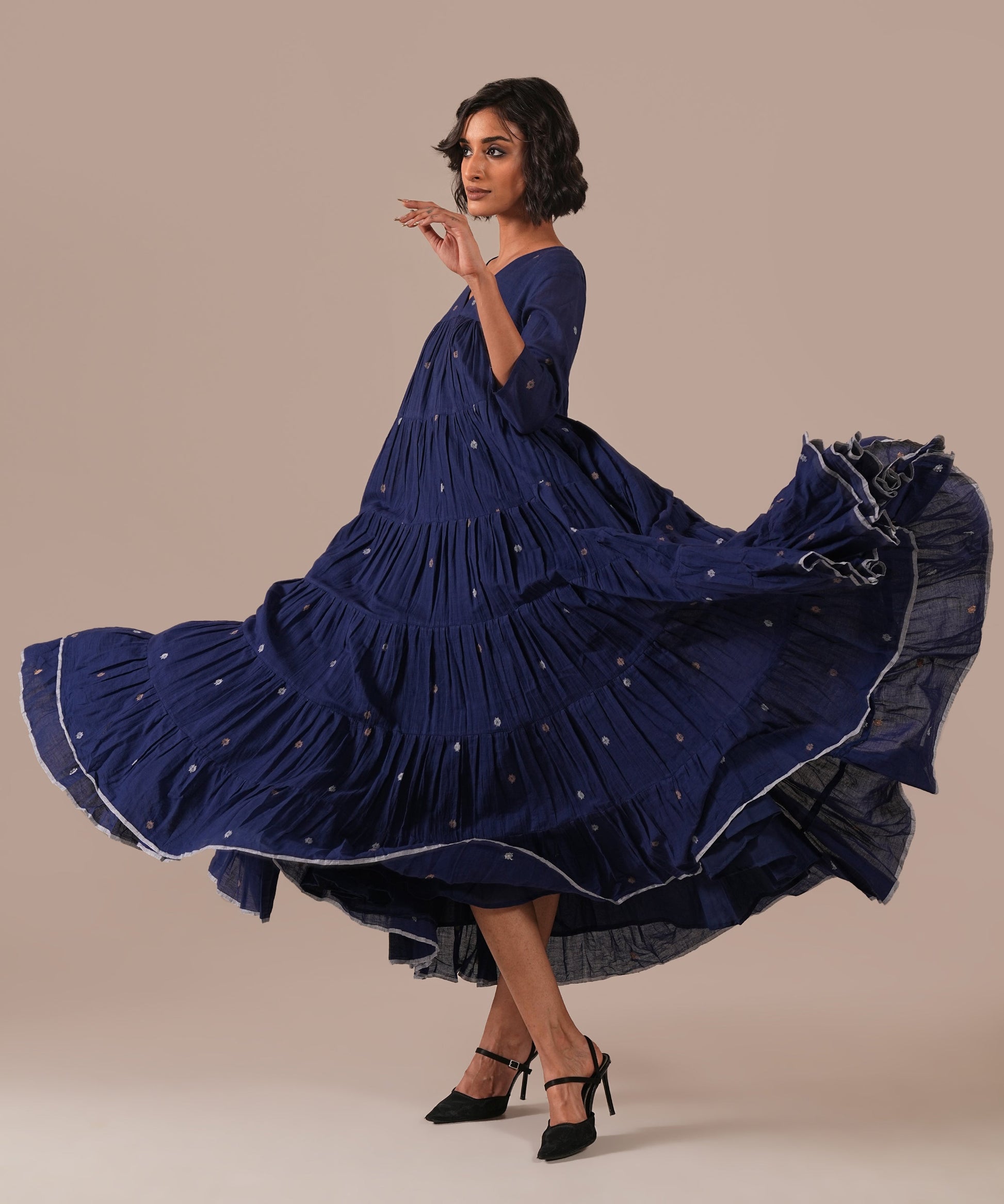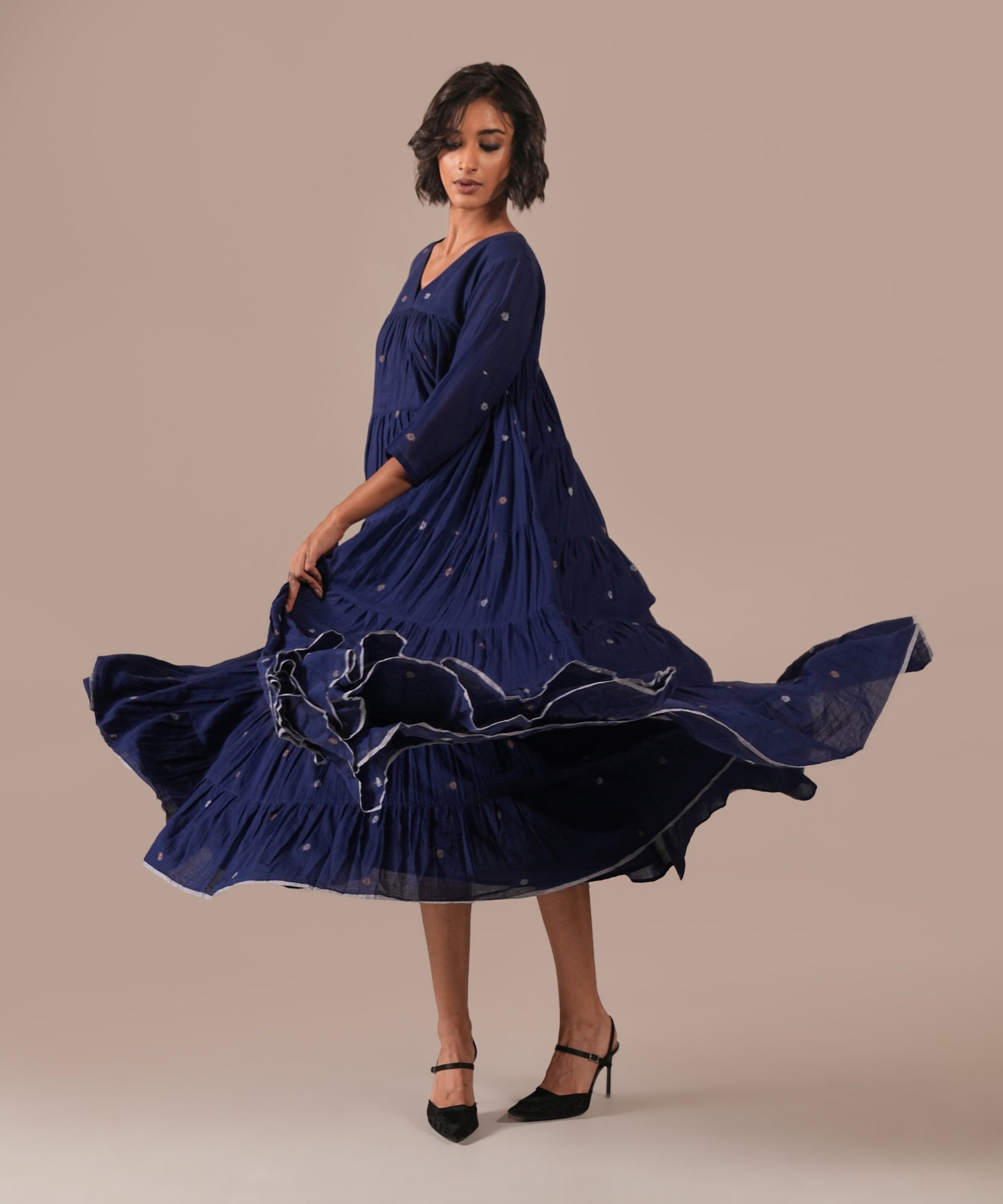 An elegant Jamdani swing dress designed to dazzle, featuring a V-neck, and 3/4th sleeves. With a romantic, voluminous silhouette crafted from 9 to 10 meters of gathers, this dress flows beautifully, making every twirl and photograph a statement. Perfect for capturing the full drama and movement of your favourite moments.