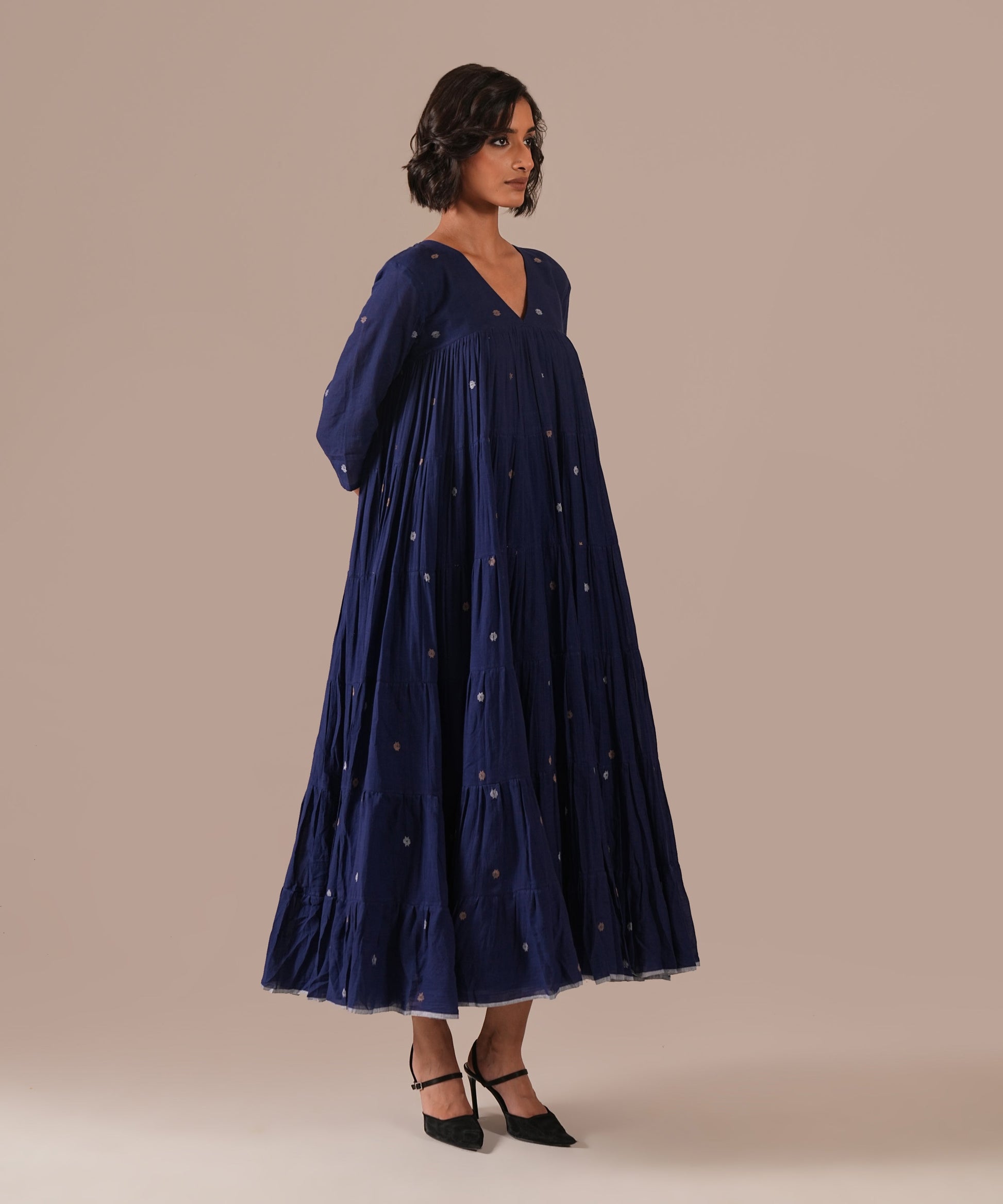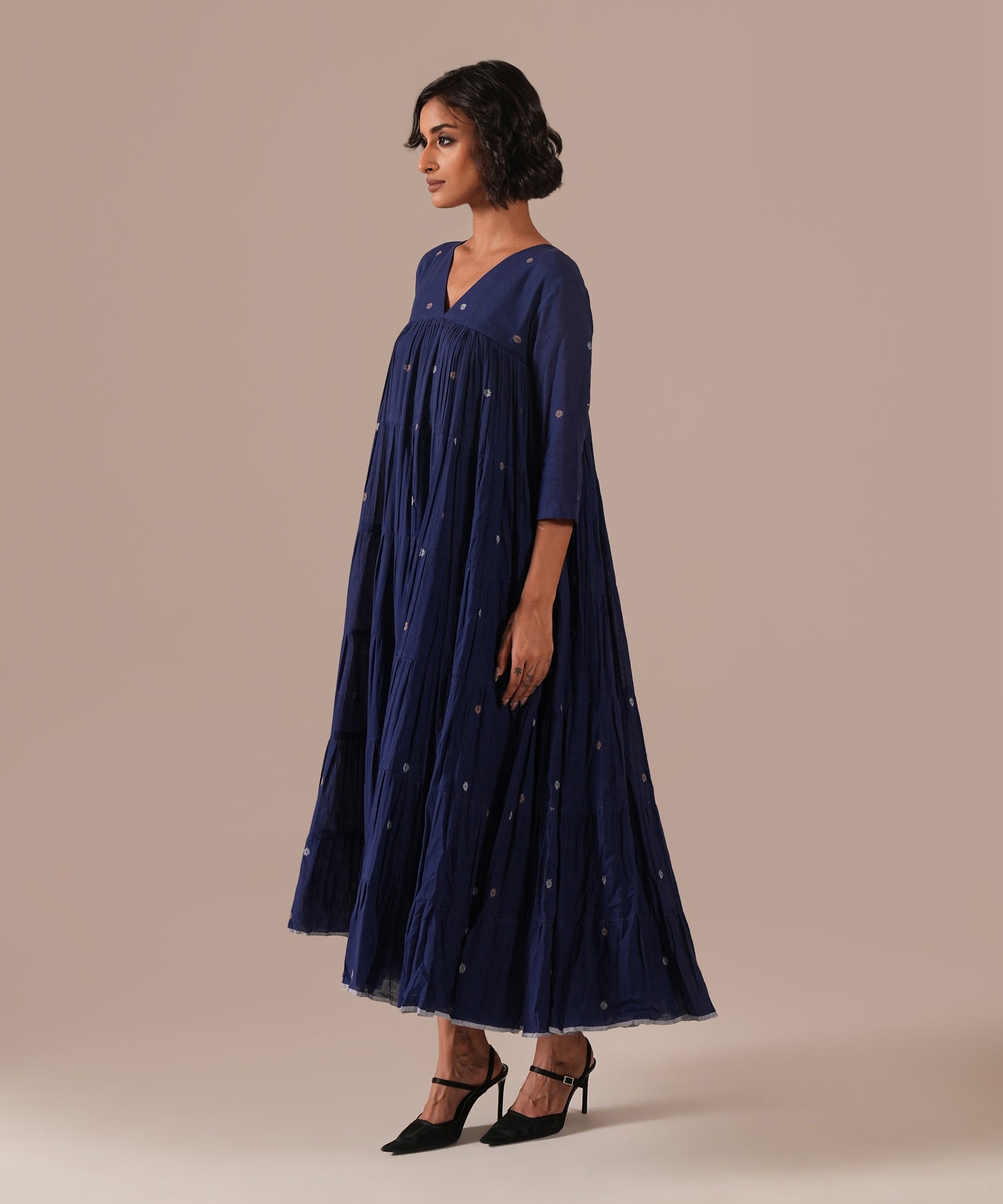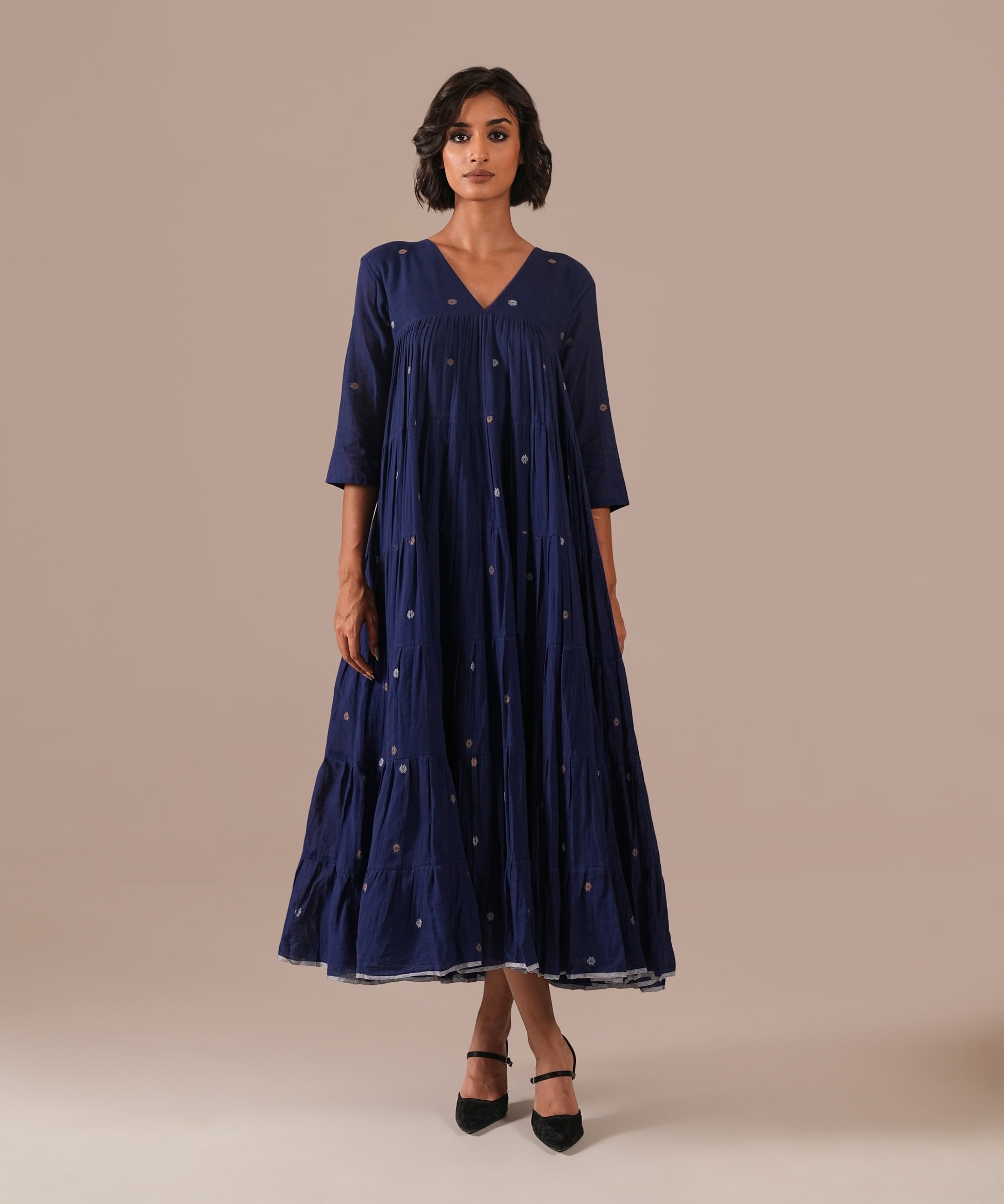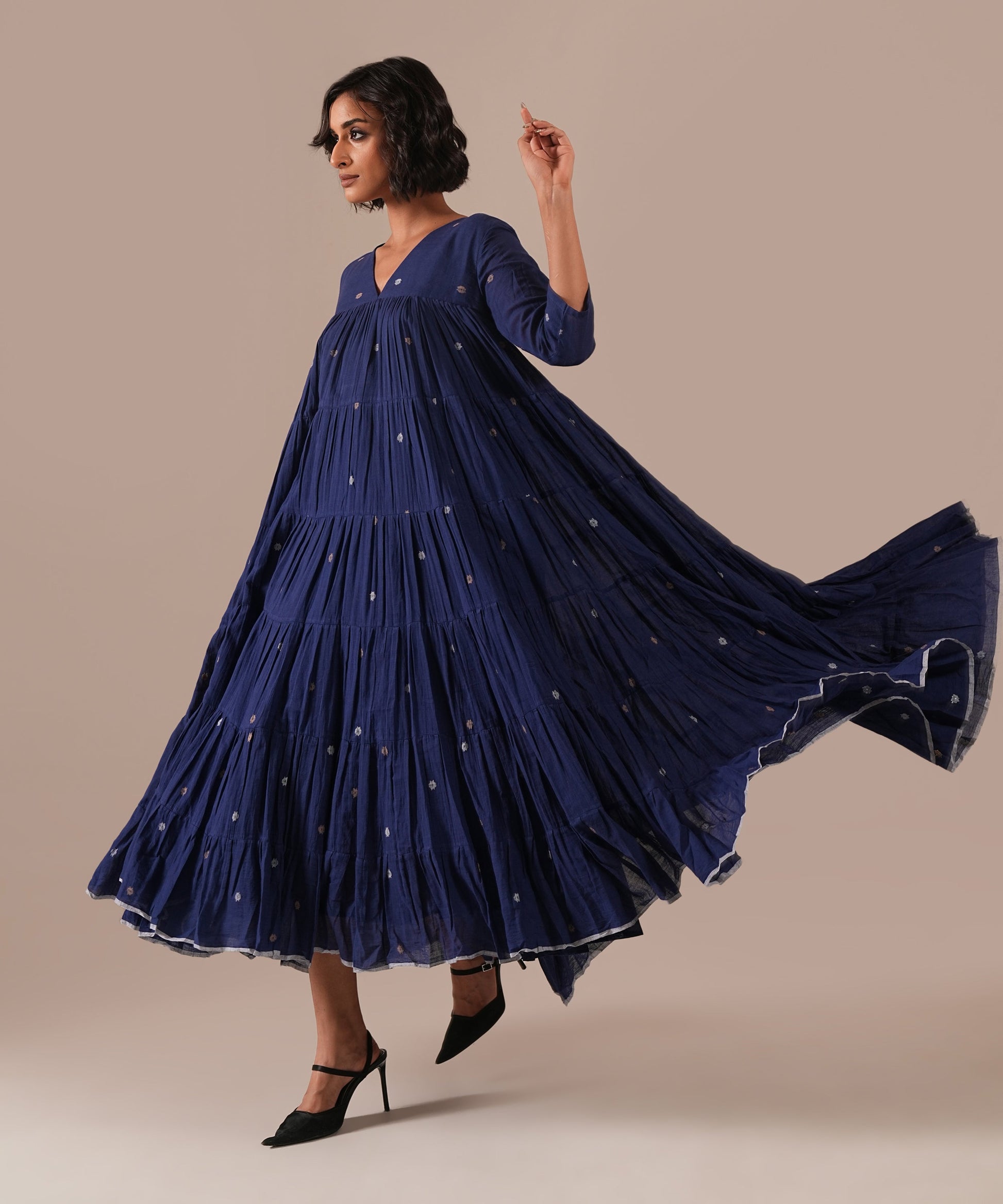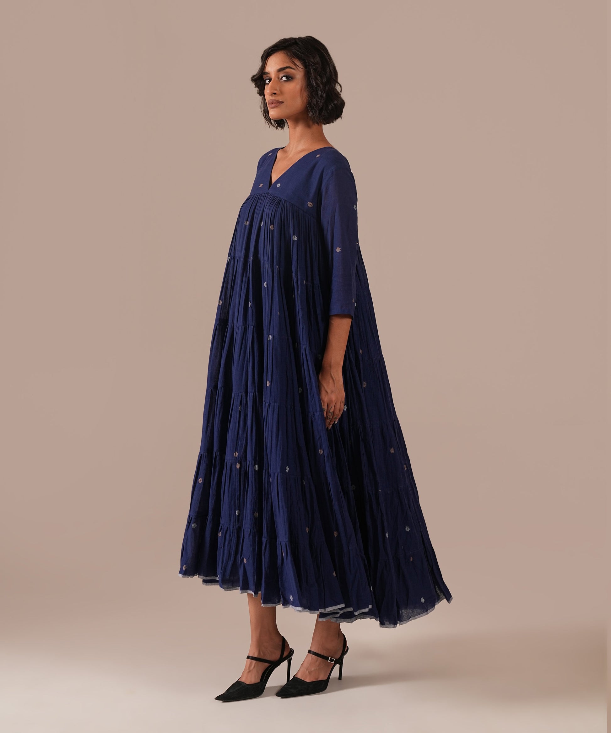 An elegant Jamdani swing dress designed to dazzle, featuring a V-neck, and 3/4th sleeves. With a romantic, voluminous silhouette crafted from 9 to 10 meters of gathers, this dress flows beautifully, making every twirl and photograph a statement. Perfect for capturing the full drama and movement of your favourite moments.
