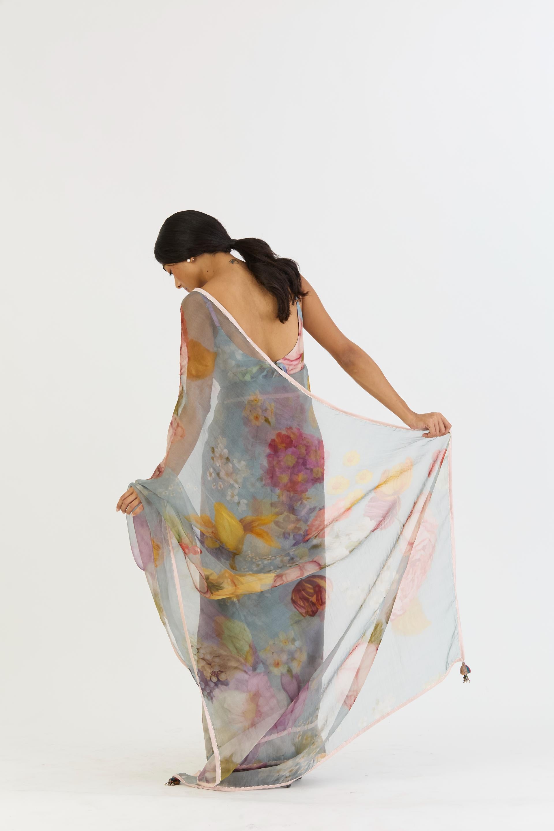 The saree is a masterpiece of craftsmanship, seamlessly blending pure silk and pure organza textiles. Delicately finished with dori piping all around, it exudes elegance and sophistication. Adorned with a tassel bunch on the pallu