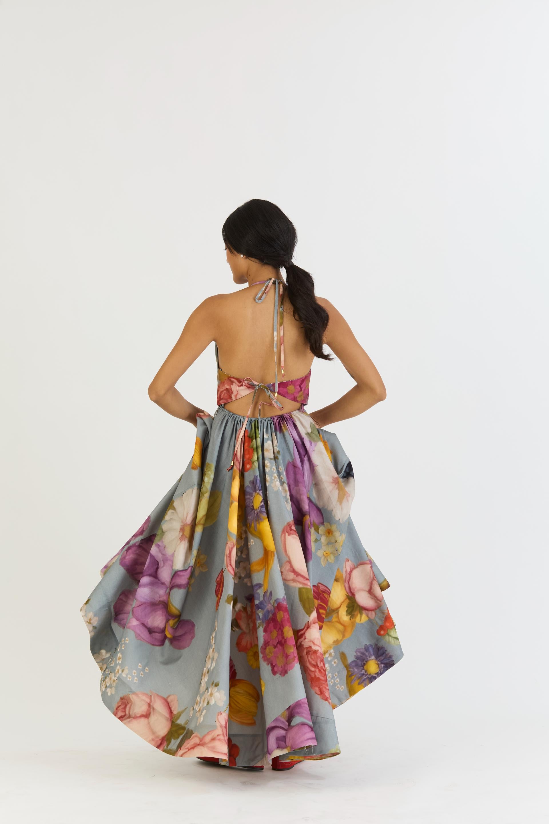 This elegant piece features a halter neck with stylish neck and back tie-ups, ensuring a custom fit. The waistline is accentuated with gathered skirt detailing, while a convenient pocket is seamlessly attached on the right side.