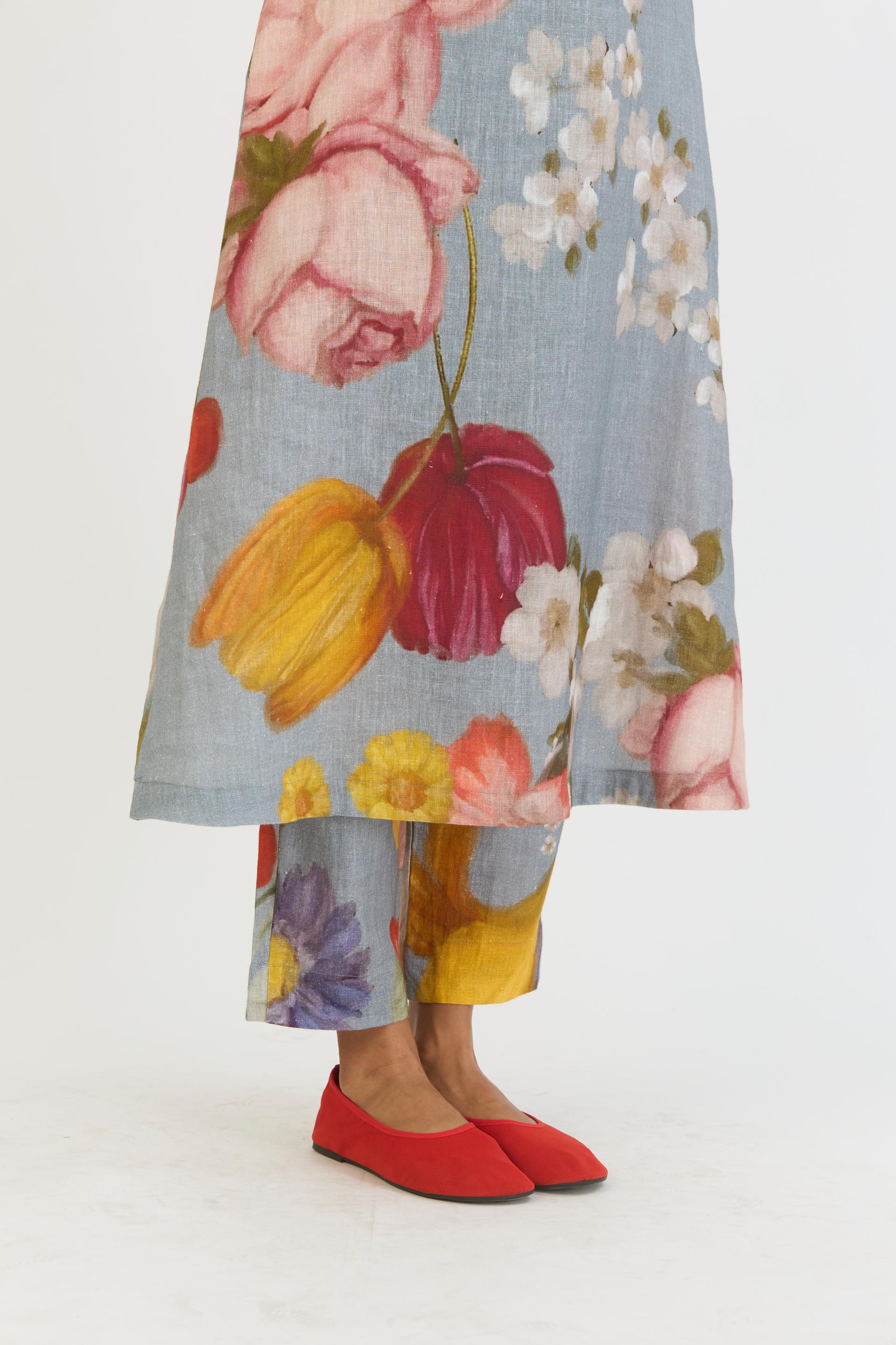 The kurta features a contemporary zero neckline with a keyhole detail at the back and convenient side pockets for added functionality. Paired with matching pants in the same elegant print, this set is perfect for any occasion. The pants are designed with practical side pockets, back elastication, and front drawstrings for a customizable fit.