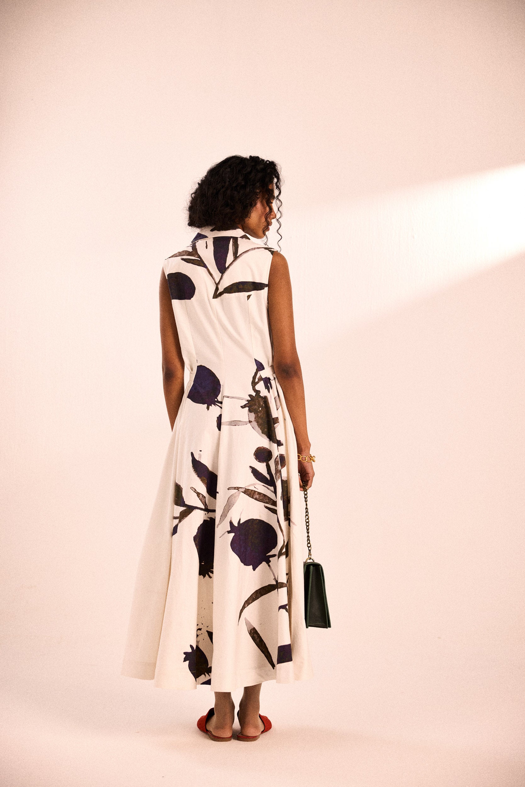 A statement dress crafted in cotton twill, featuring an expressive artsy print in deep ink tones against an ivory base. Designed with a structured yet flowing silhouette, it includes a tailored collar, fitted bodice with concealed zip, and a flared skirt with delicate button details at the waist.