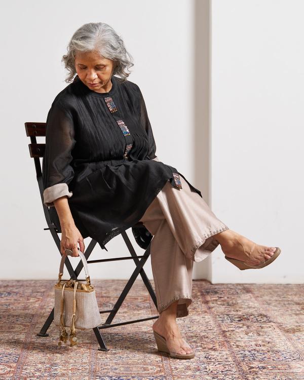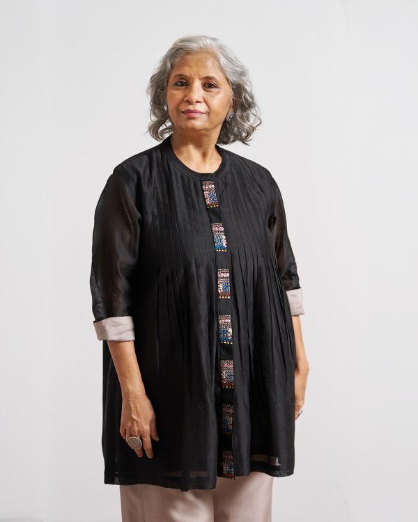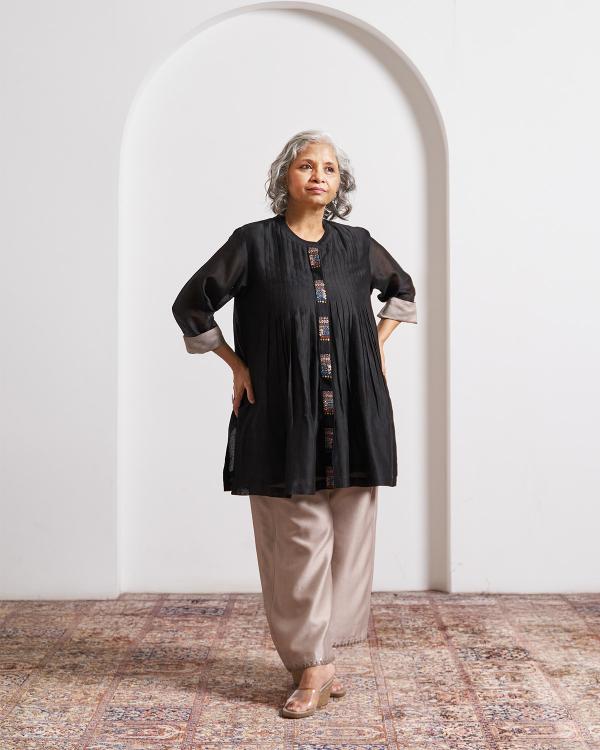 Elegant. Effortless. Enduring. Crafted in lustrous silk chanderi, this black top is a study in timeless sophistication. The front patch is delicately highlighted with gota patti handwork and fine pintuck detailing, adding subtle texture and shimmer to its understated silhouette.