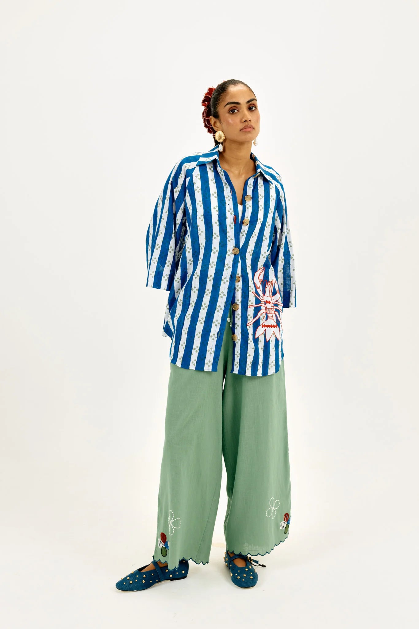This boxy button-down is equal parts playful and polished. Featuring hand-blocked vertical stripes and a bright red lobster appliqué, it’s got wide sleeves and a relaxed drop-shoulder fit. A must-have for when basics get boring.