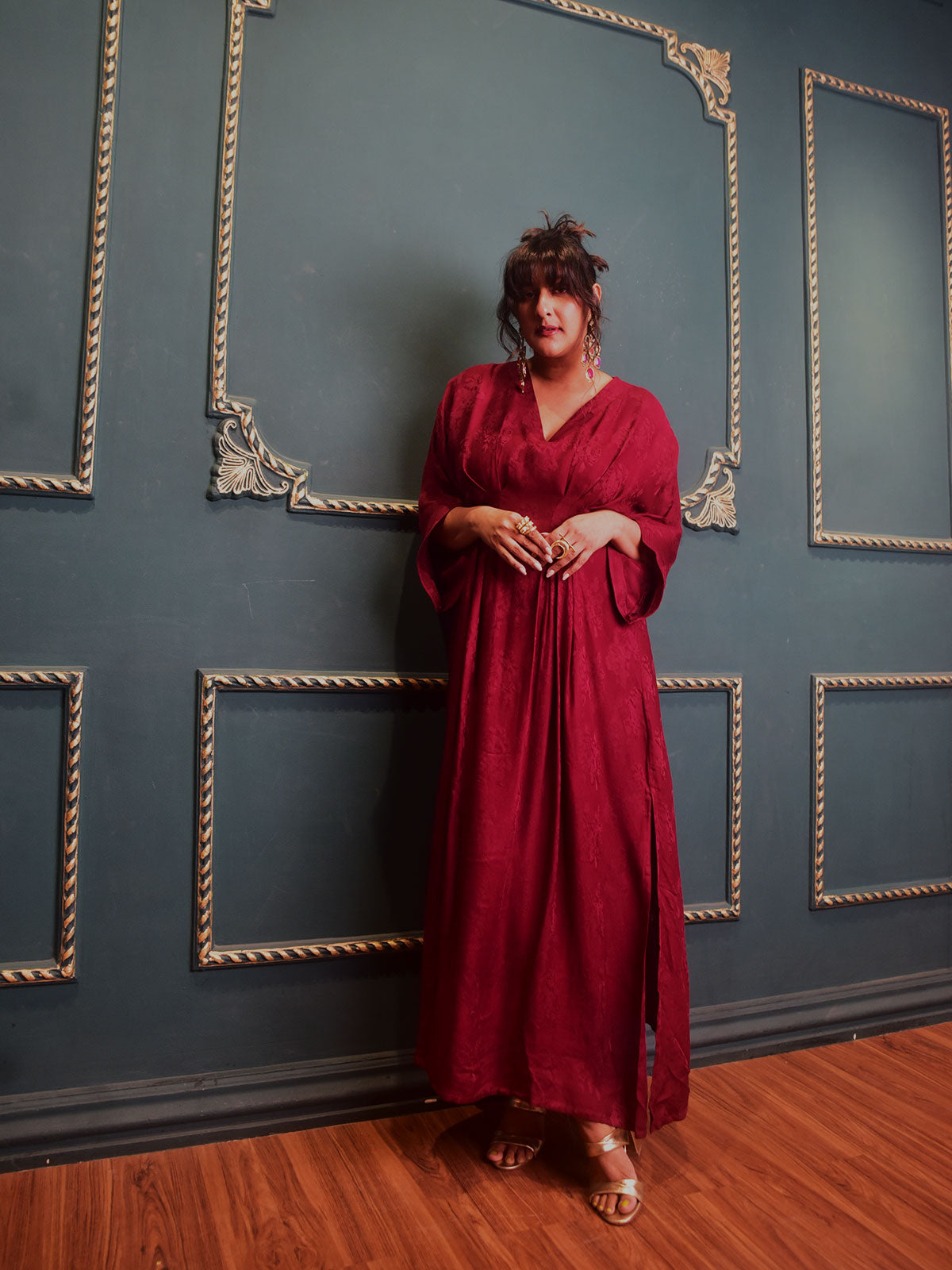 Cut in our exclusive rich maroon viscose modal jacquard fabric, with a woven pattern and elevated sheen corset dress with loose fitted sleeves which features four pleats in the front and back of the waistline.