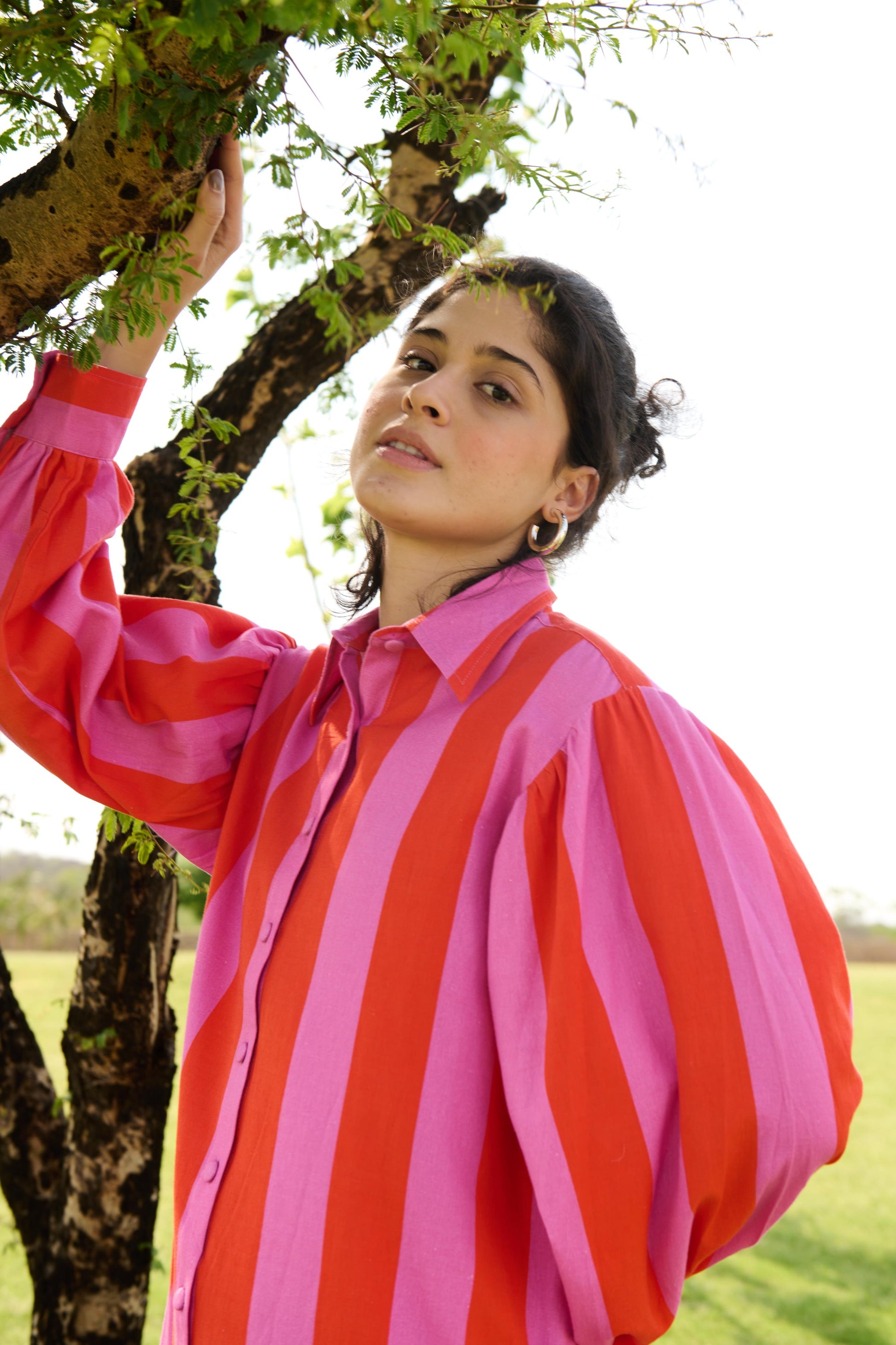 The Iris coord set is crafted with our linen cotton button down long tunic in our green bubblegum stripe print paired with pyjama pants.