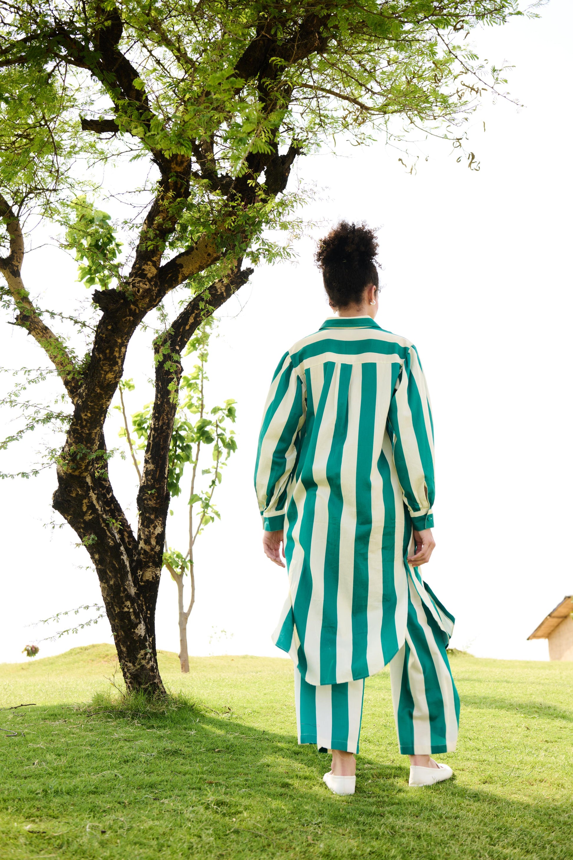 The Iris coord set is crafted with our linen cotton button down long tunic in our green stripe print paired with pyjama pants.