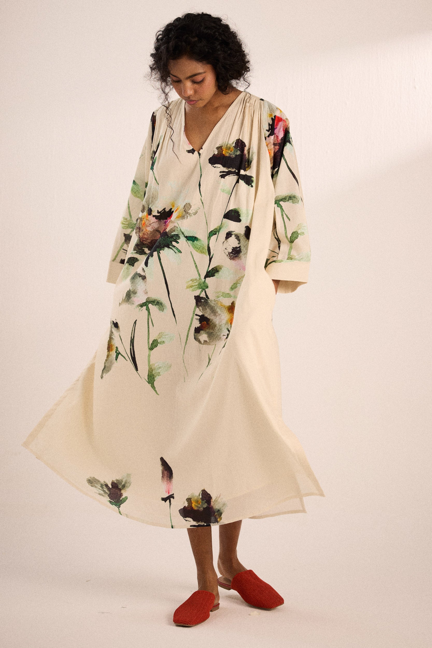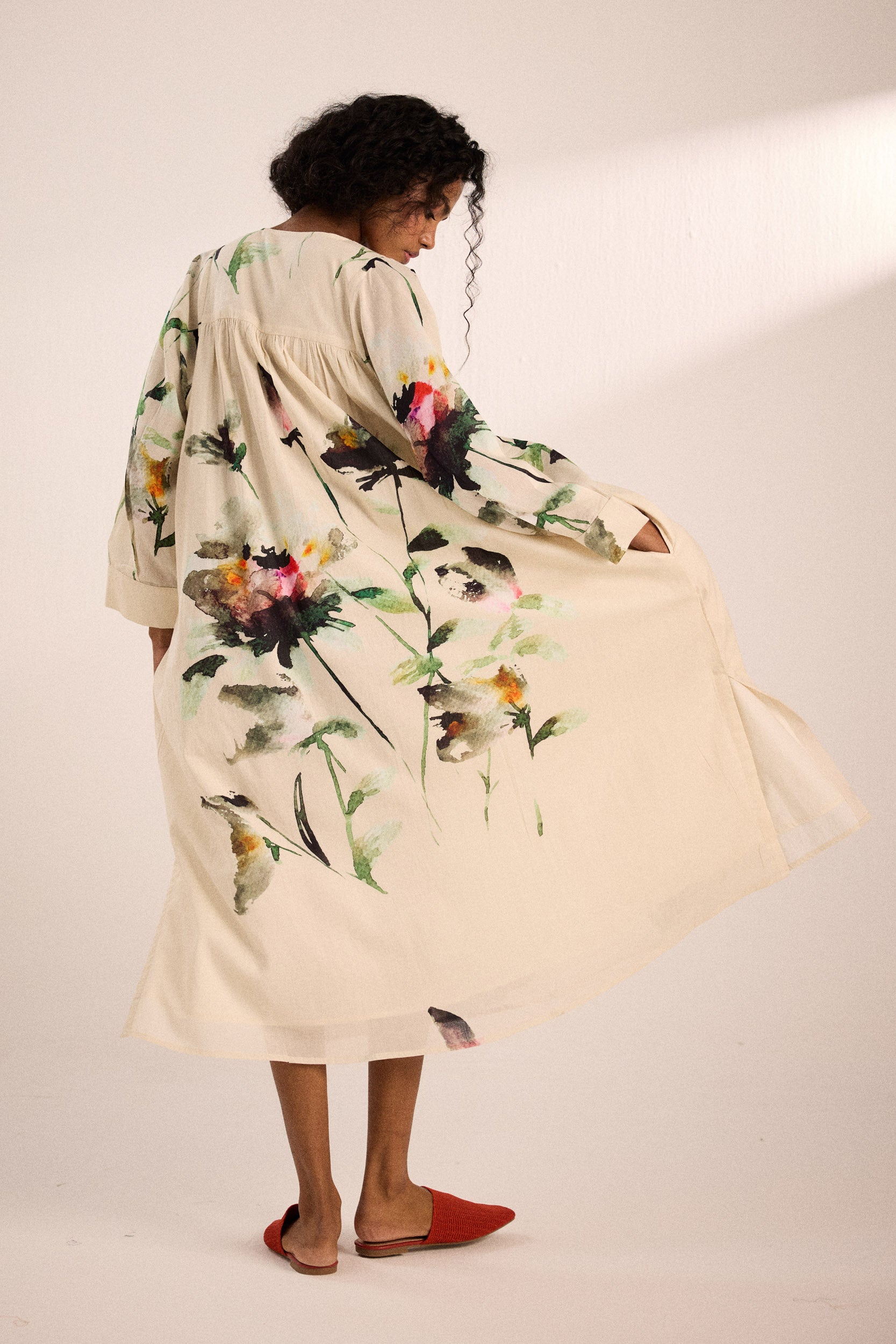 A relaxed, timeless A-line dress in watercolor- inspired floral print, crafted in cotton mul.