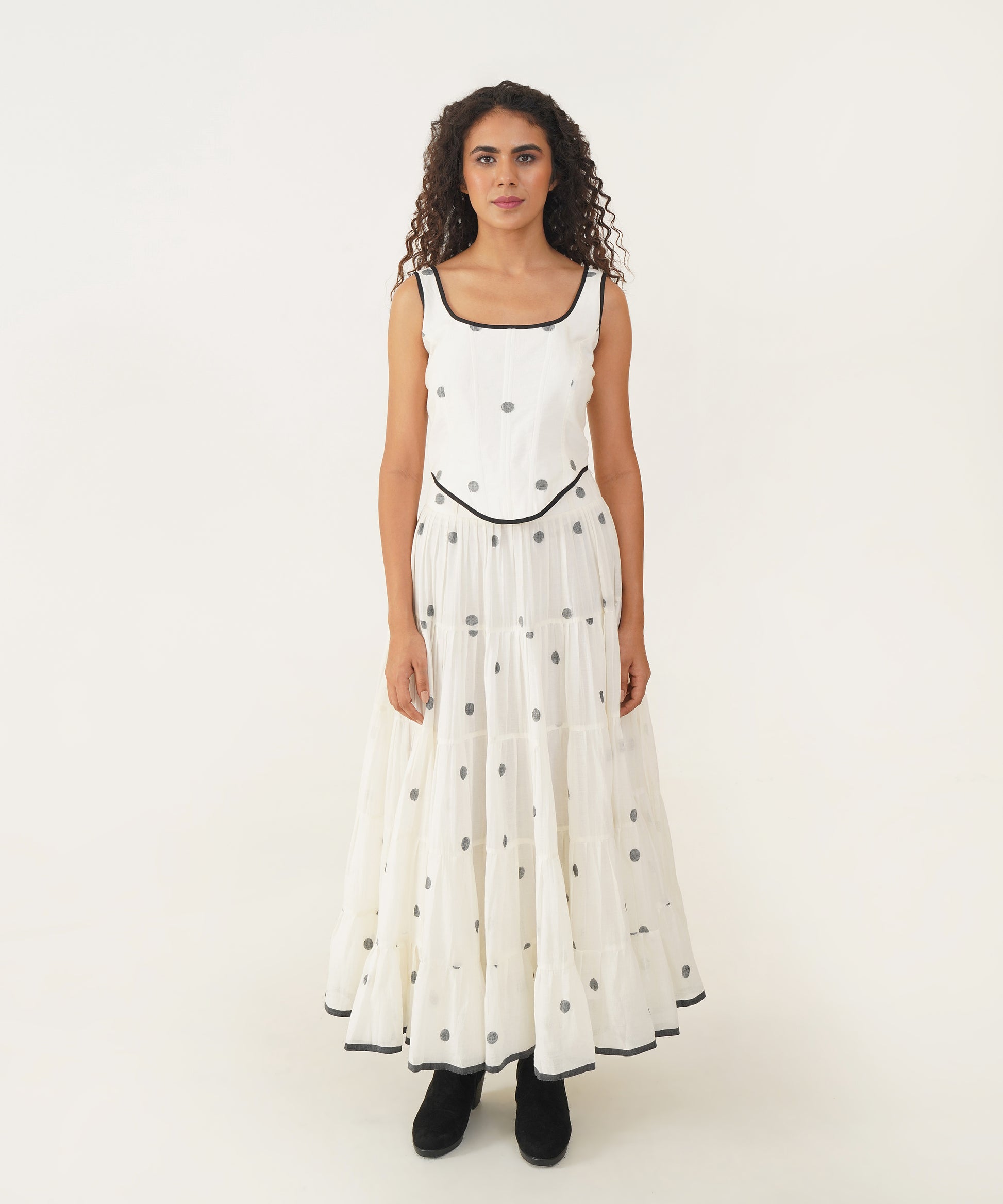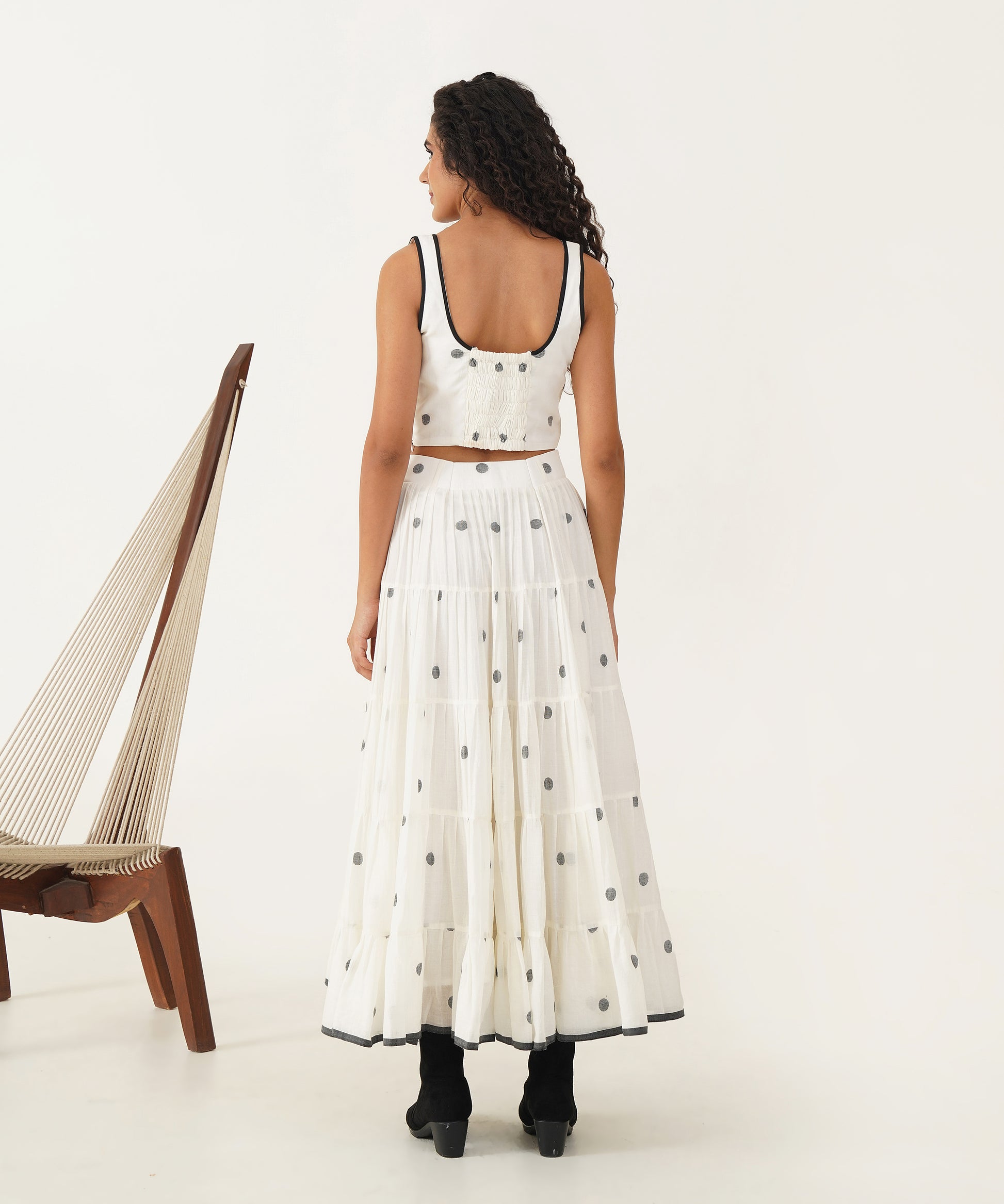 Elevate your style with this stunning ensemble, featuring a voluminous tiered skirt designed to flow gracefully with every step and equipped with convenient side pockets for added functionality. The ensemble's focal point is a corset with a deep square neckline, detailed with striking contrast panels. Its elasticated back and side zipper fastening ensure a snug, customisable fit, offering both comfort and a flawless silhouette. Perfect for making a memorable impression, this outfit effortlessly combines sophistication with practicality.