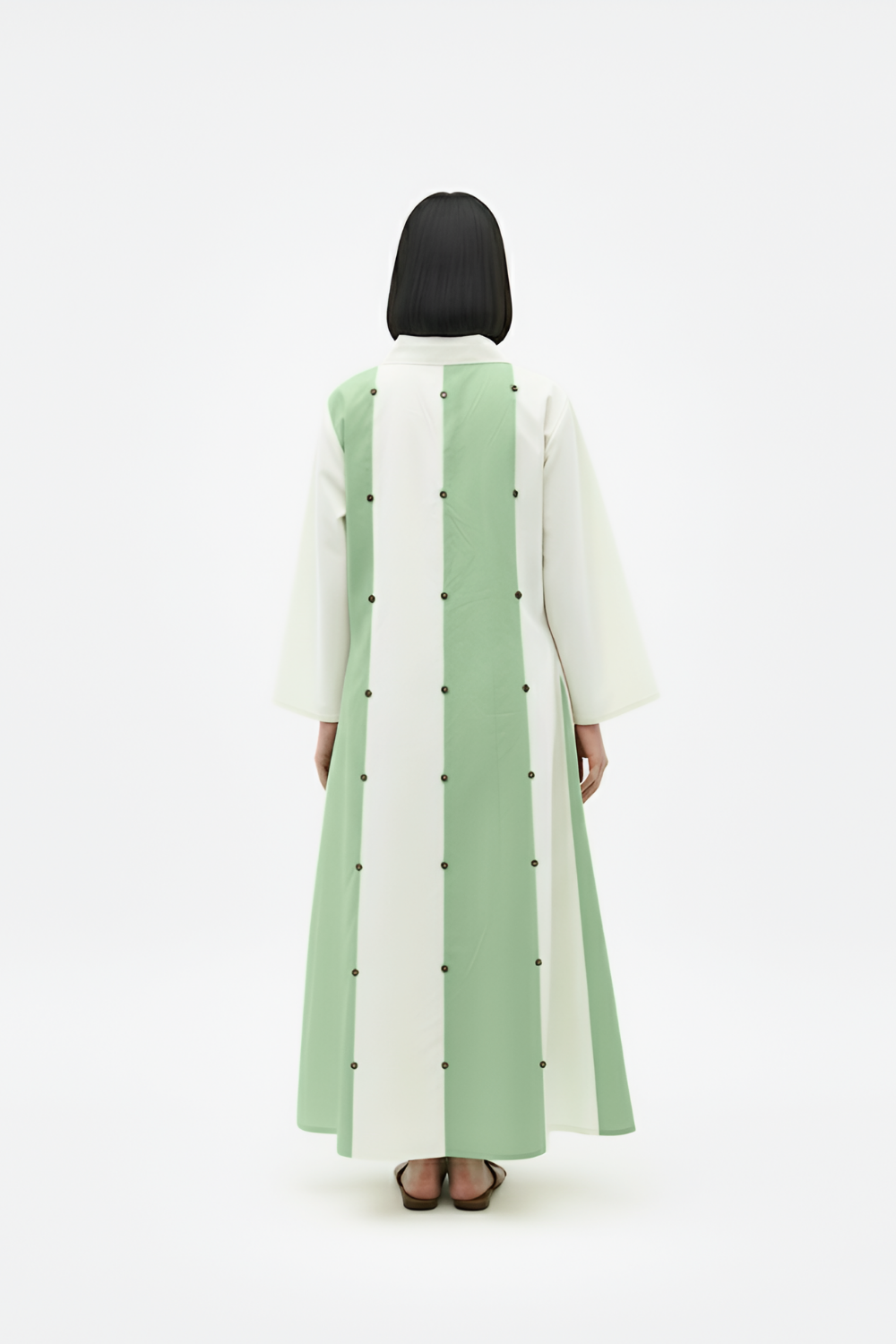 This subtle ivory-asparagus green maxi dress radiates effortless elegance. Its sleek lines and elegant silhouette showcase understated sophistication. Features like trumpet sleeves, 2 colored-panels, wooden button detail, and a V-neck with a collar add a touch of flair, while the full-length cut offers versatile styling options. Ideal for chic comfort, it leaves a lasting impression at any event. Perfect for making a seamless transition from day to night.