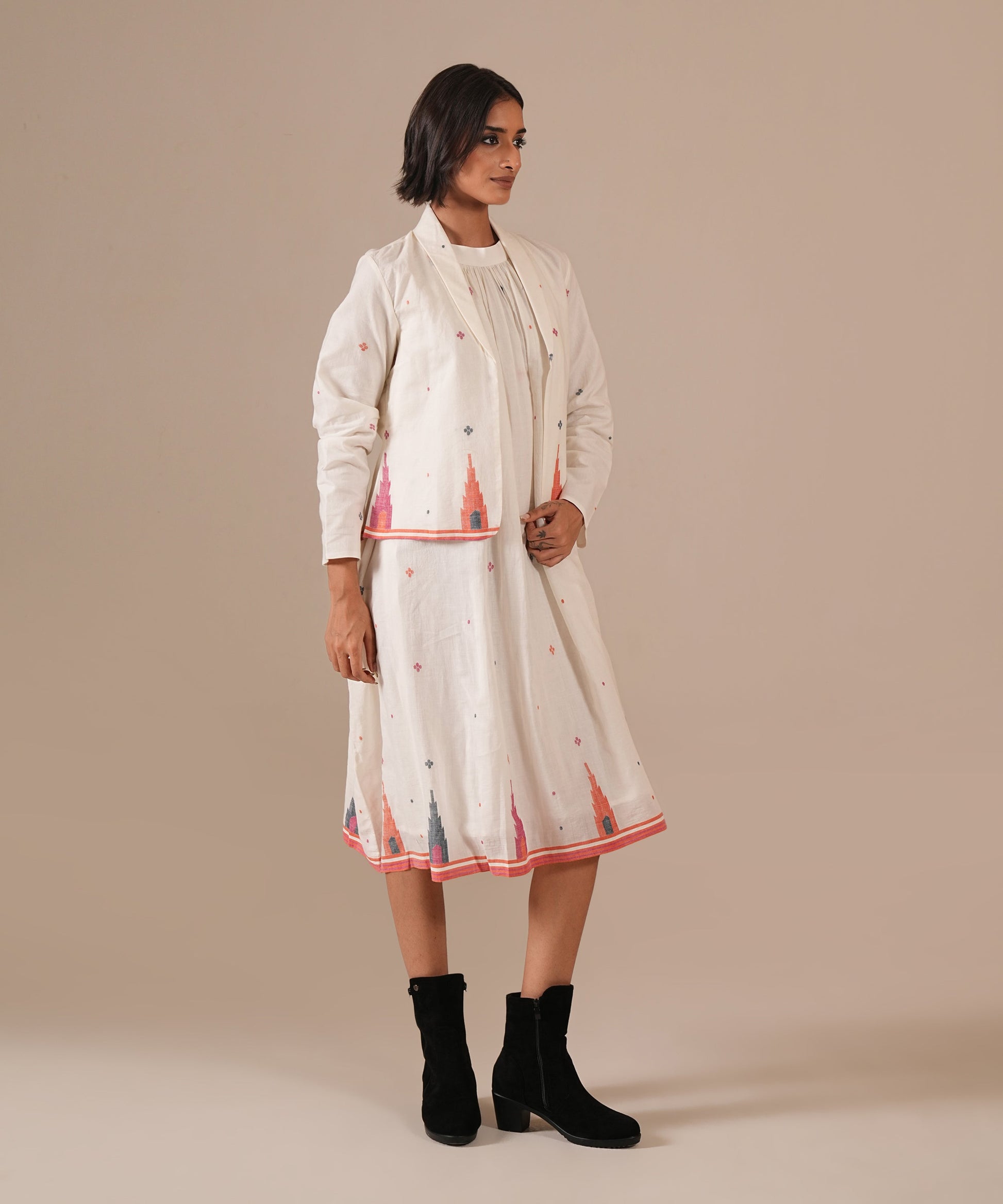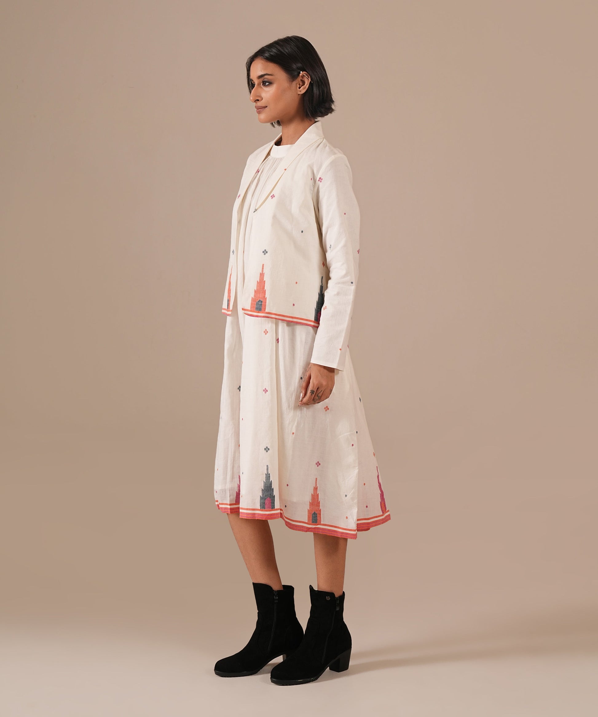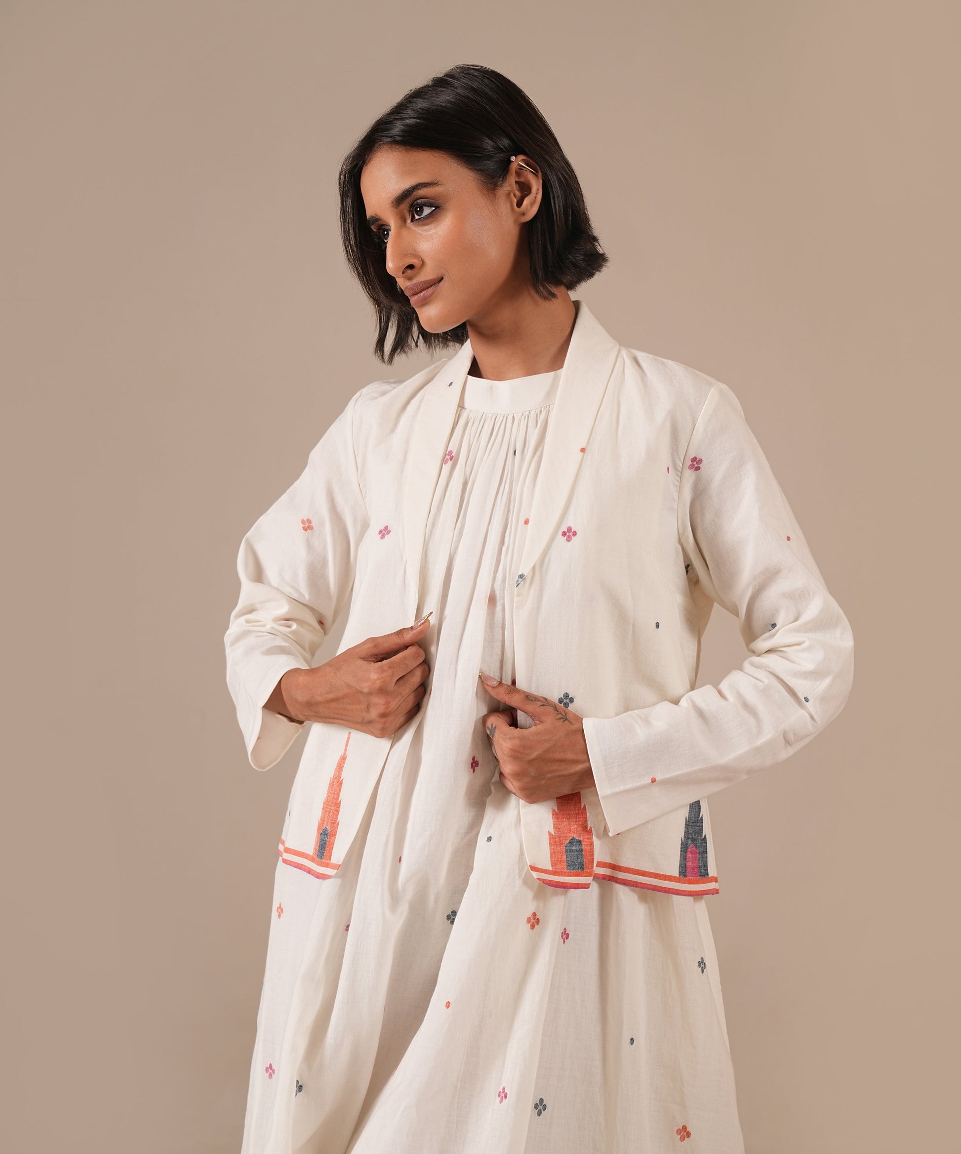 A classic Jamdani ensemble featuring a gathered dress with halter neck, delicate gathers, back zipper, and side pockets, paired with a co-ord jacket meticulously handwoven to blend artisanal heritage with contemporary luxury.
