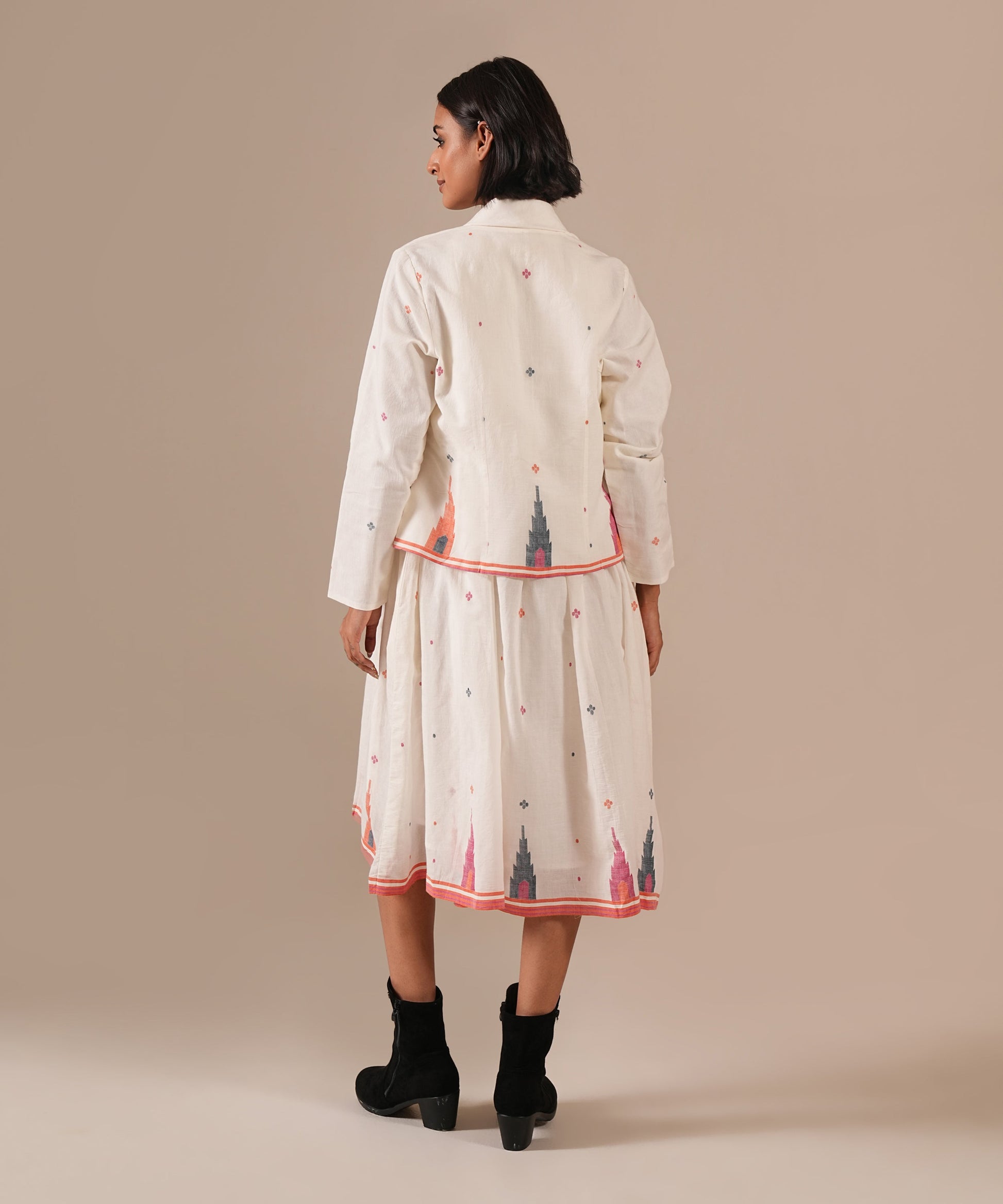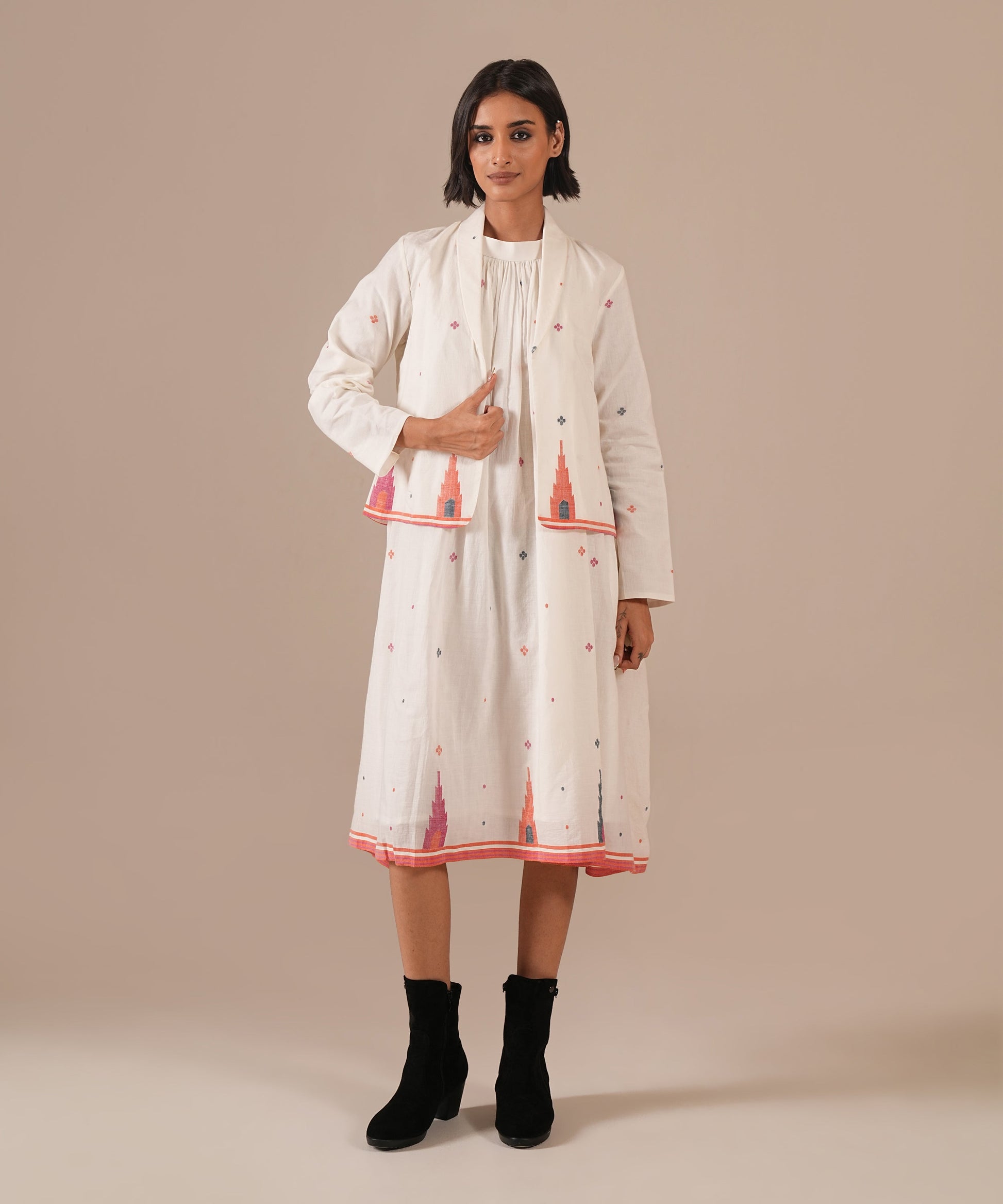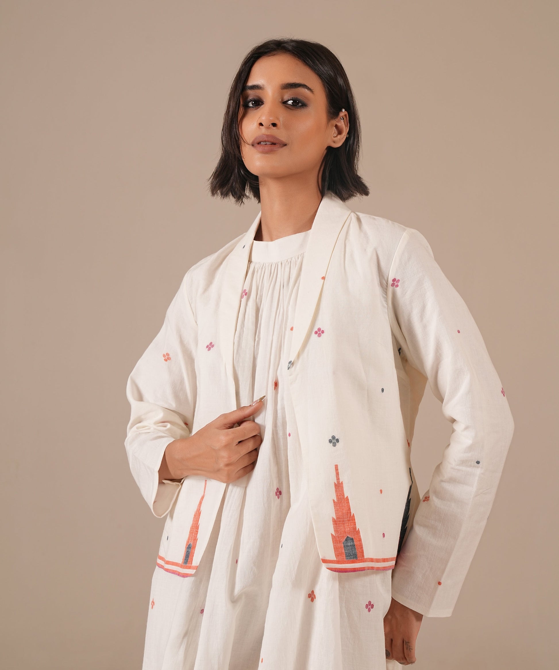 A classic Jamdani ensemble featuring a gathered dress with halter neck, delicate gathers, back zipper, and side pockets, paired with a co-ord jacket meticulously handwoven to blend artisanal heritage with contemporary luxury.