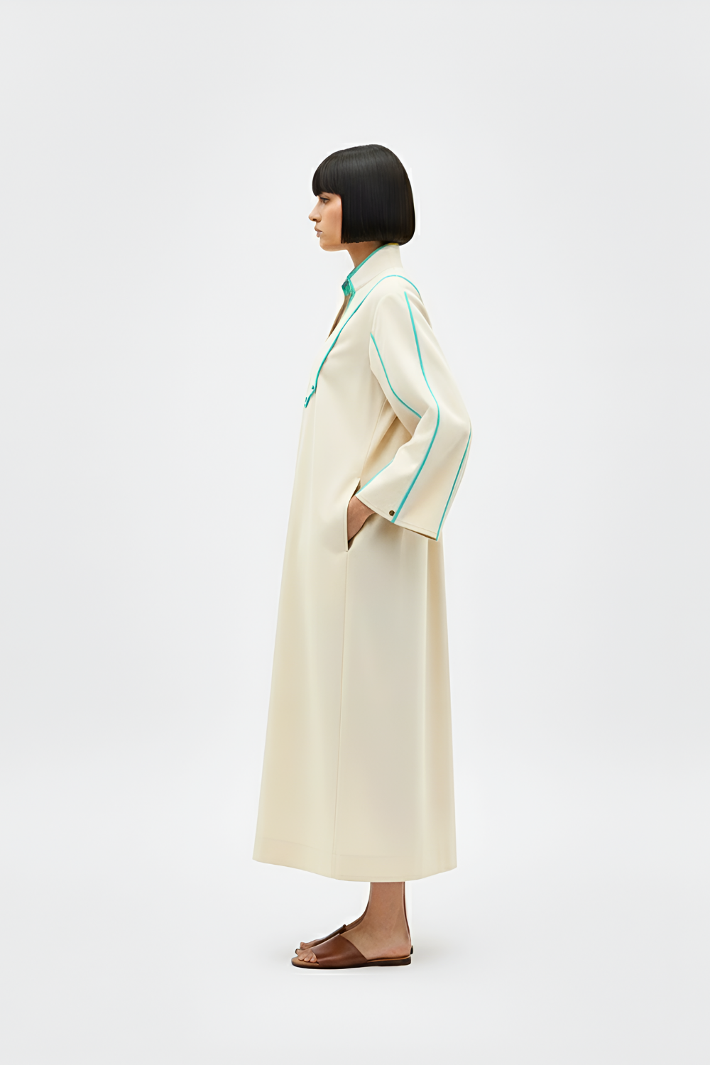This charming dress comes in a delightful ivory-tiffany blue hue and features unique trumpet sleeves with stripes of maroon, a stand collar, a stand collar, wooden button detailing, collared v-neck that give it a structured look. The back of the dress wooden button detail on the yoke. With its classic and comfortable fit, it effortlessly blends elegance and ease. Perfect for making a seamless transition from day to night.