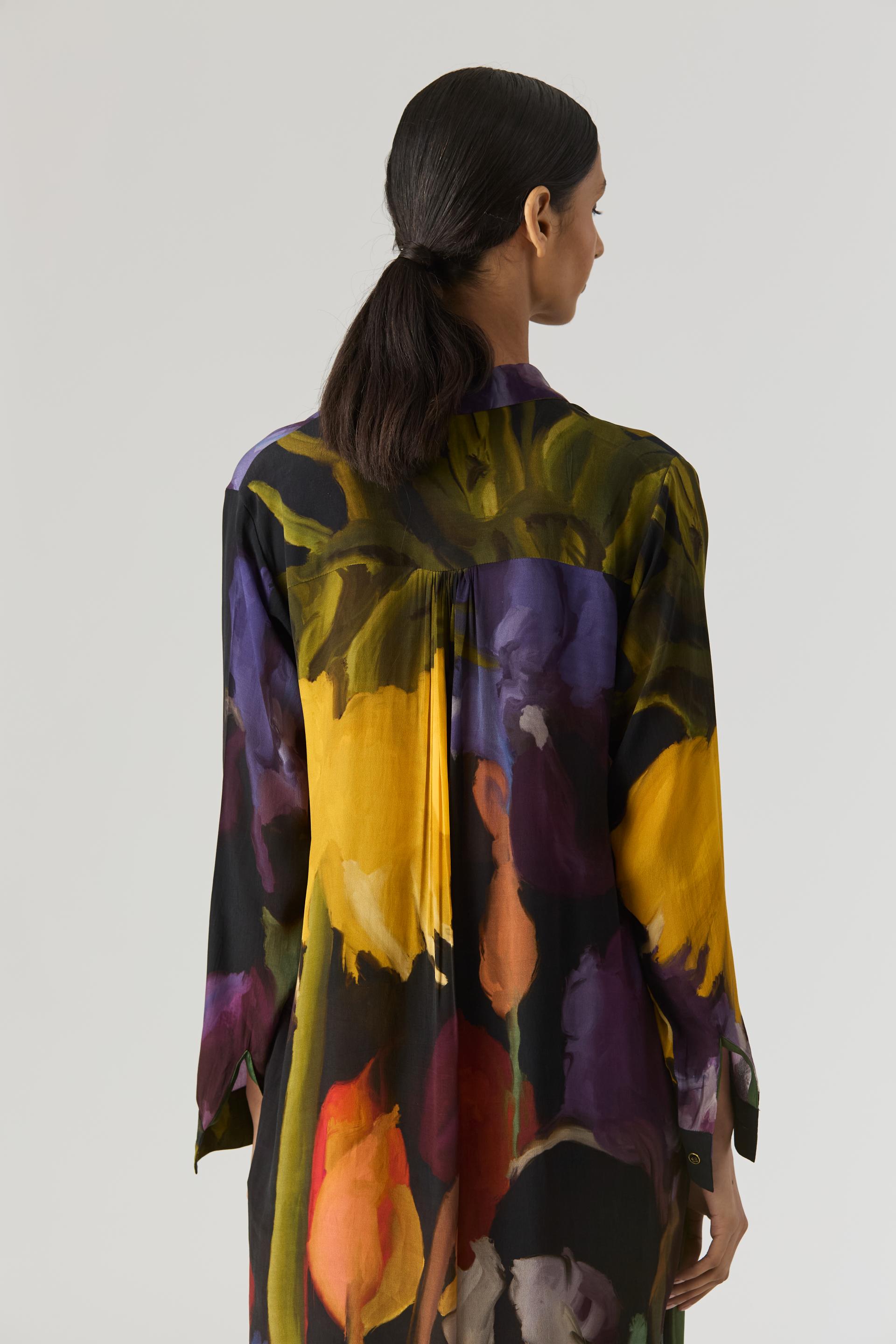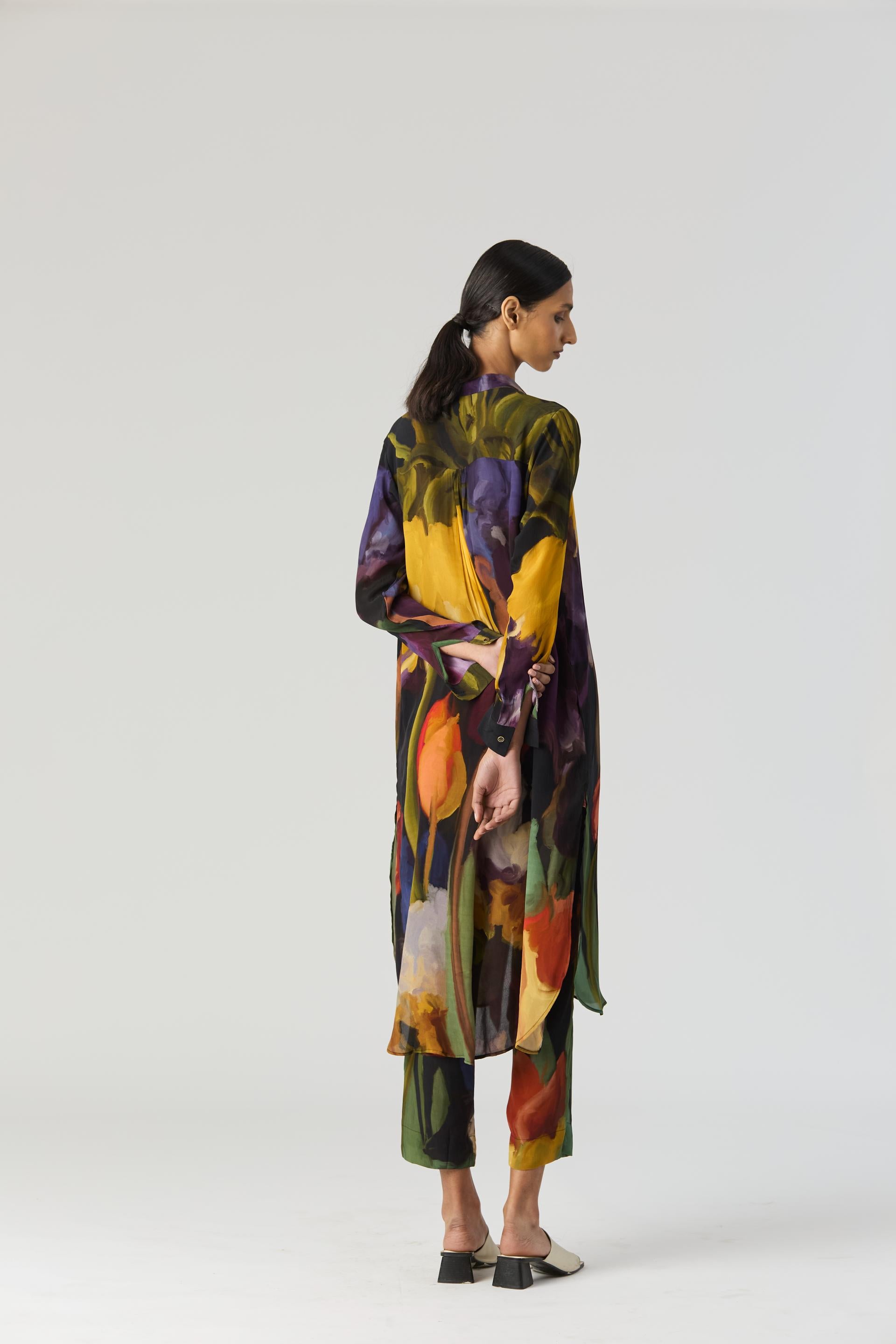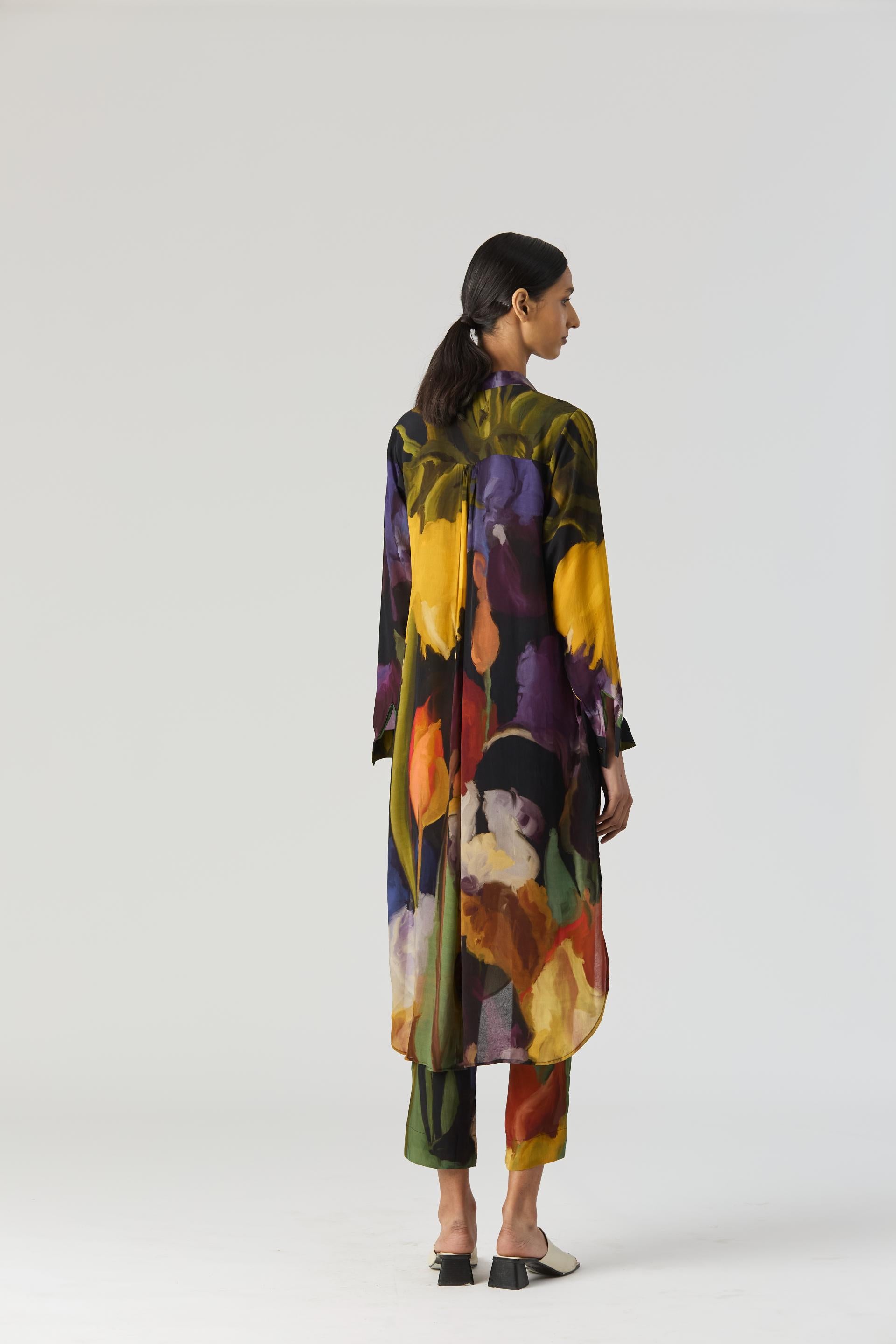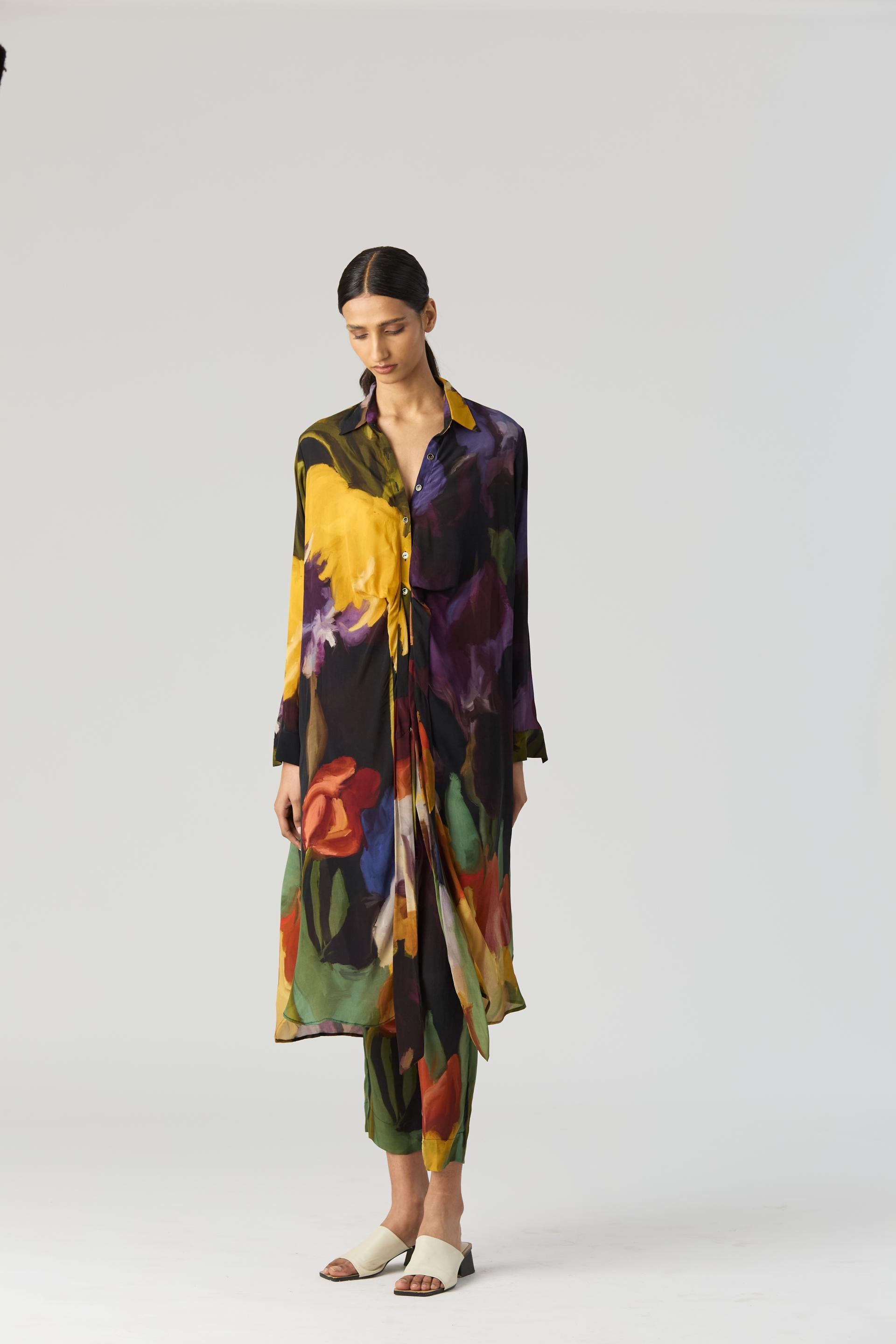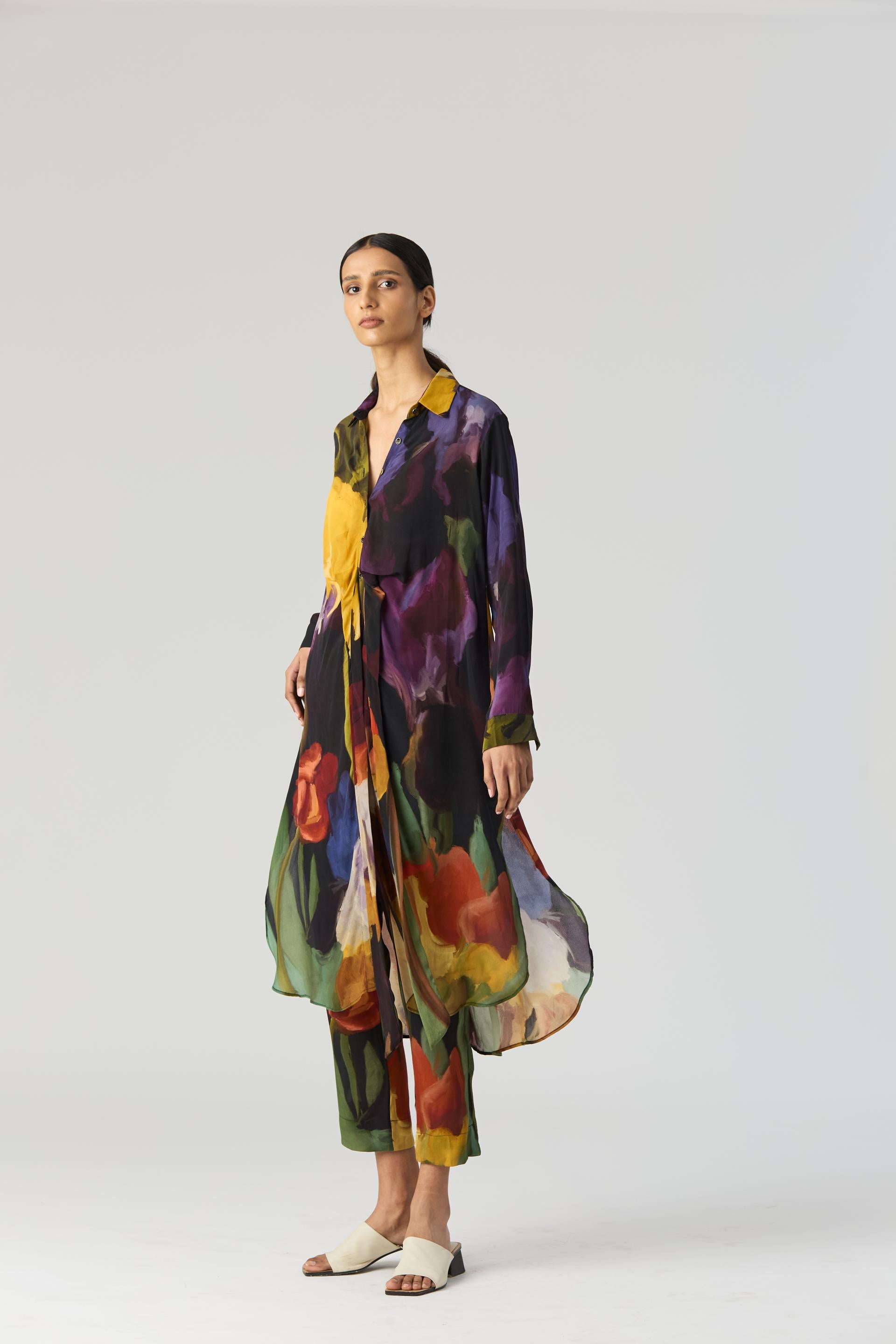 The shirt collar and button-down design of the kurta with a wrap detail exudes a classic aesthetic with a twist. The sleeves are straight with cuffs.