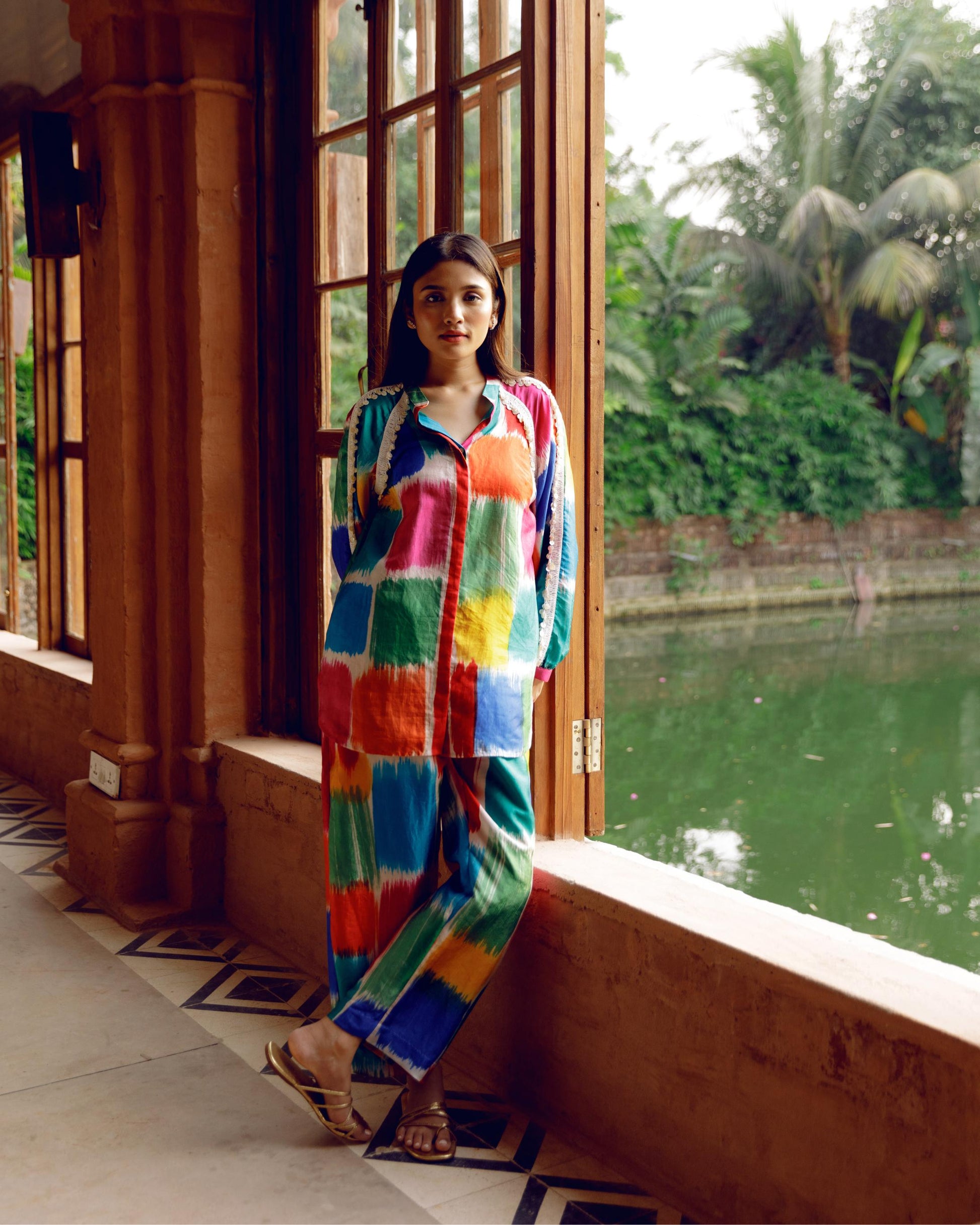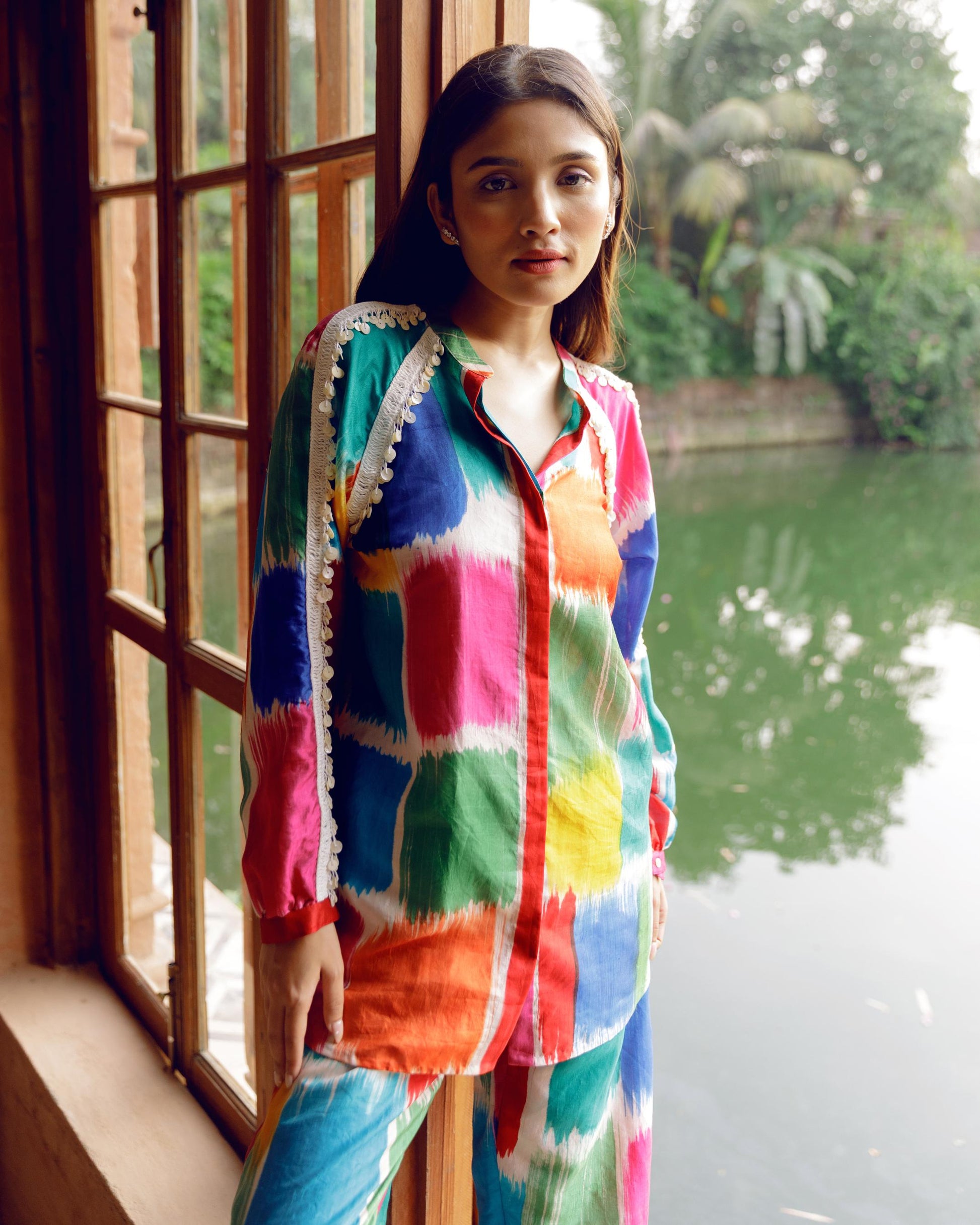 Multicolour brush stroke print, handwoven mulberry silk shirt with a woven shell trim edging along the shoulder and neckline. Paired with multicolour brush stroke print, handwoven mulberry silk trouser.