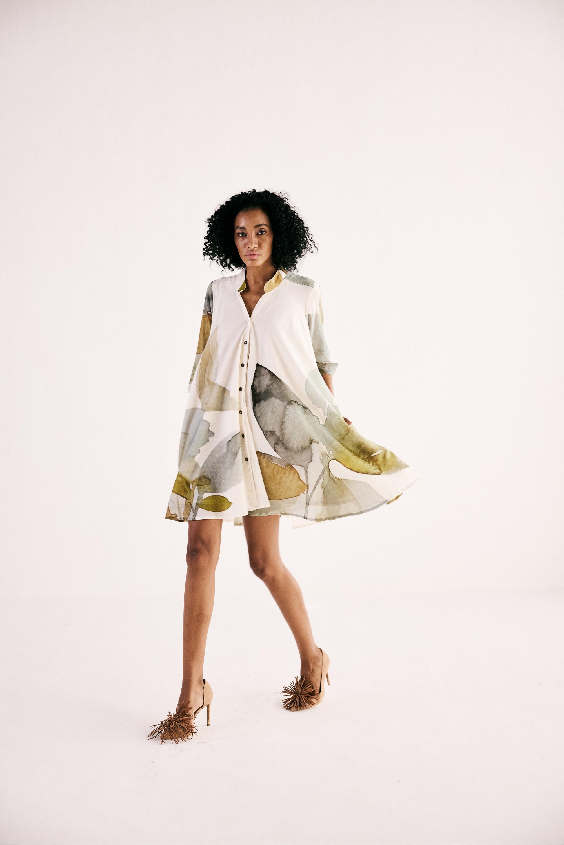 A short flowy dress featuring our signature art print crafted in soft cotton mul with front button opening in an anti-fit style to give the perfect relaxed day.