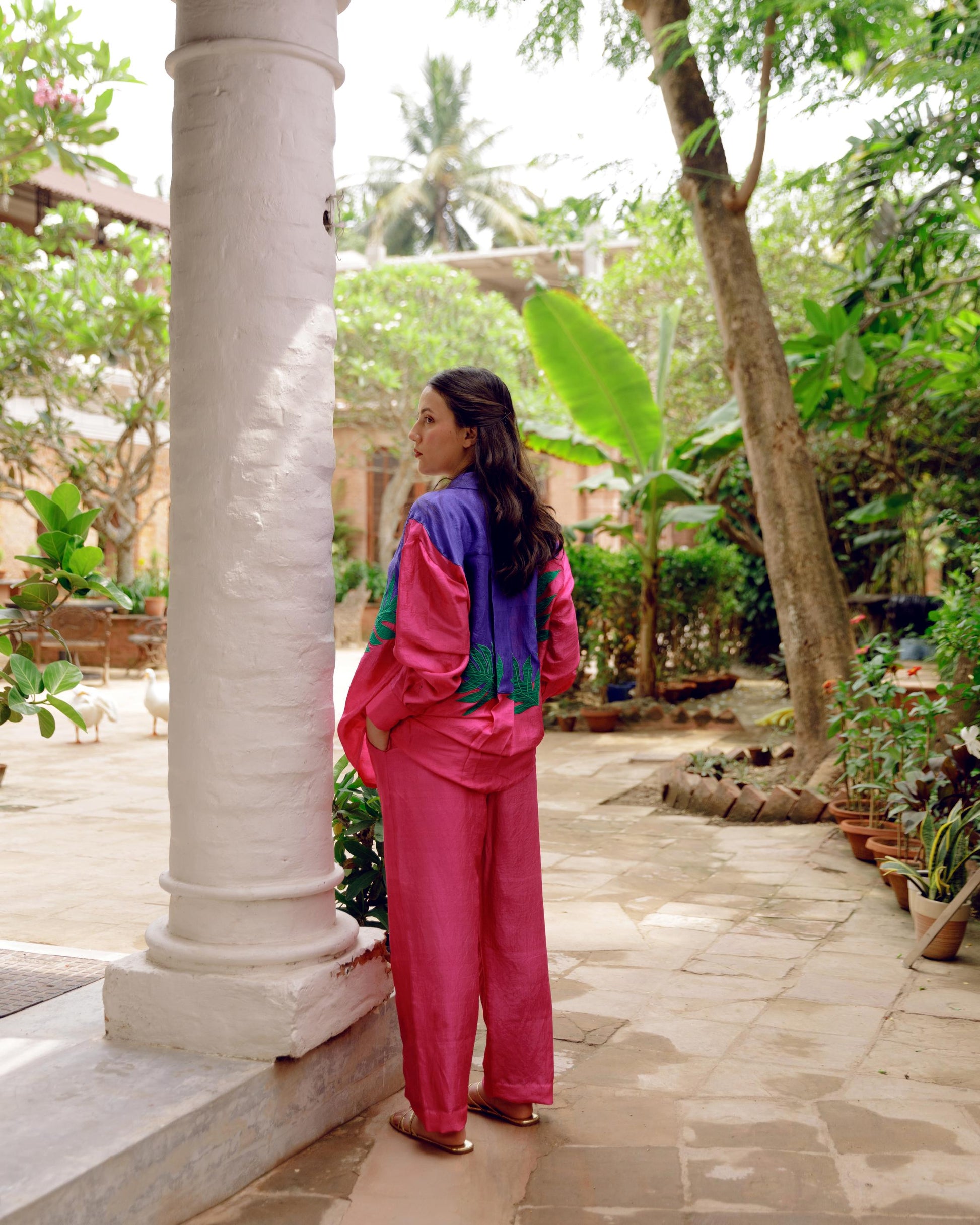 Pink handwoven mulbery silk co-ord set with a contrast purple yoke and large green applique leaves. Paired with straight comfortable trouser.