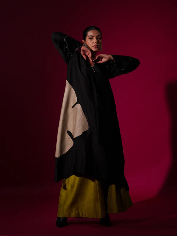 Relaxed tunic made in silk features hand sewn applique and intricate embroidery details