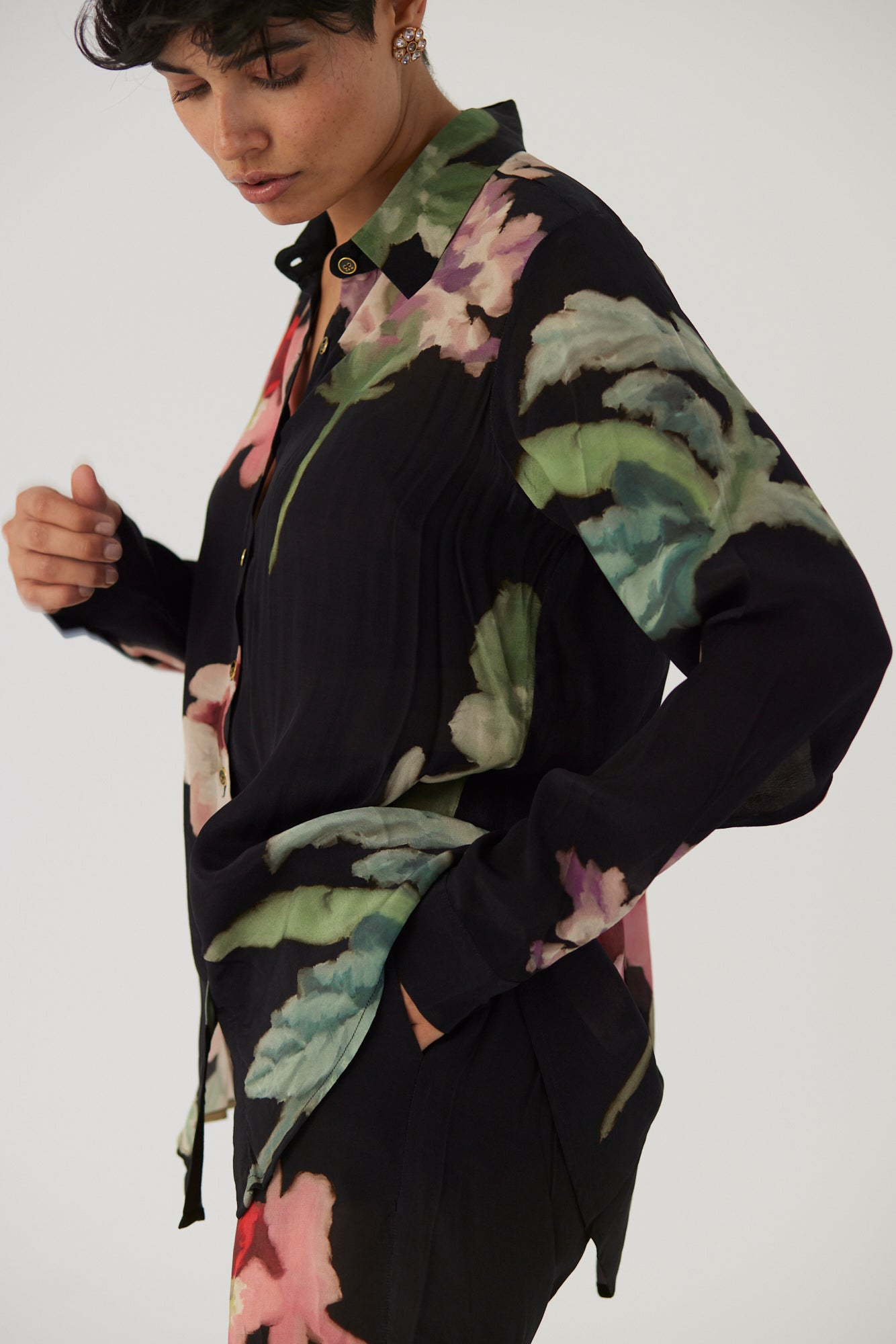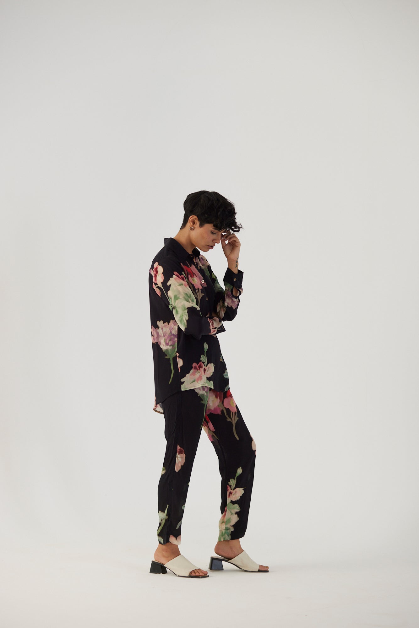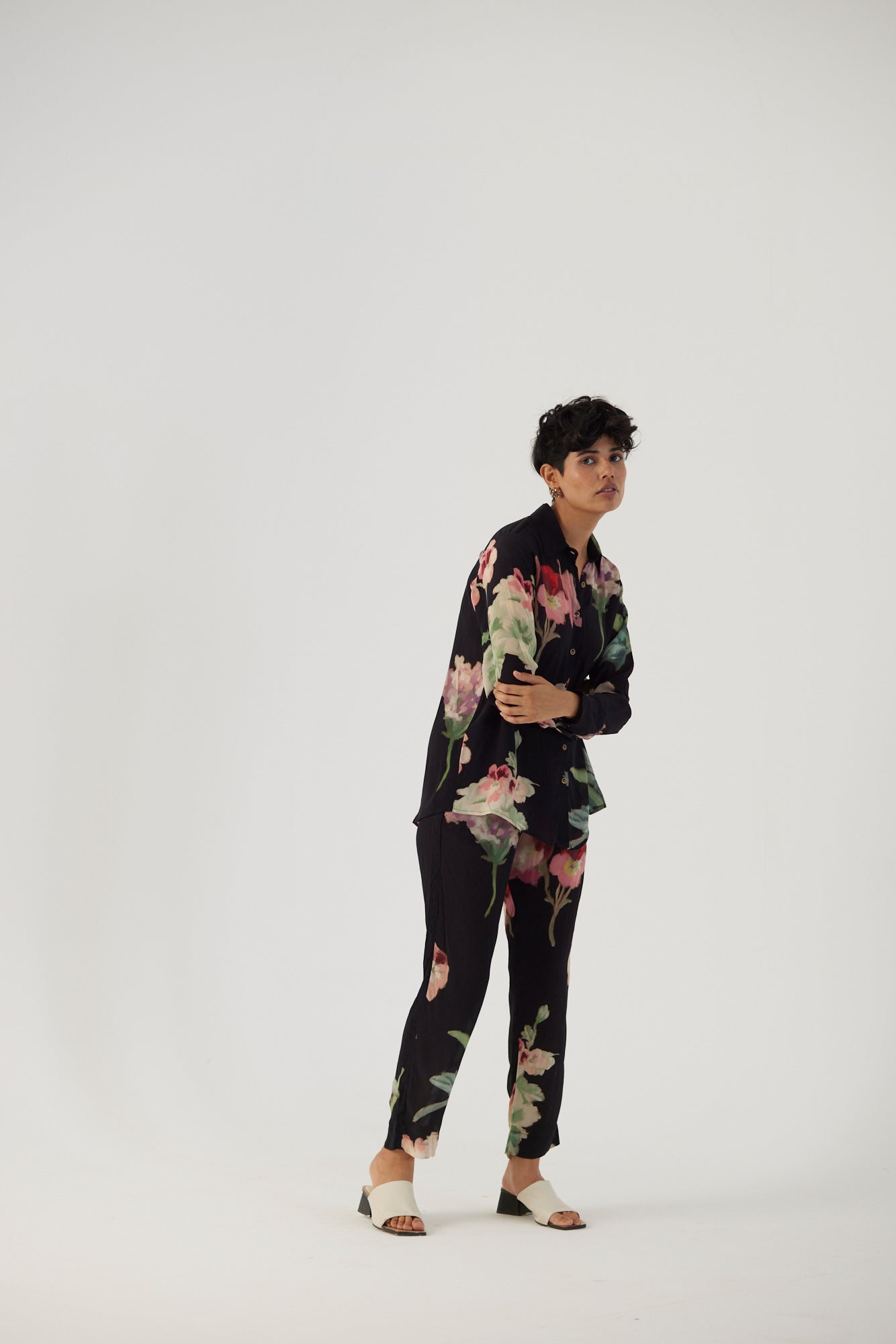 The print features hand drawn botanical motifs in a black base. This set is crafted in the Juliet print carefully printed on crepe featuring a set of shirt and pants.