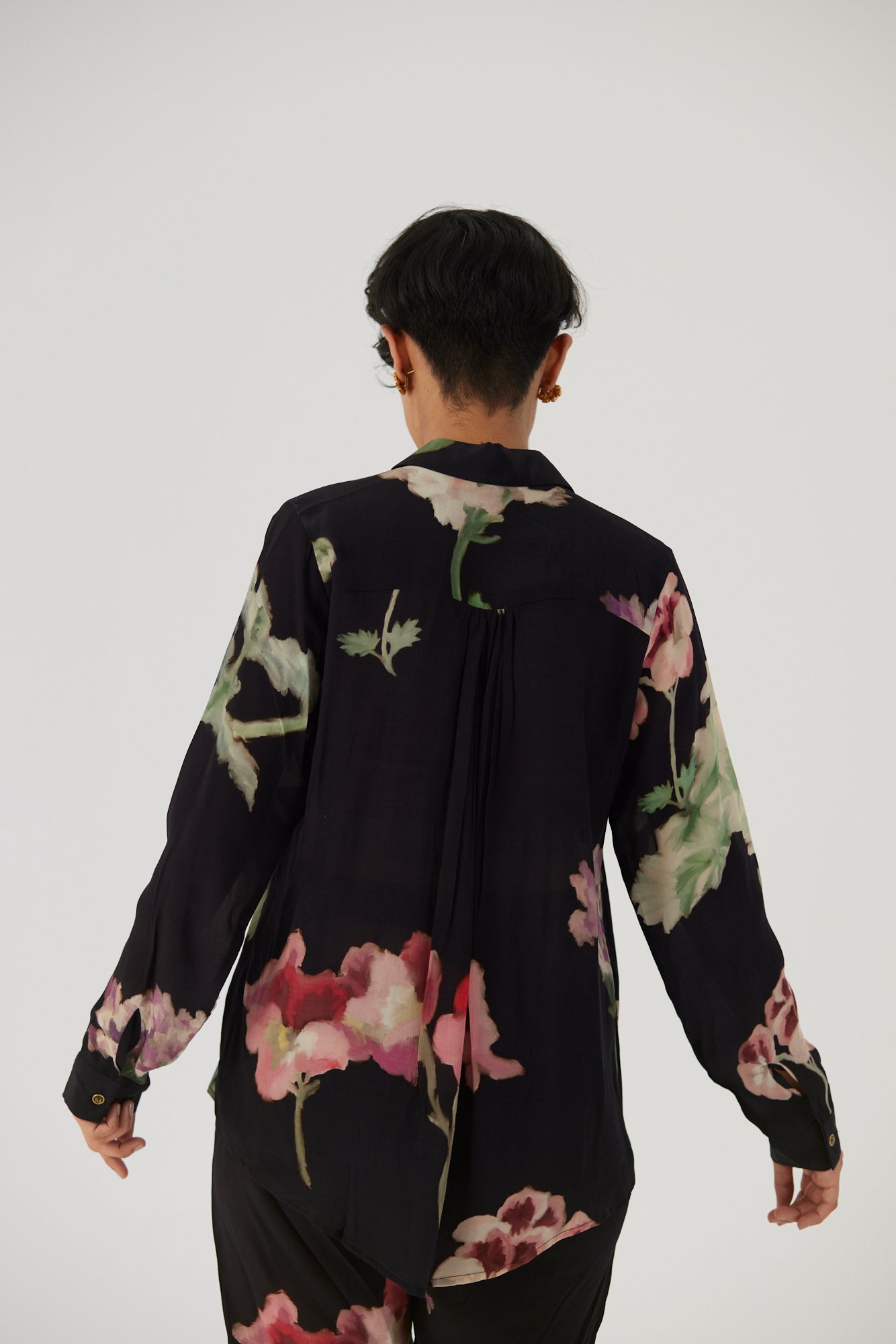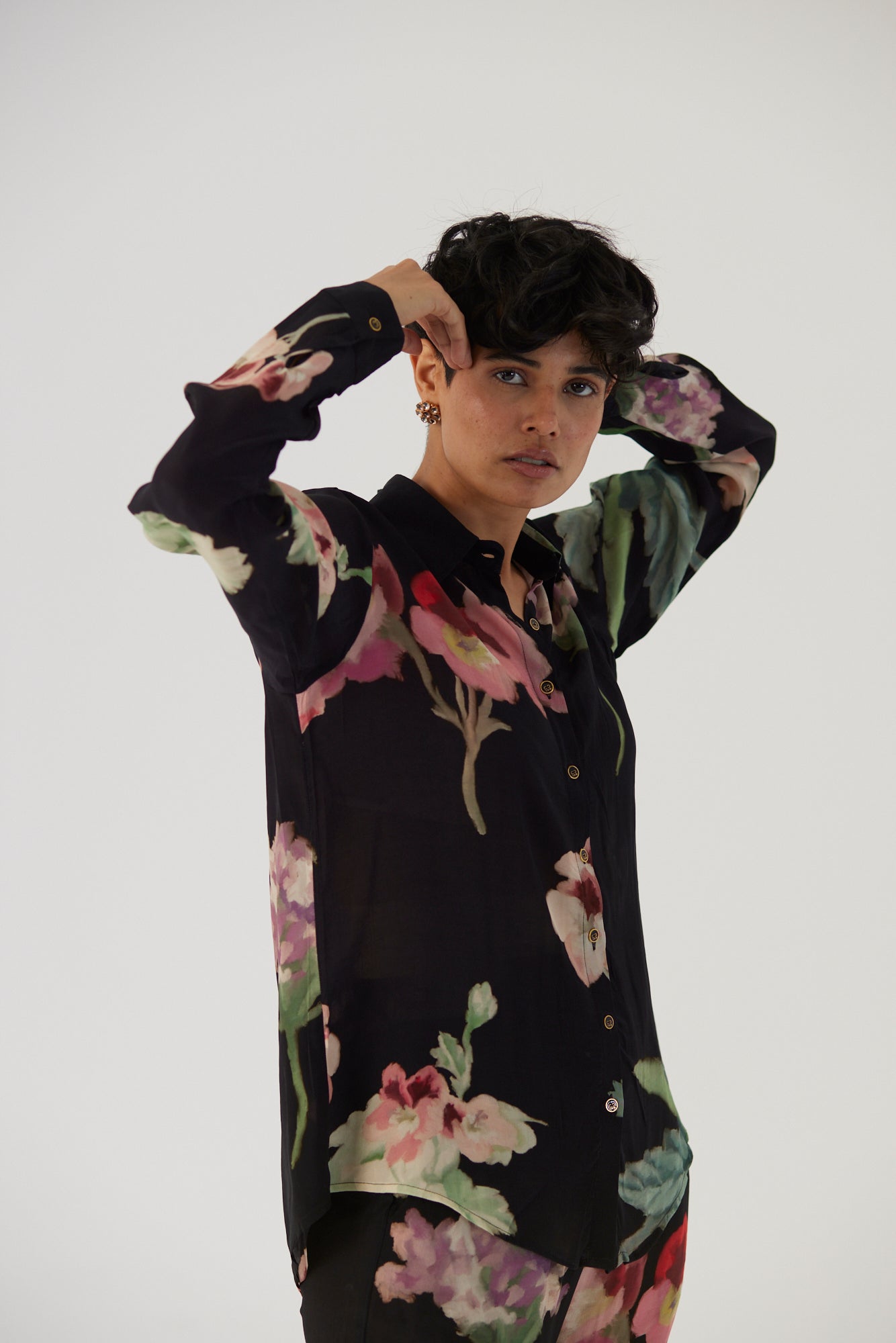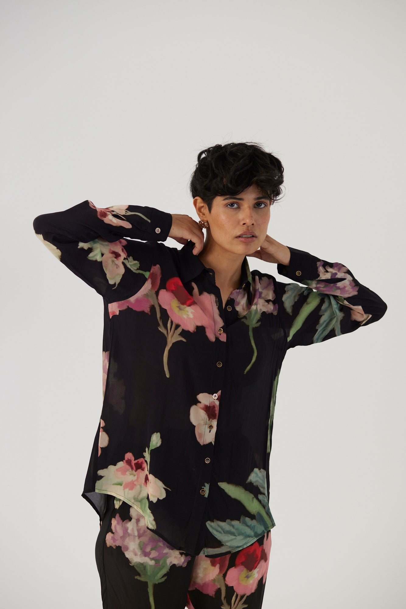 The print features hand drawn botanical motifs in a black base. This set is crafted in the Juliet print carefully printed on crepe featuring a set of shirt and pants.