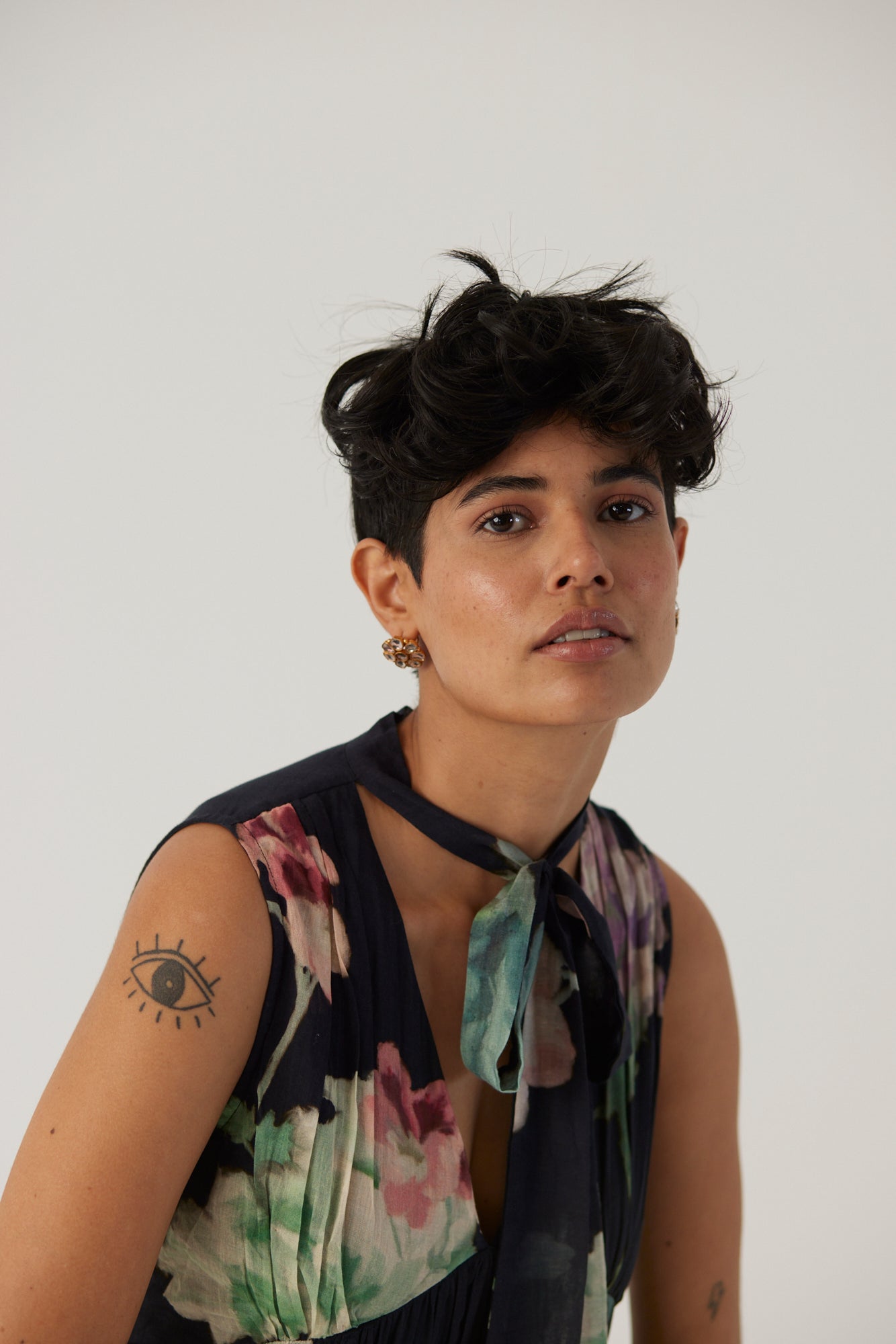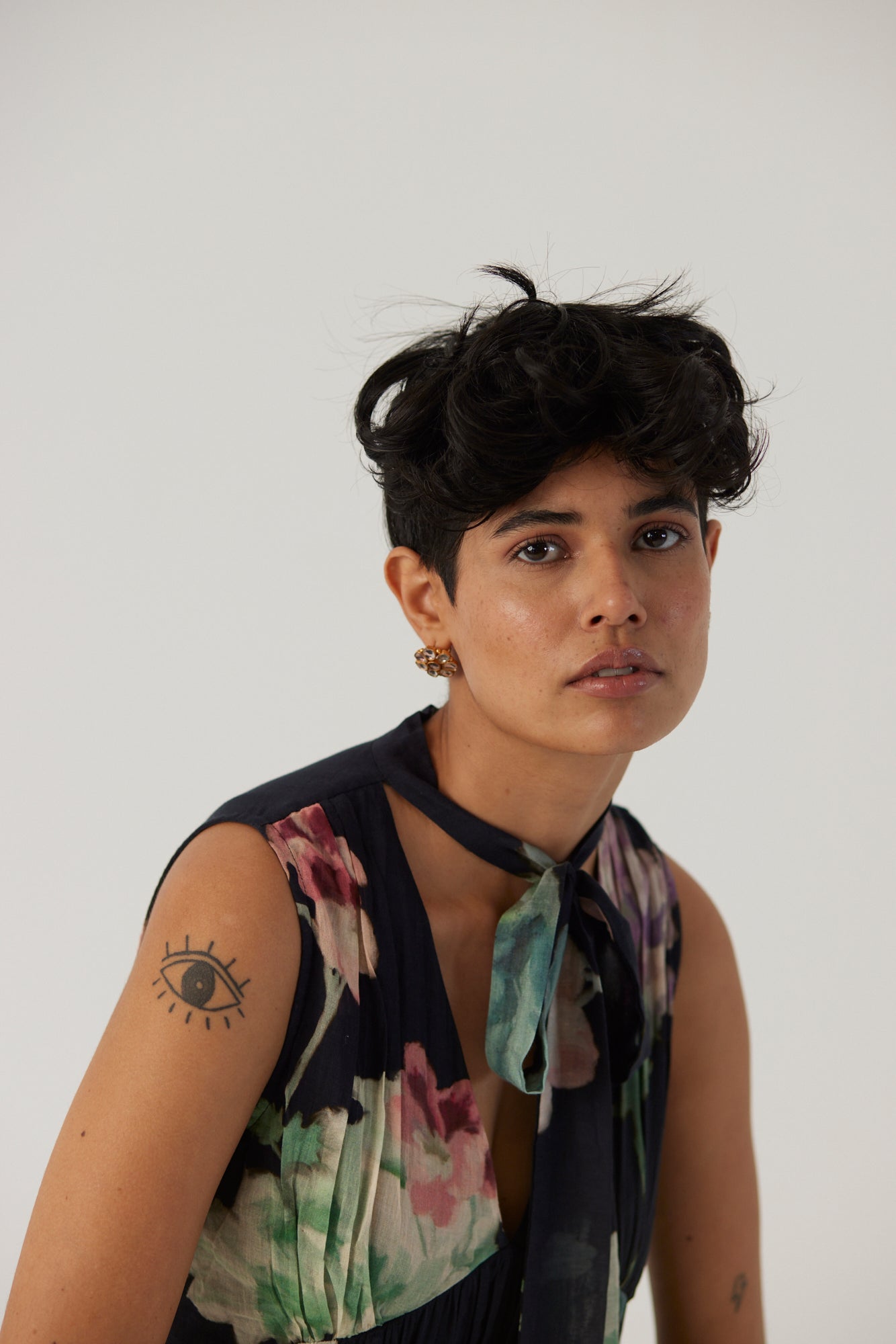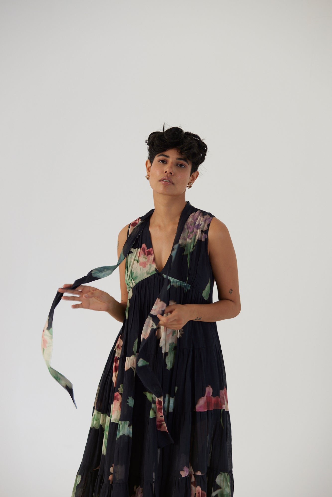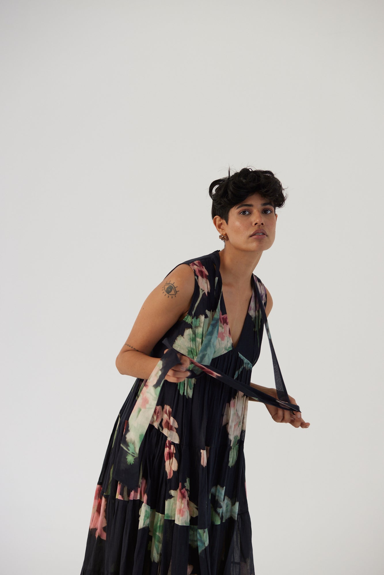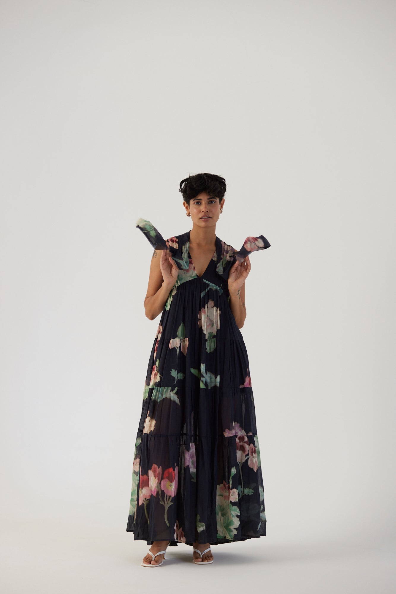 The print features hand drawn botanical motifs in a black base. This set is crafted in the Juliet print carefully printed on cotton featuring a long length tier dress.