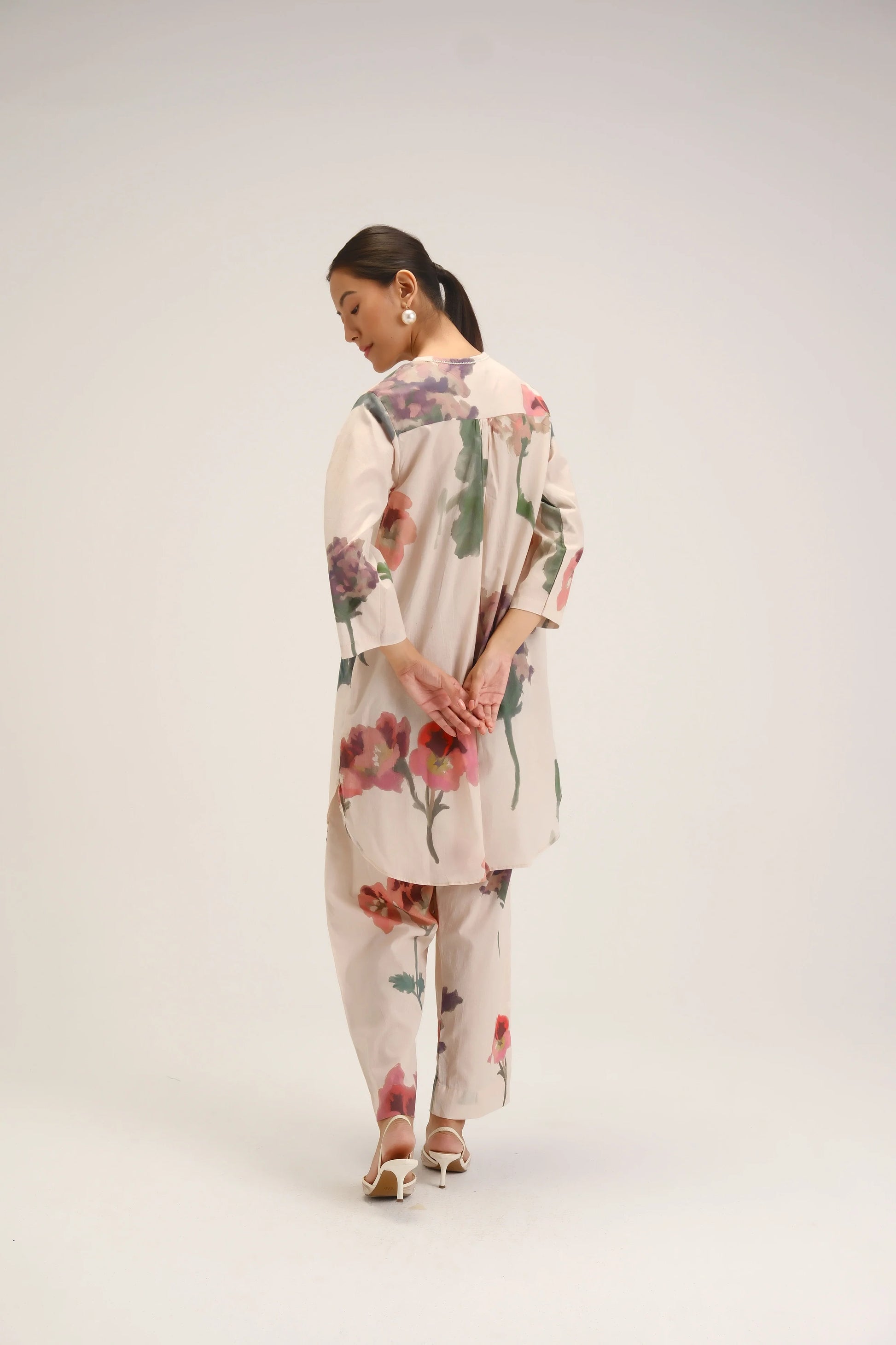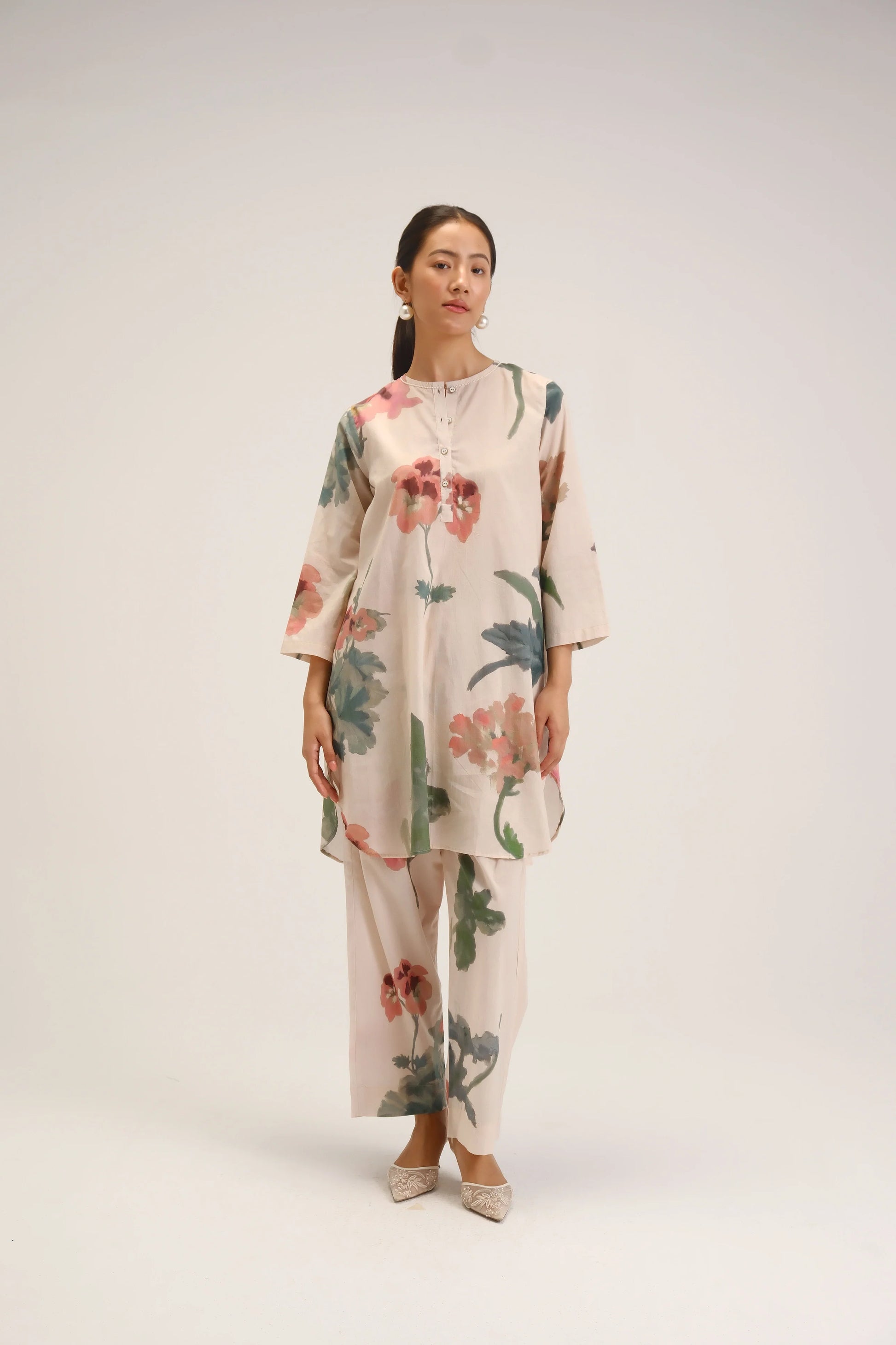 Bottoms: Relaxed straight pants featuring a coordinated floral print