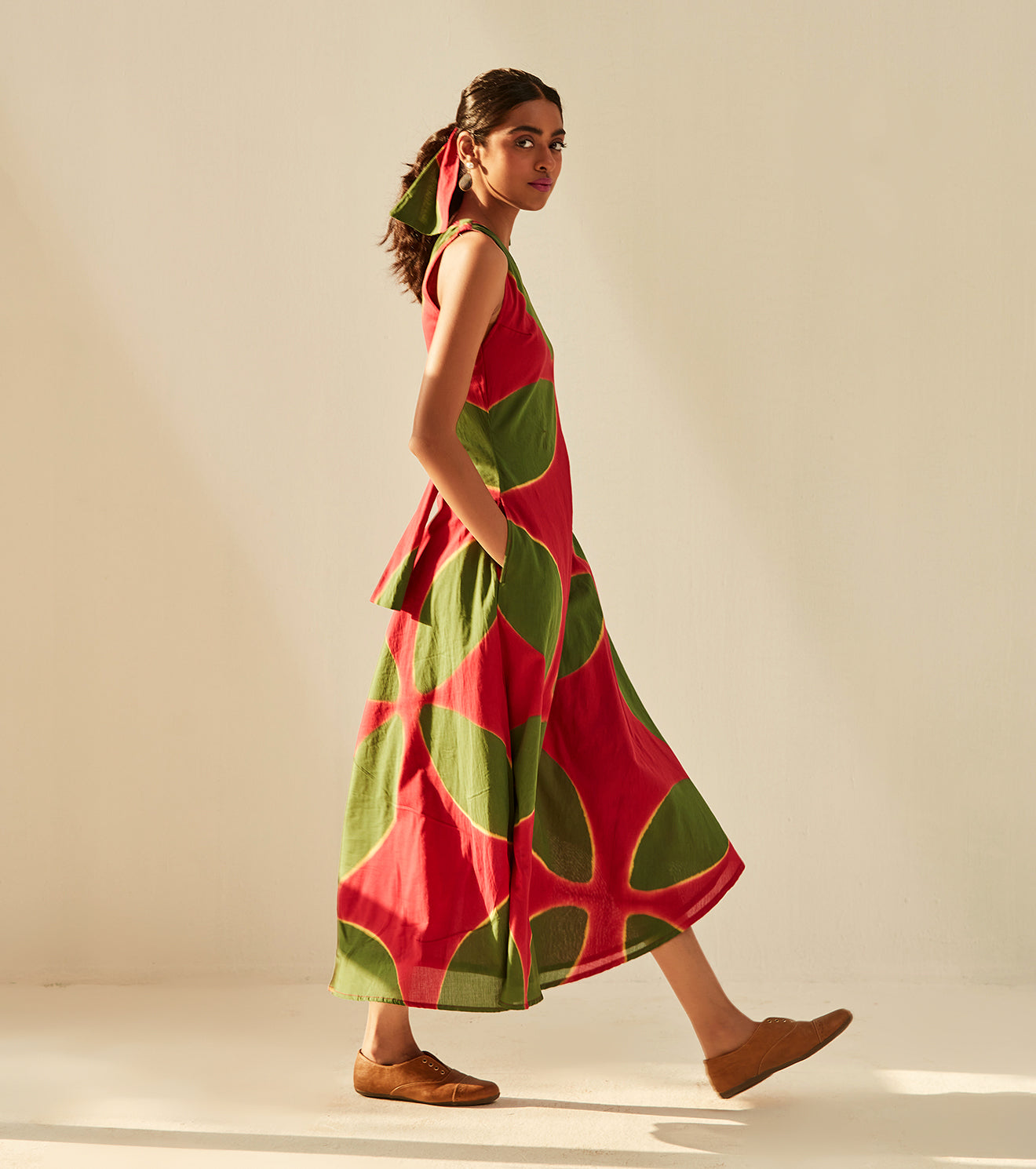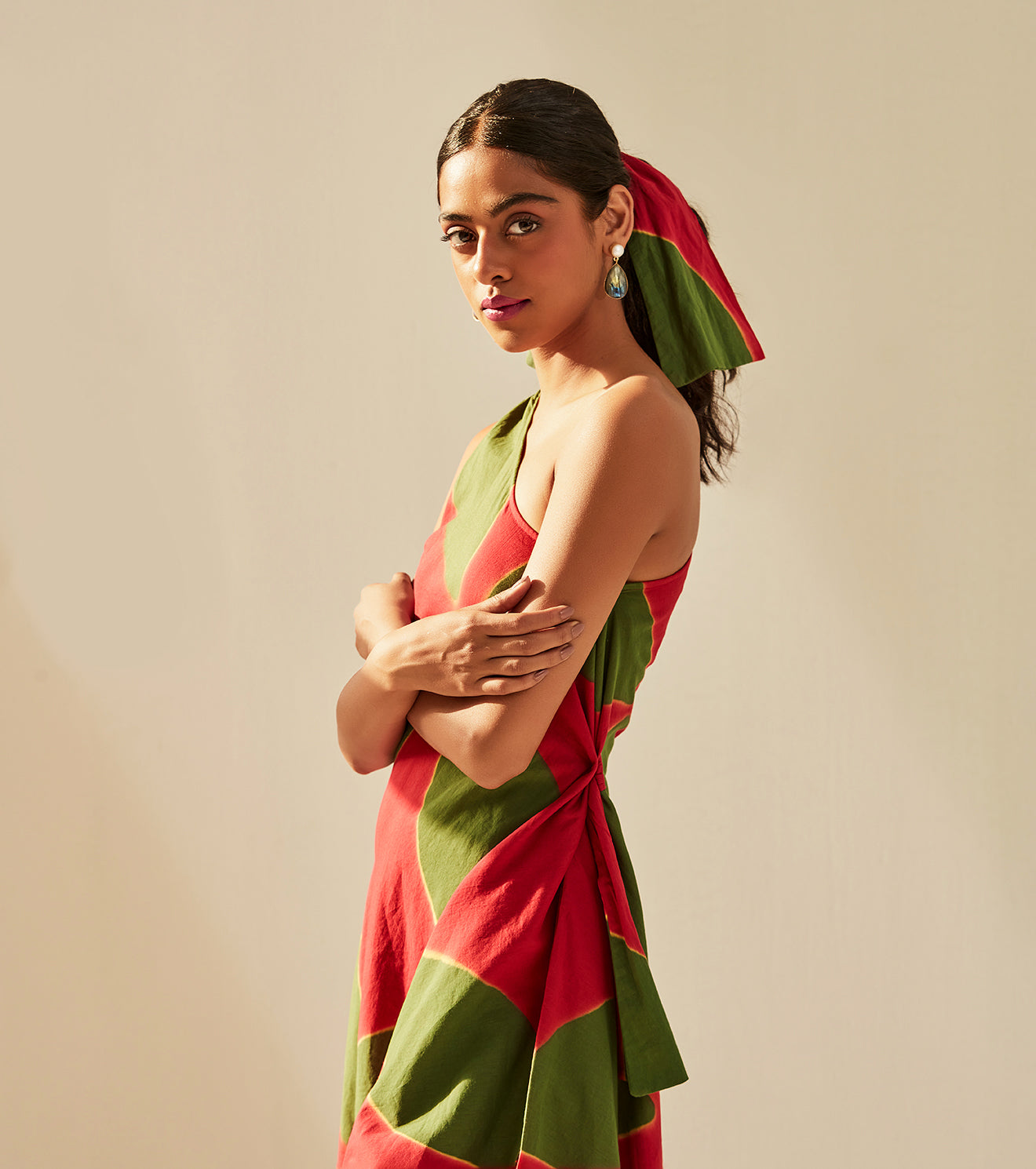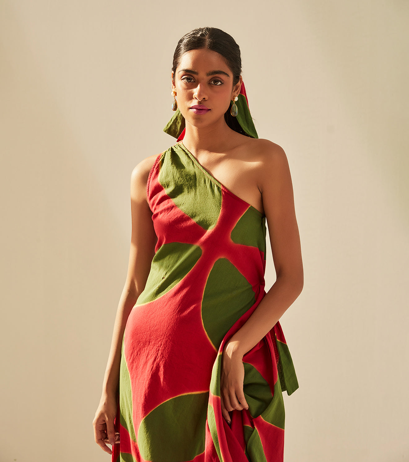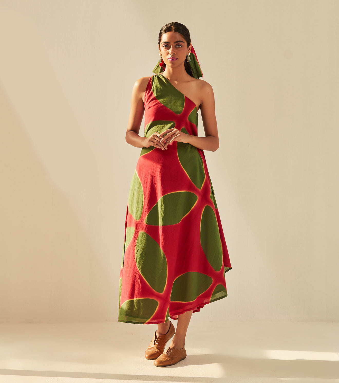 Imbued with vibrance and positivity, This one shoulder dress is a charming translation of the season in our signature shibori dyed soft cotton mul fabric.Handcrafted in India. Side seam pockets. Fully lined.