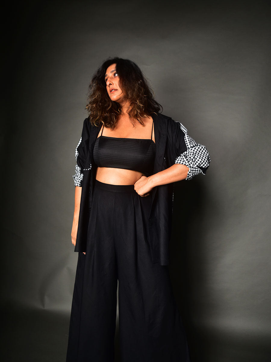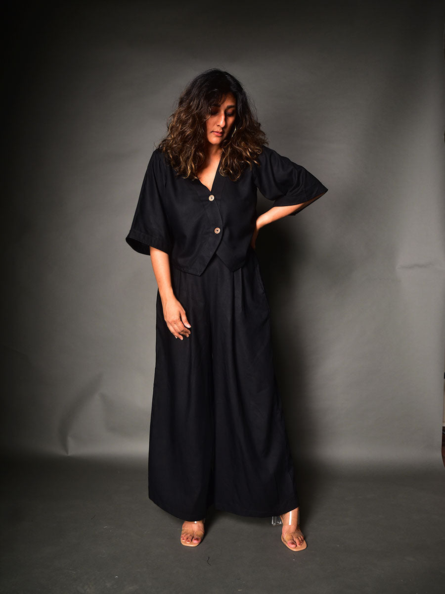 Strut your glam with these pleated trousers as you upgrade from your everyday look. Cut in black rayon cotton, these pants have pleats in the front, with elastic at the back for elegance and comfort. It is best paired with our Juno Top.Add to the glam with gold studs and statement pumps.