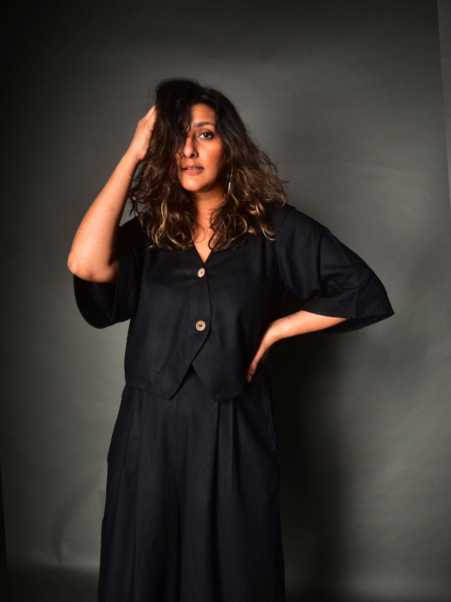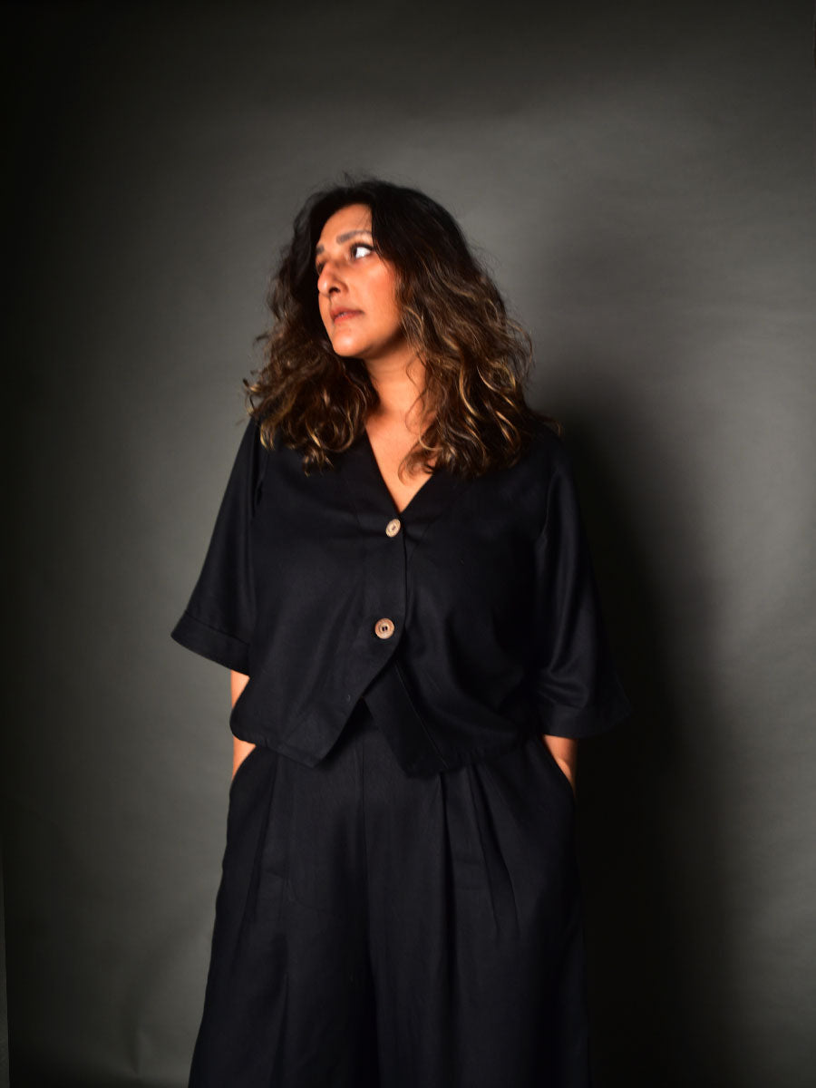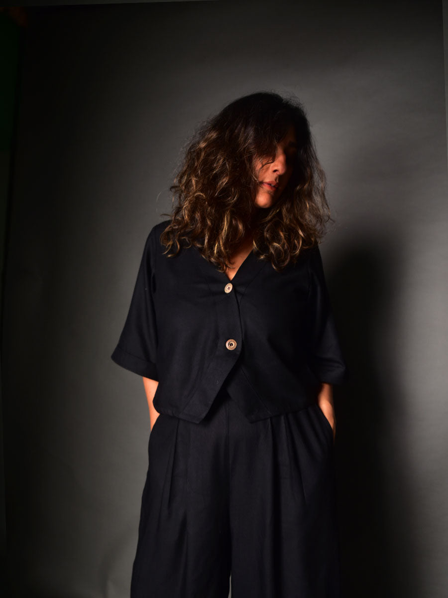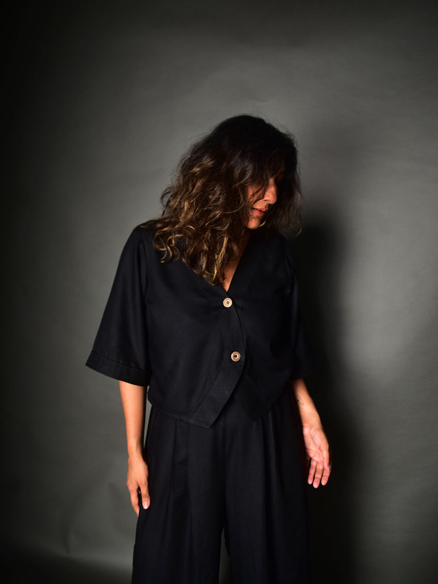 This shirt-meets-blouse is a touch of elegance for your staples. Cut in black cotton, it has flared sleeves and loose bodice. An overlapping placket in the front complete with wooden buttons. Pair with our Juno Pant for the full look.