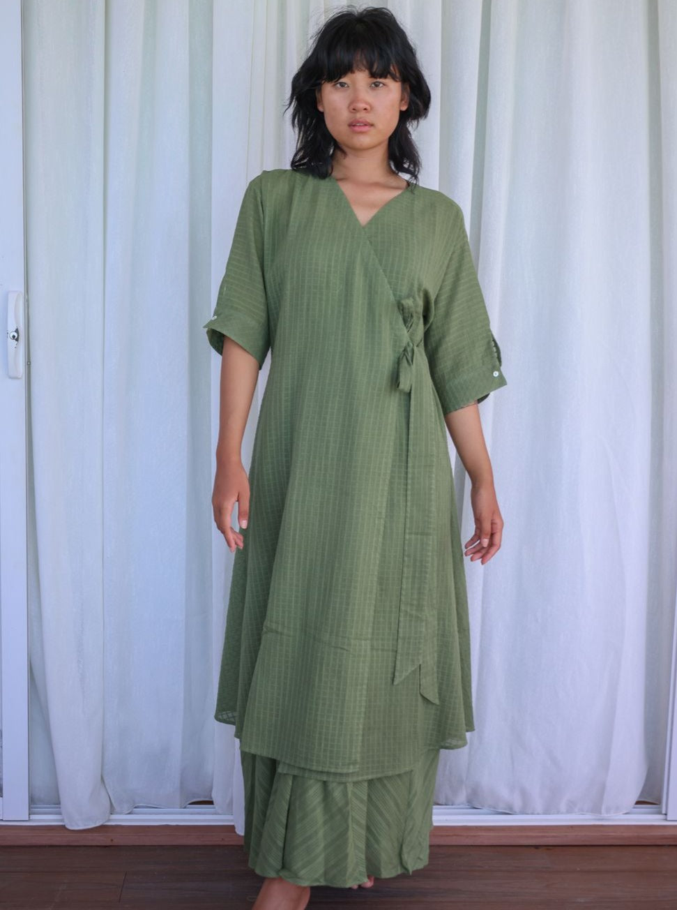 Sap green side knotted wrap slit tunic with button embellished sleeve