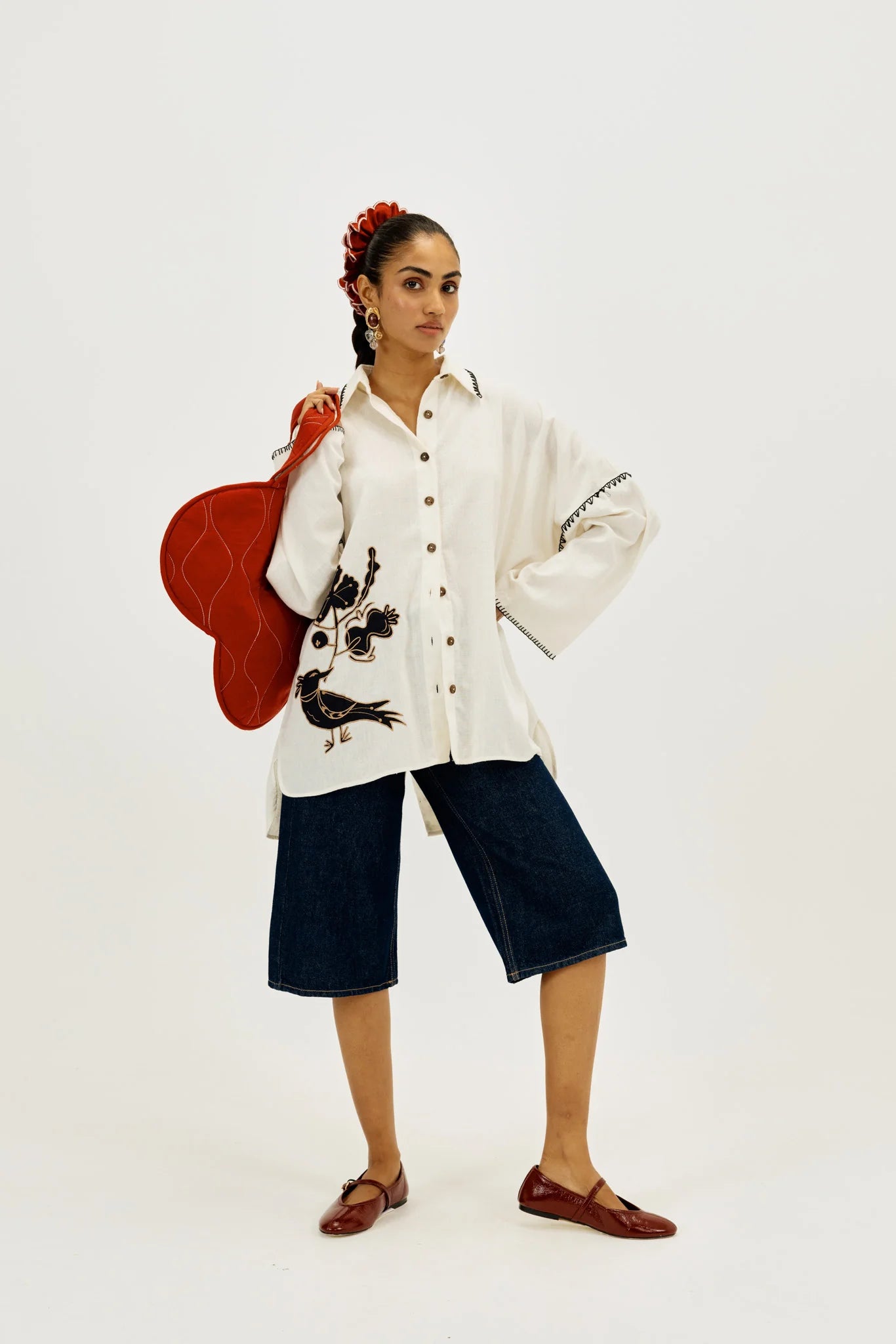 Introducing effortless drama with this oversized shirt, a staple piece with a unique twist. Made from handwoven Kala Cotton, it showcases exquisite appliqué work inspired by traditional folk motifs. The boxy silhouette features dropped shoulders and contrasting thread detailing at the cuffs, sleeves, and back, making it a striking yet easy choice for everyday wear.