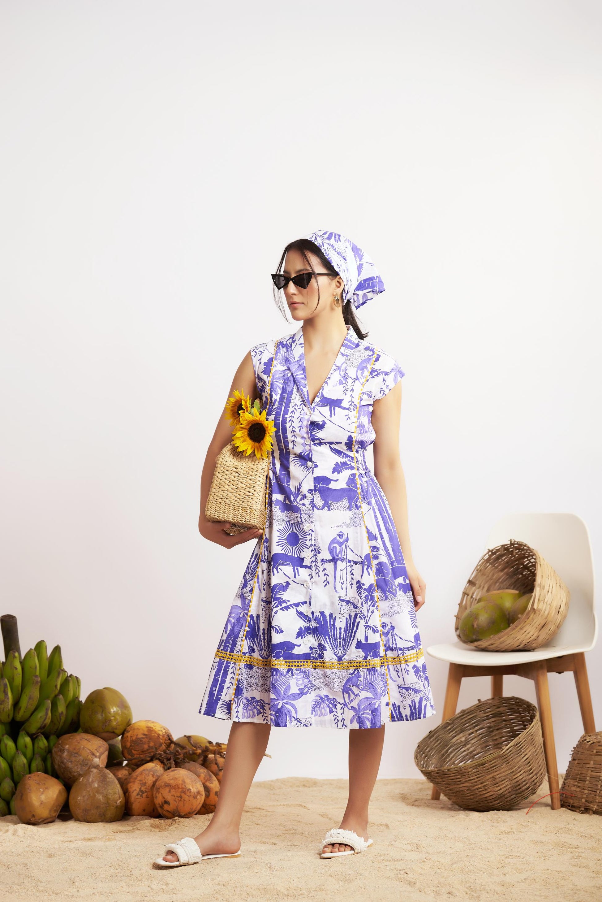 A Classic button-down cotton summer dress in jungle print is featured with lapel collar with cap sleeve with lace details at hem with relaxed and flowing silhouette. It is crafted from lightweight and breathable cotton fabric and breezy garment perfect for enjoying sunny days with style and comfort.