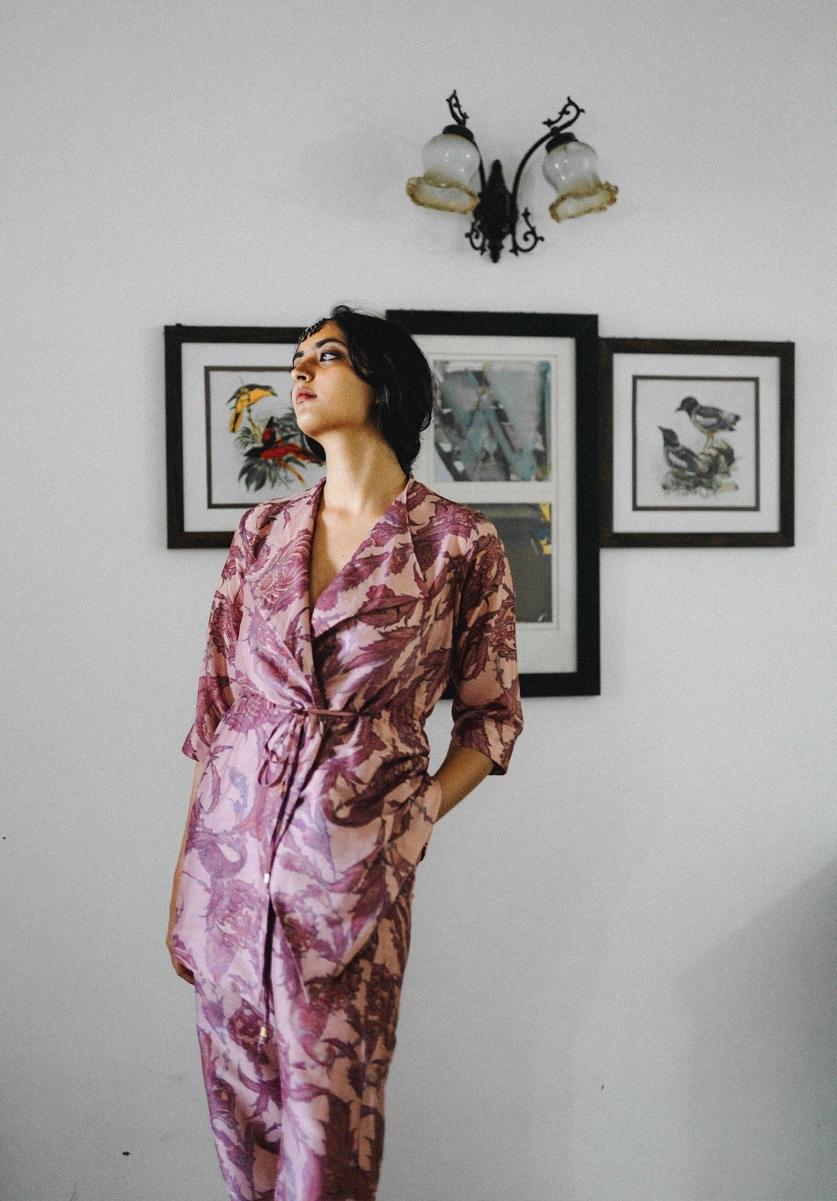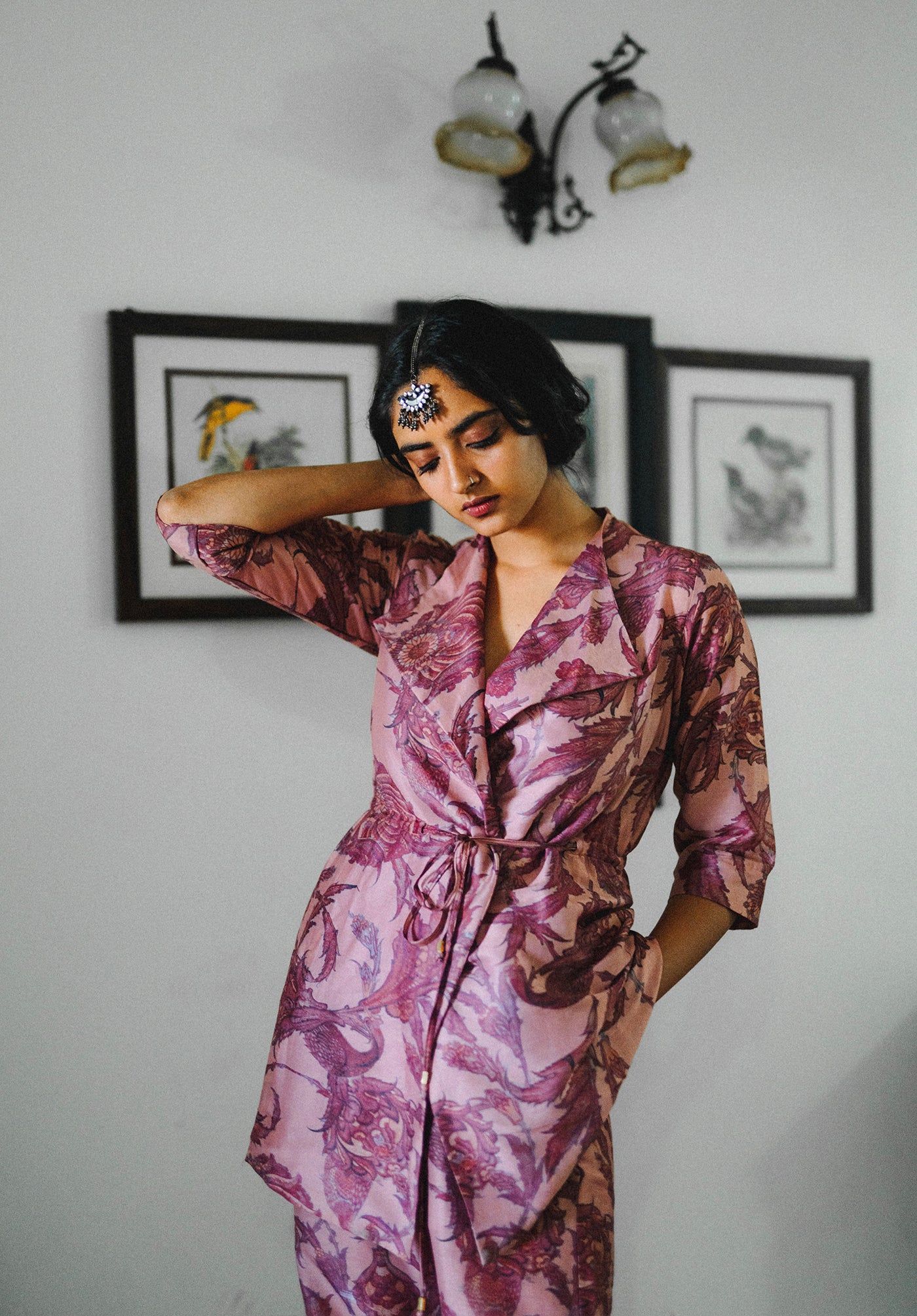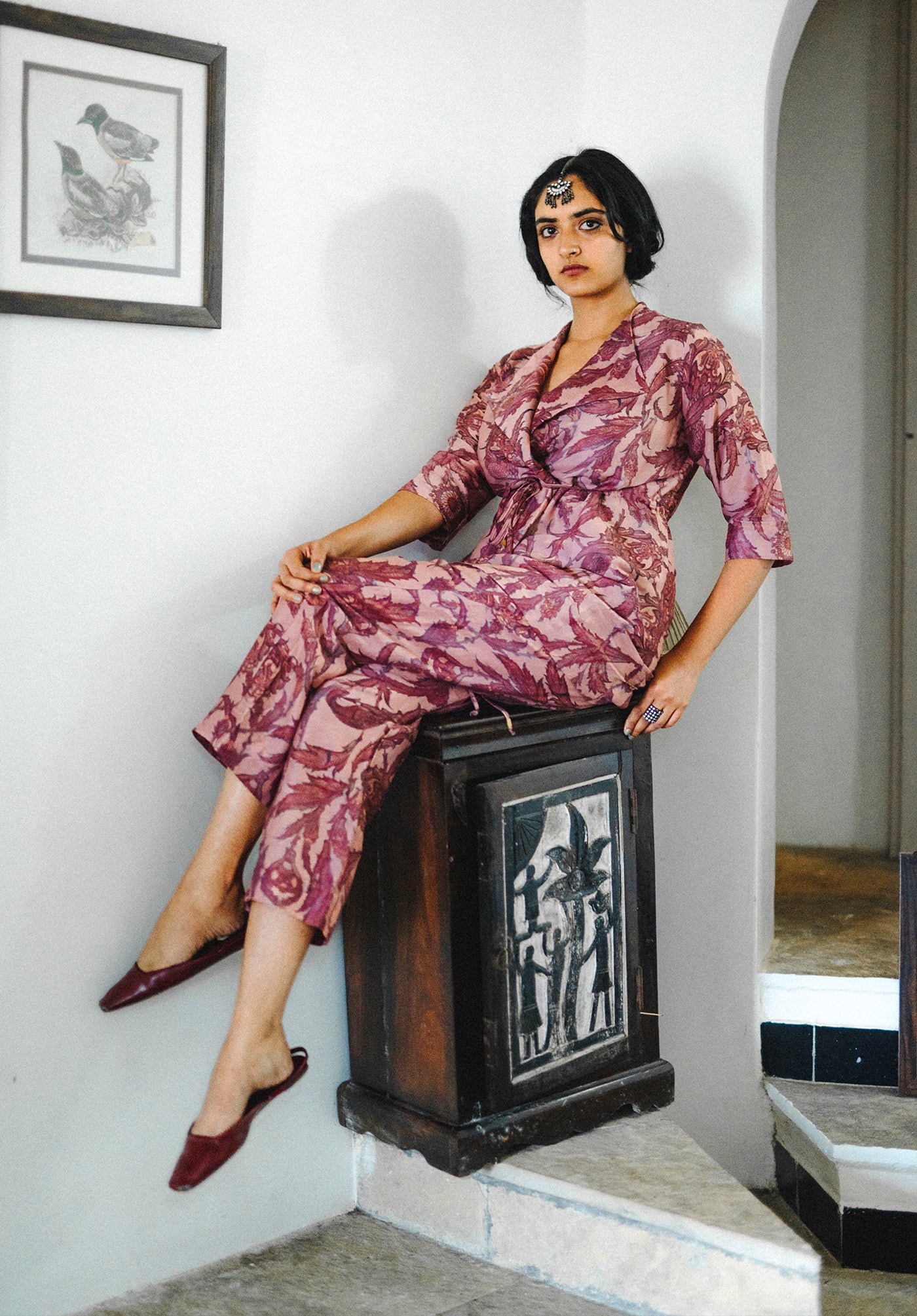 The Kefa Silk chanderi set features a highly detailed floral print from the iznik tiles of istanbul in a tonal pink color. The jacket is paired with a co-ordinate pants of the same print.