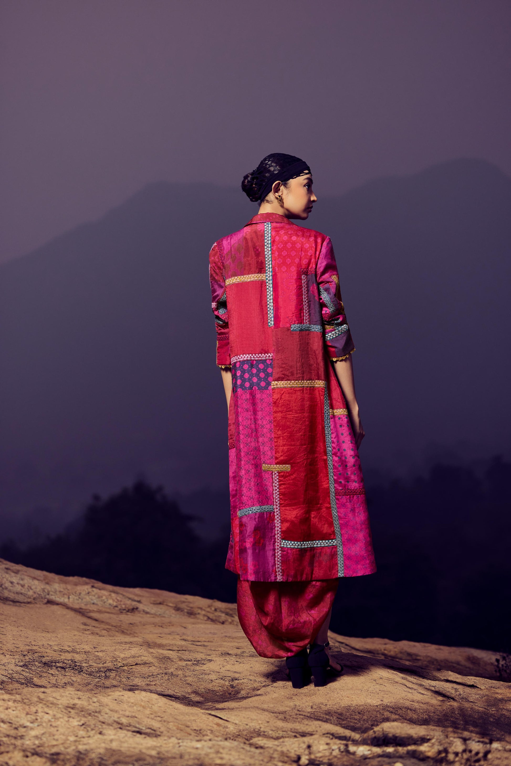 Hand woven, hand printed mulberry silk patchwork jacket in magenta/purple combination, with thread embroidery detail on front , back, and sleeves, paired with hand printed mulberry silk draped dress.