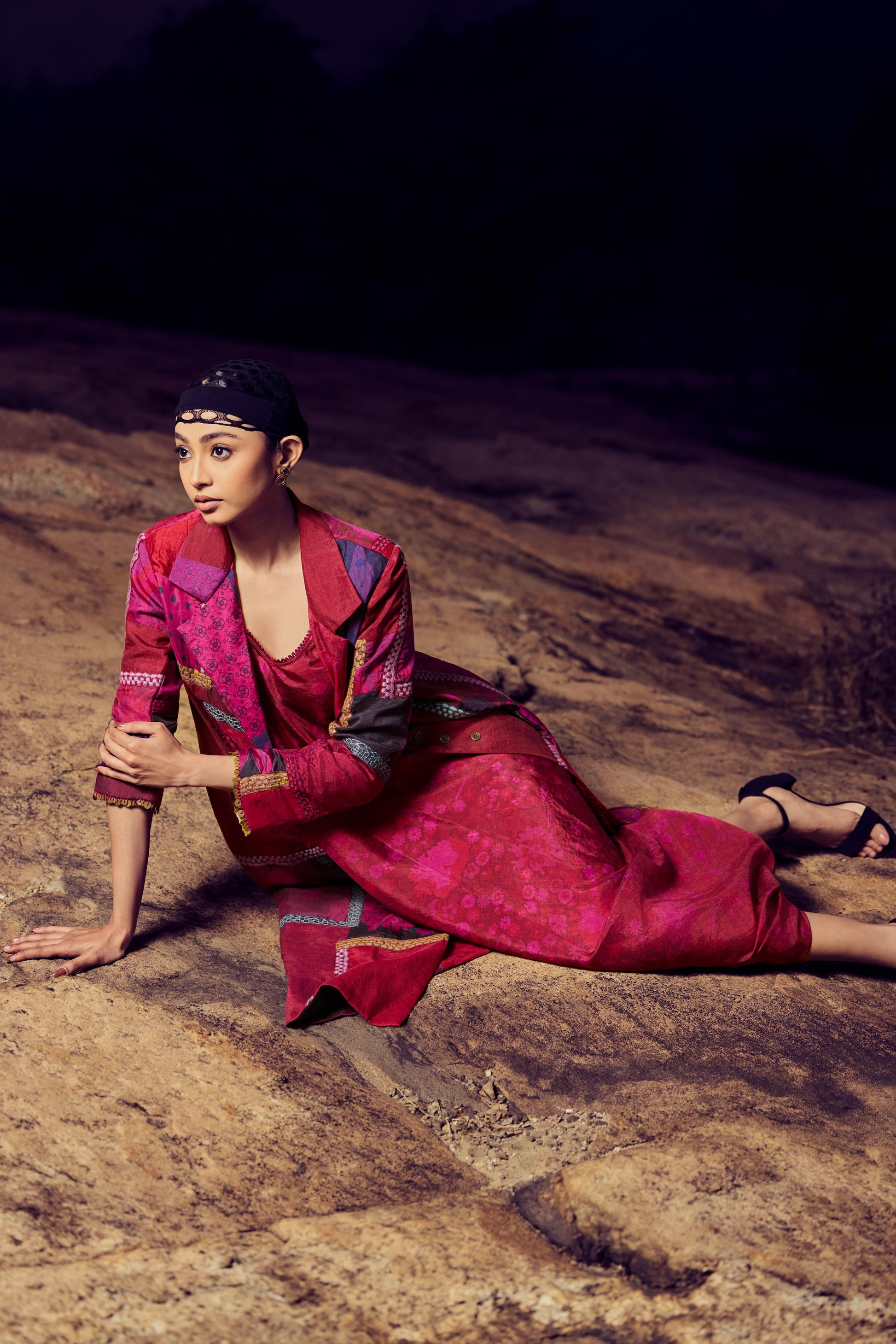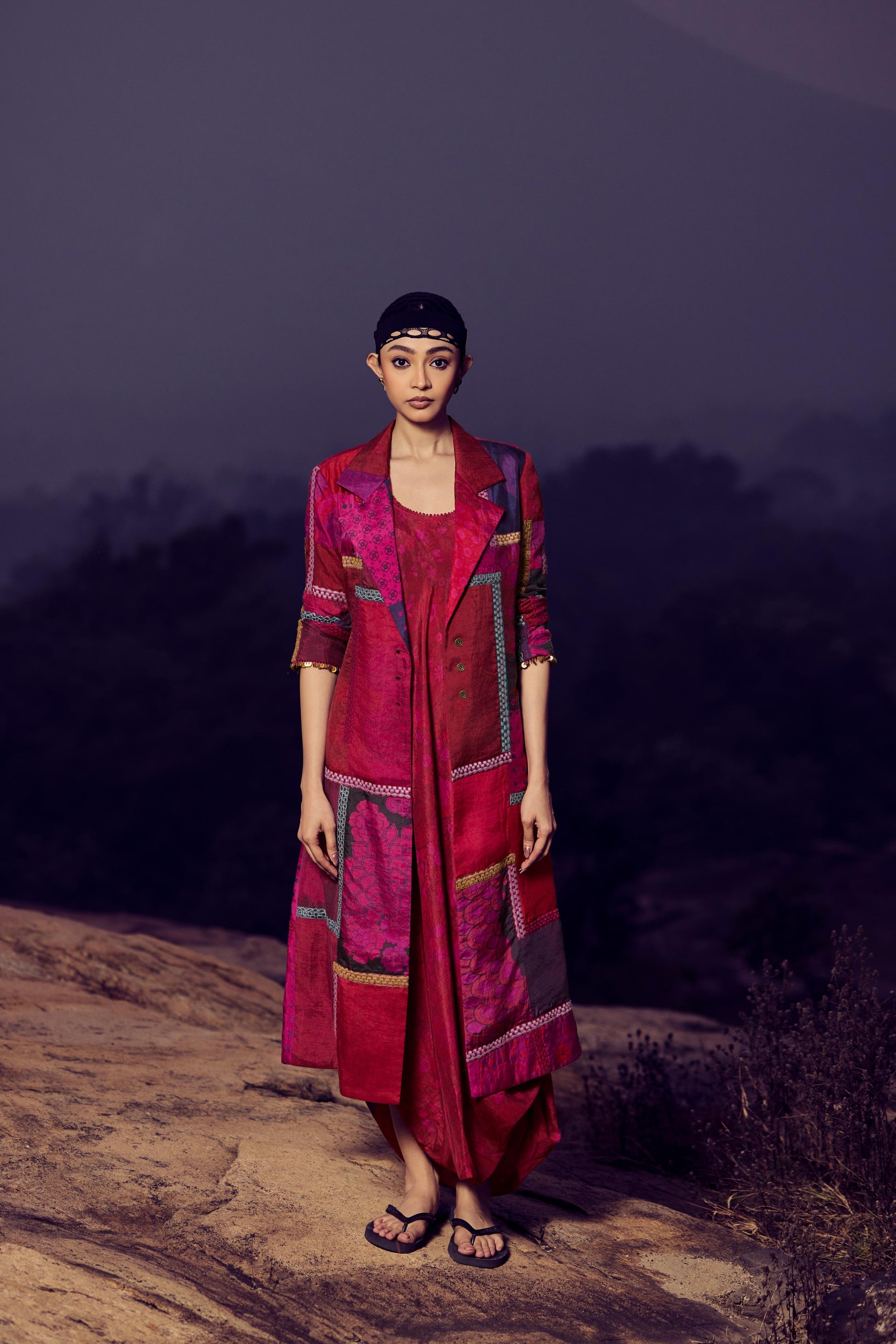 Hand woven, hand printed mulberry silk patchwork jacket in magenta/purple combination, with thread embroidery detail on front , back, and sleeves.