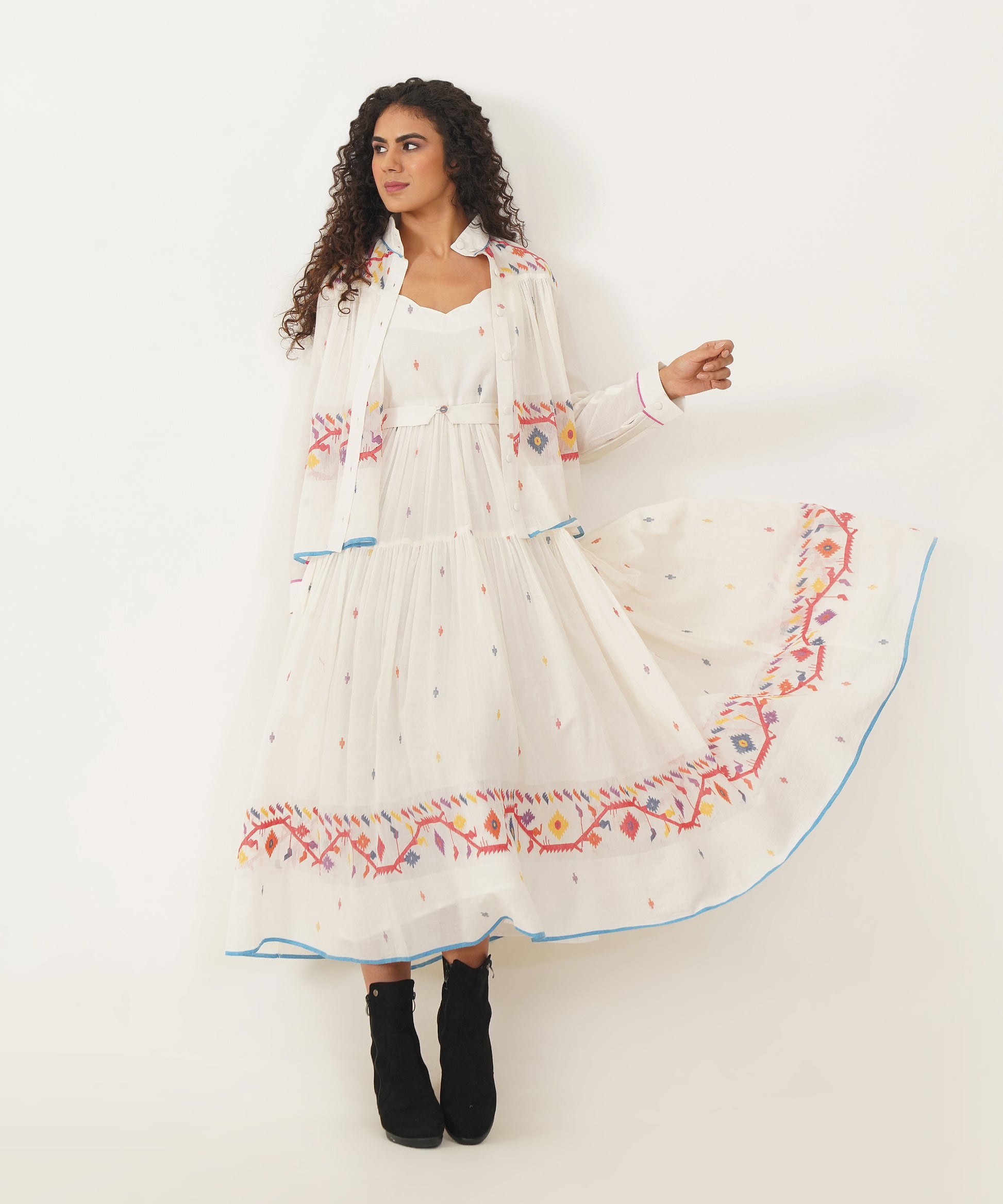 A stunning Jamdani ensemble that fuses traditional craftsmanship with modern elegance. The set features a scallop-neck dress with delicate noodle straps and soft gathers that flow gracefully. A back zipper fastening adds a sleek touch, while side pockets ensure practicality without compromising style. Accompanying the dress is a versatile high-collar Jamdani shirt that doubles as an overlay, offering endless styling possibilities. Meticulously handcrafted by Indian artisans, the ensemble is completed with a matching Jamdani belt, creating a look that is as timeless as it is refined.