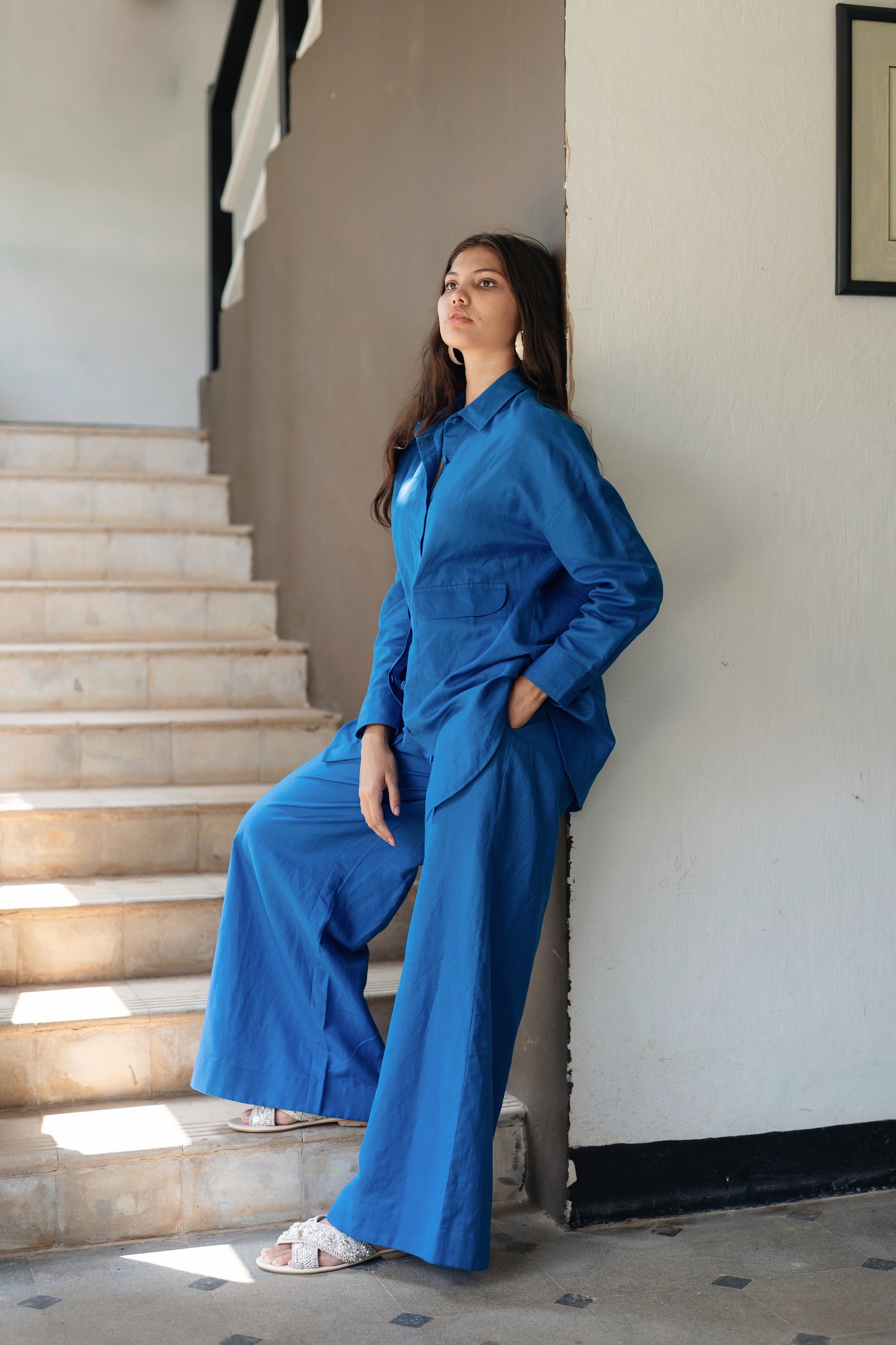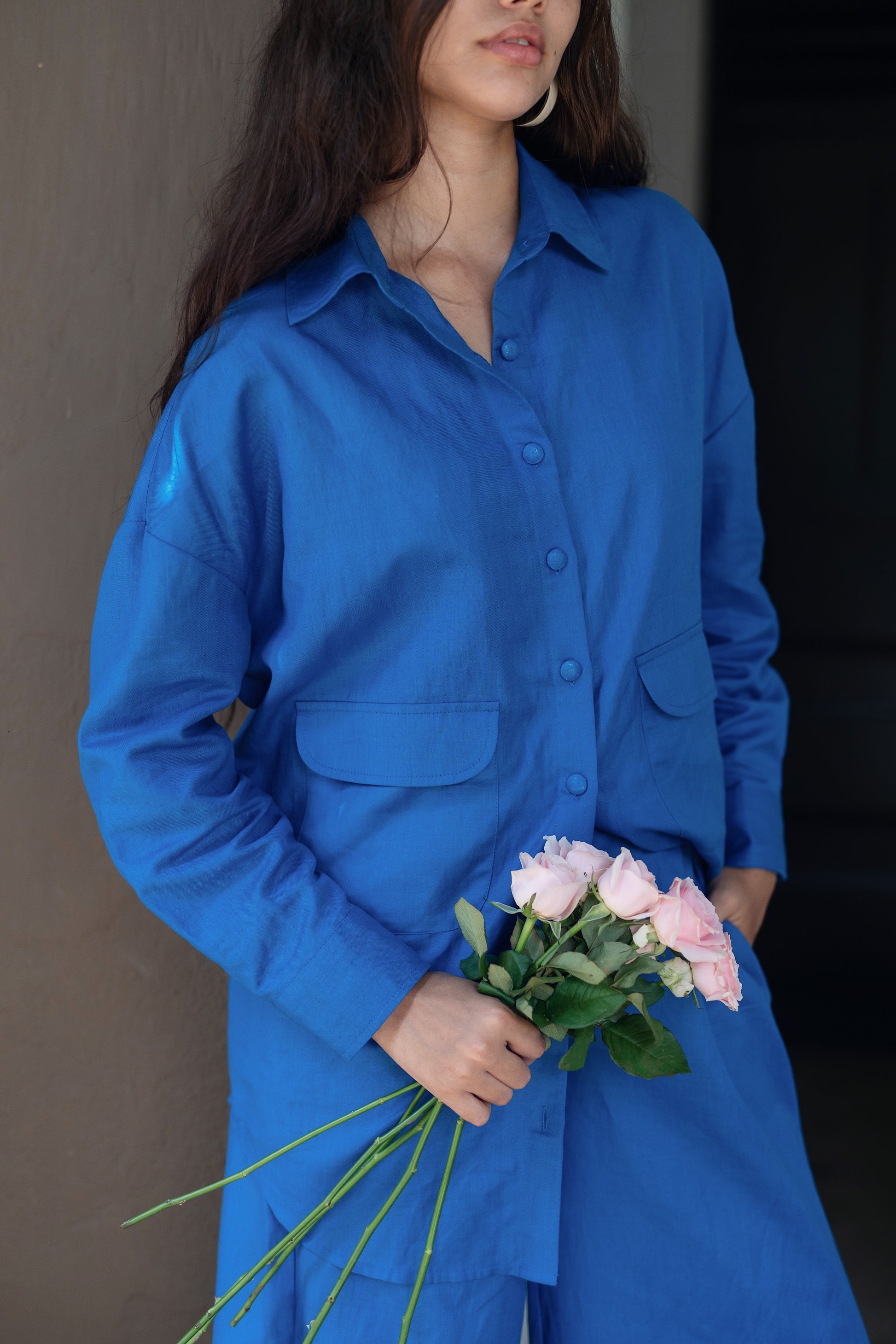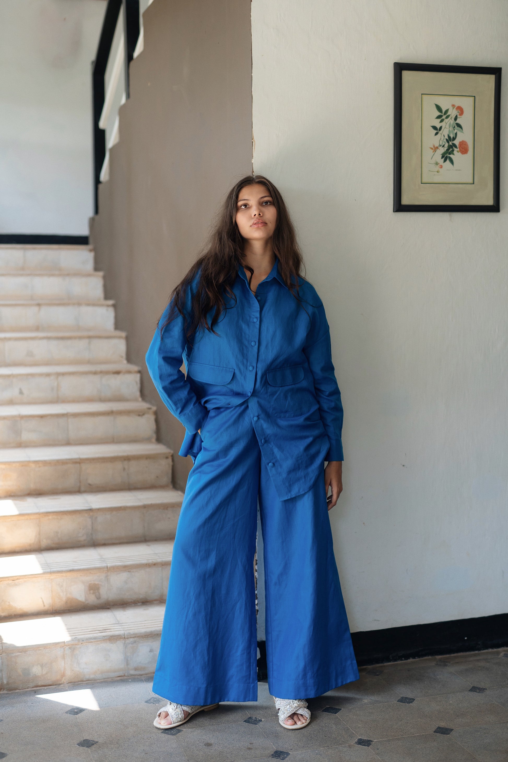 The Korea shirt set is made from our linen cotton fabrication. It has a anti fit shirt with flared pants. With giant front pockets.