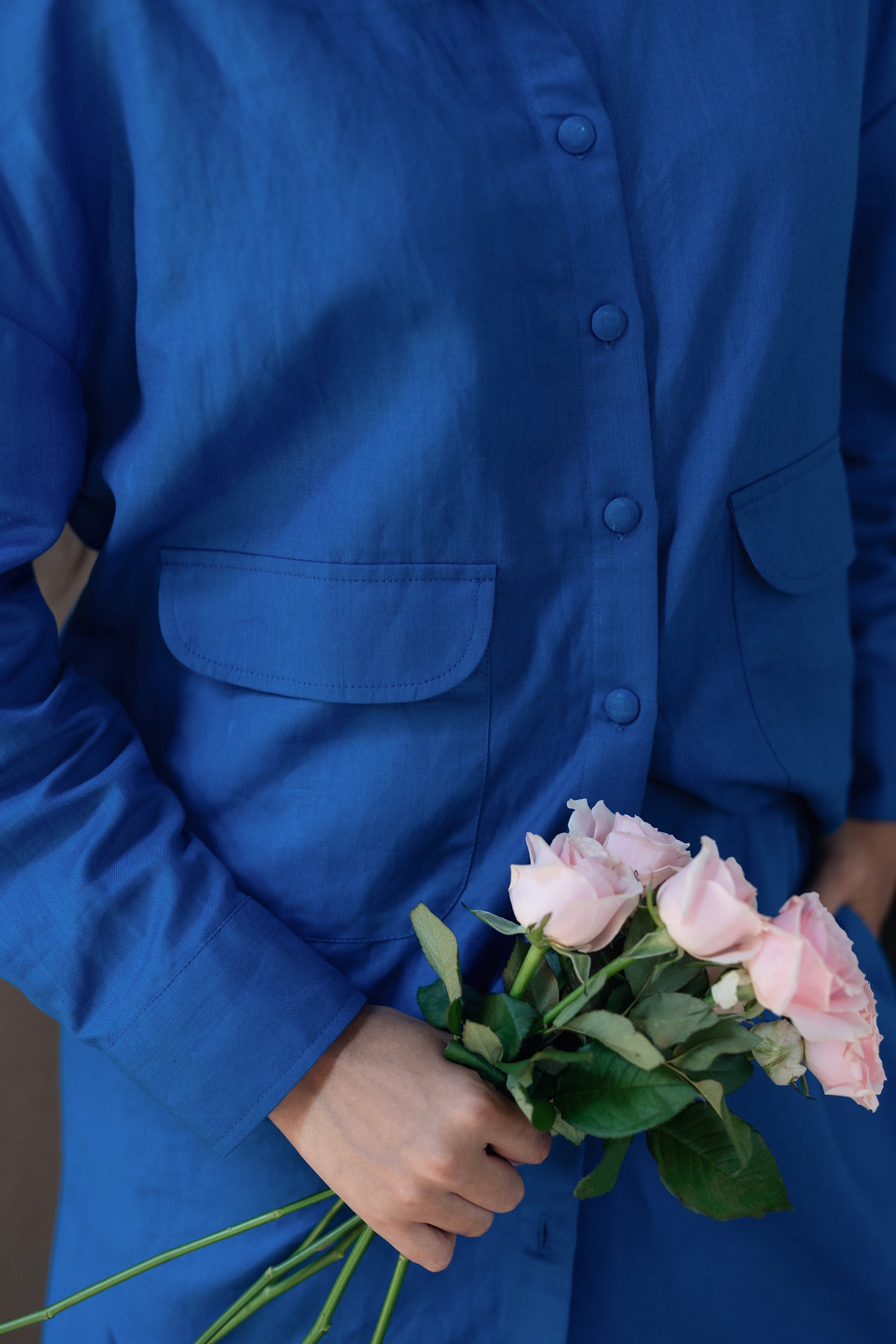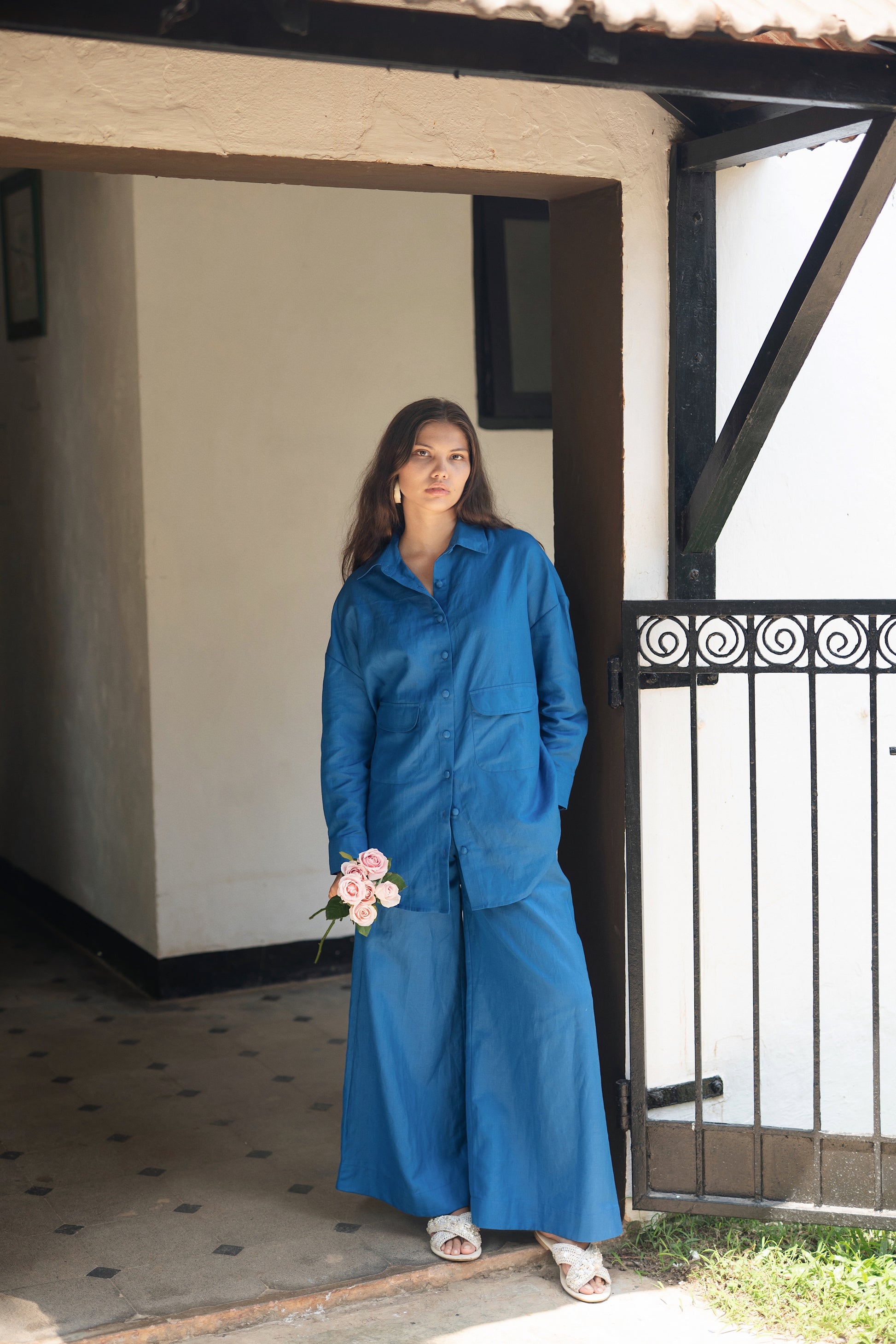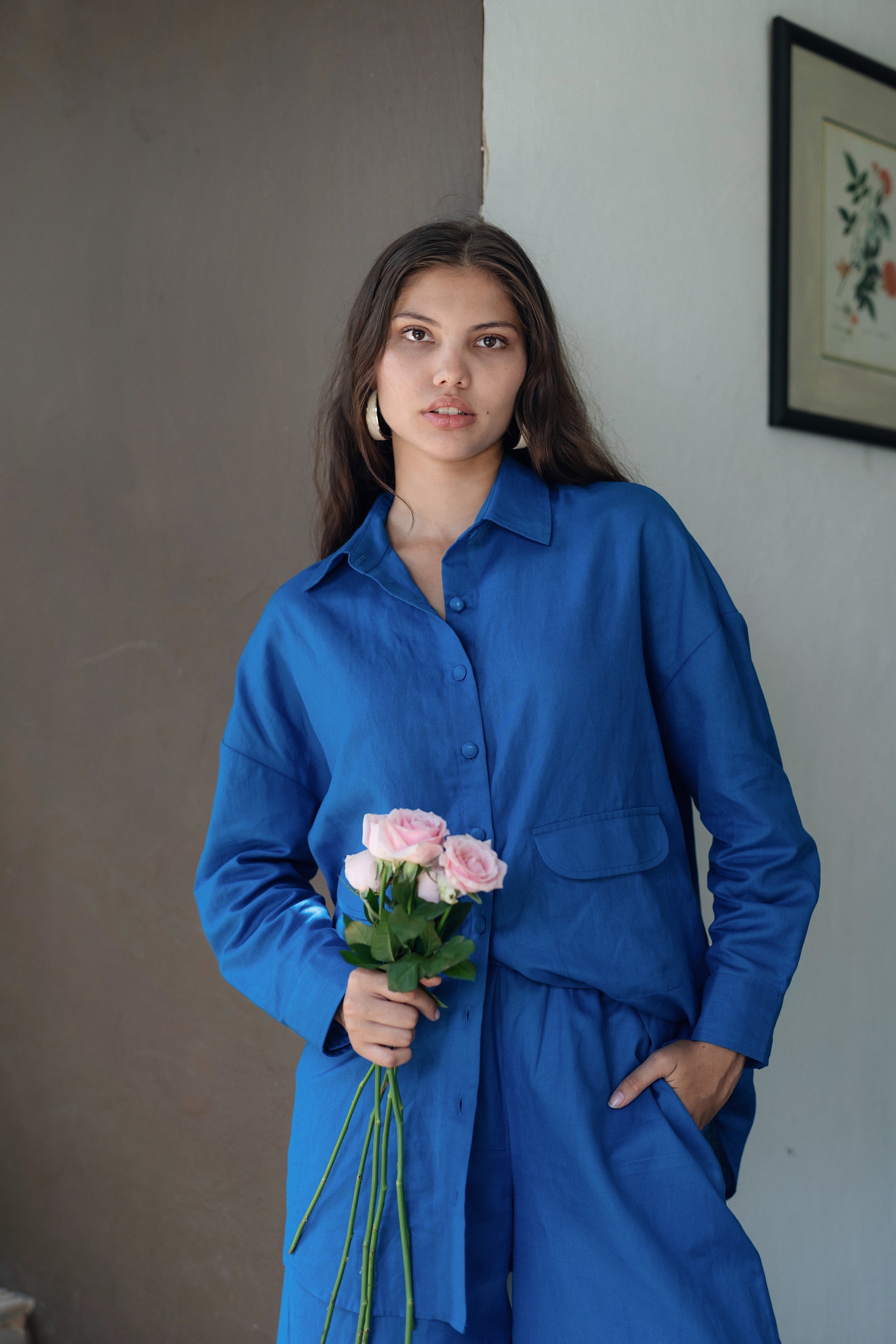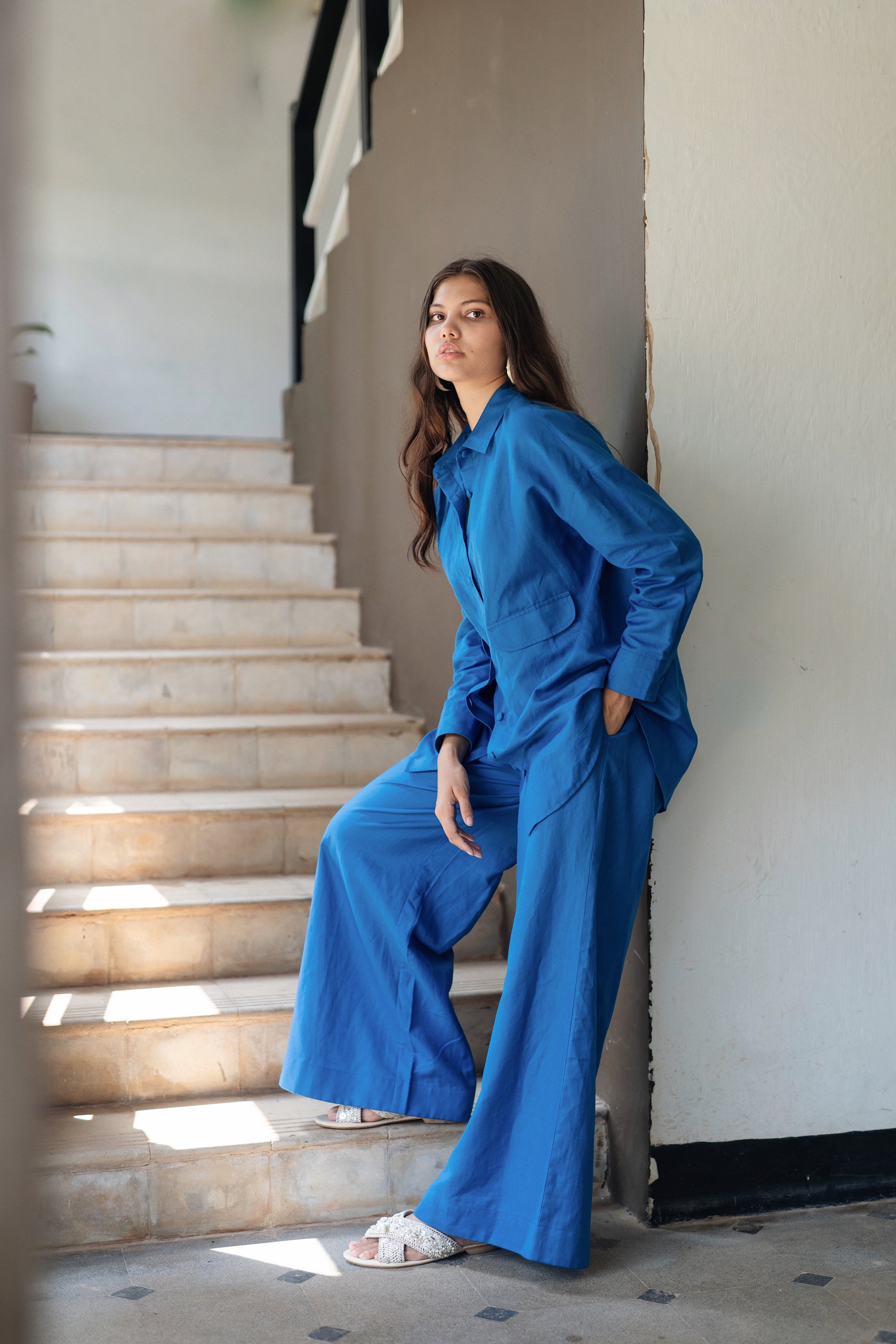 The Korea shirt set is made from our linen cotton fabrication. It has a anti fit shirt with flared pants. With giant front pockets.