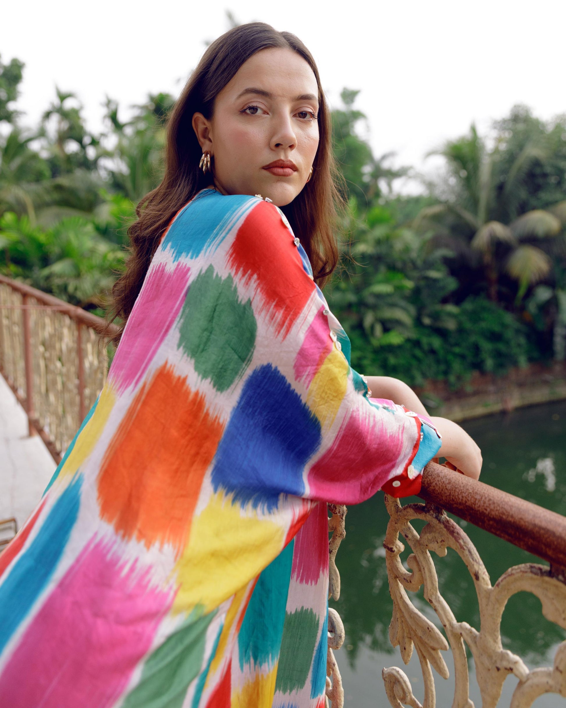 Multicolour brush stroke print, handwoven mulberry silk straight cut free size tunic dress with mother of pearl and crystal embellishment on the sides. Paired with multicolour brush stroke print, handwoven mulberry silk trouser.