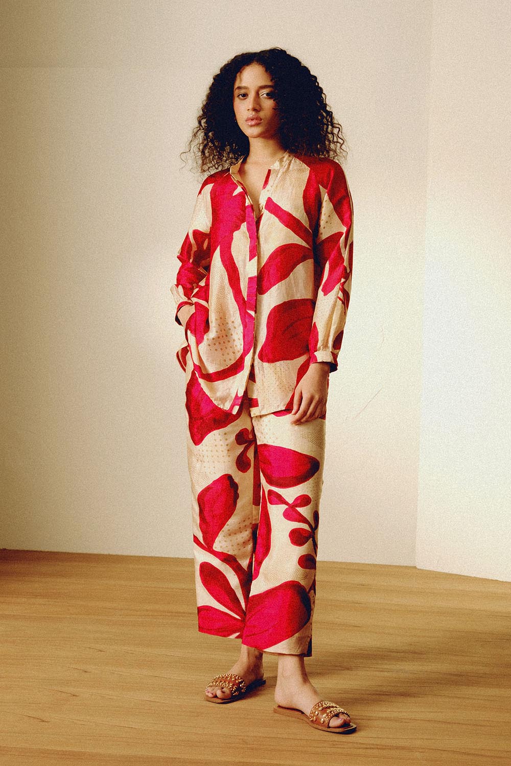 Handwoven and hand-painted mulberry silk shirt with chinese collar and raglan sleeves, Finished with bead edging. The shirt is paired with high waisted printed pants. Shirt Length- 28” Pant Length-39”