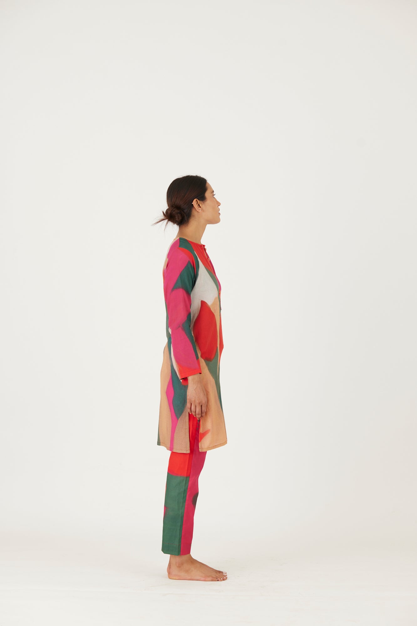 The kurta features a 2" kurta patti and threadwork on the neckline. The kurta is crafted in cotton twill and comes with complimenting pants.