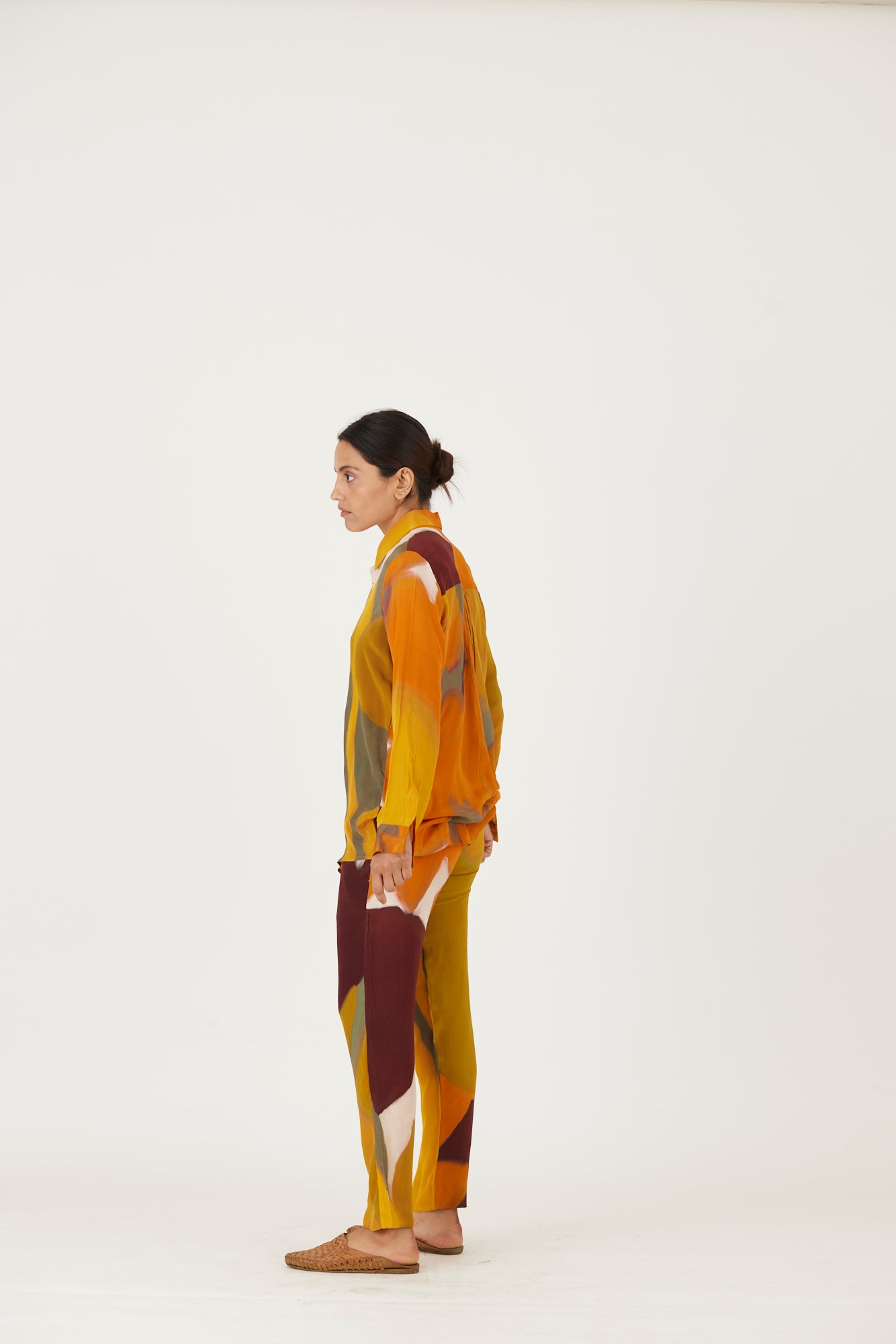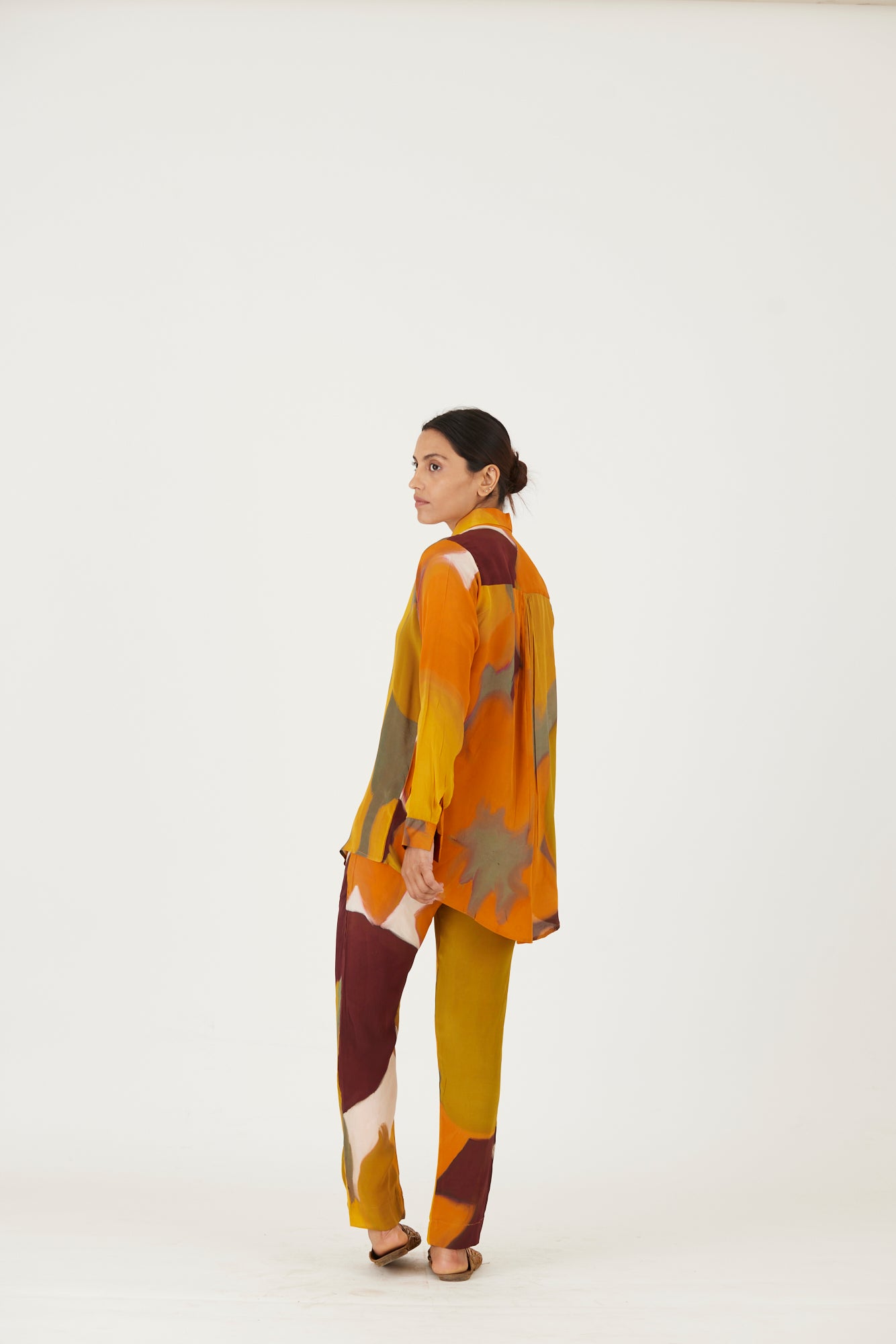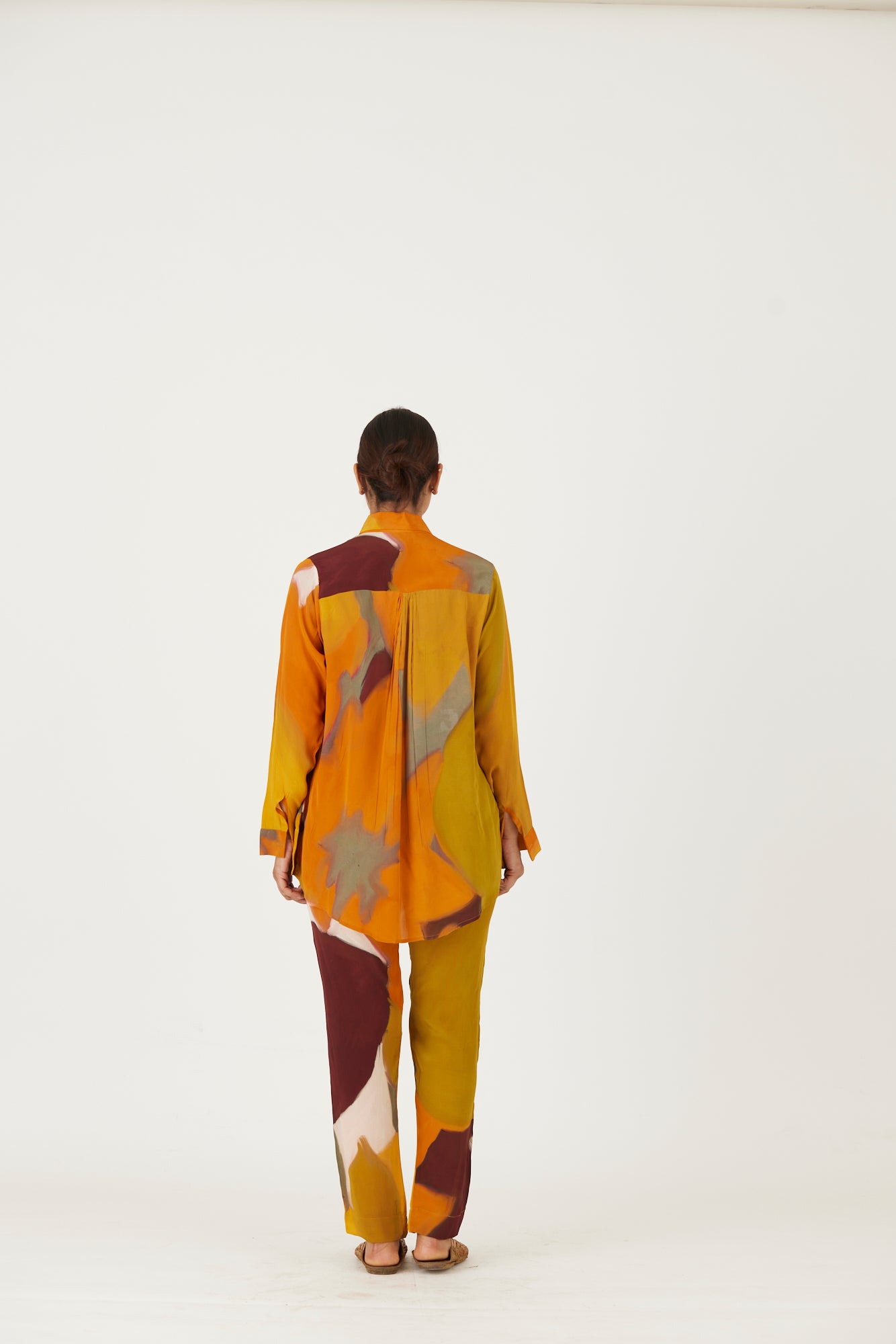 The set includes a button down shirt with back gathers and pants